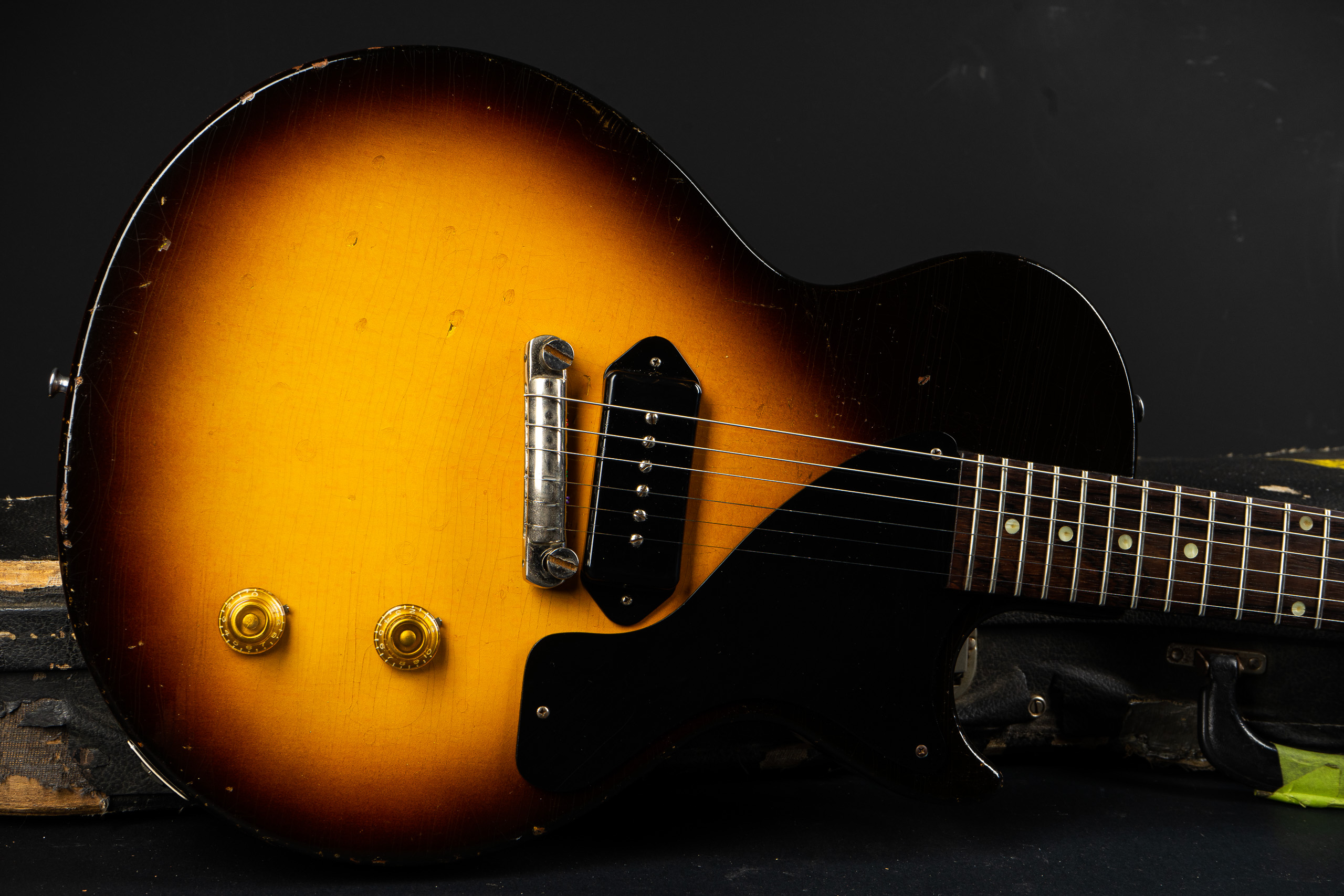 Superb sounding 1956 Gibson Les Paul Junior – all original besides a changed volume pot. There are replacement tuners installed but the originals come with the guitar. We only have single cut Juniors every once in a while and this is the perfect example – a 1956 with the corrected longer studs and that fat beefy tone! Its been played so there is the typical wear – of course… hard to put it down! Comes in newer case.