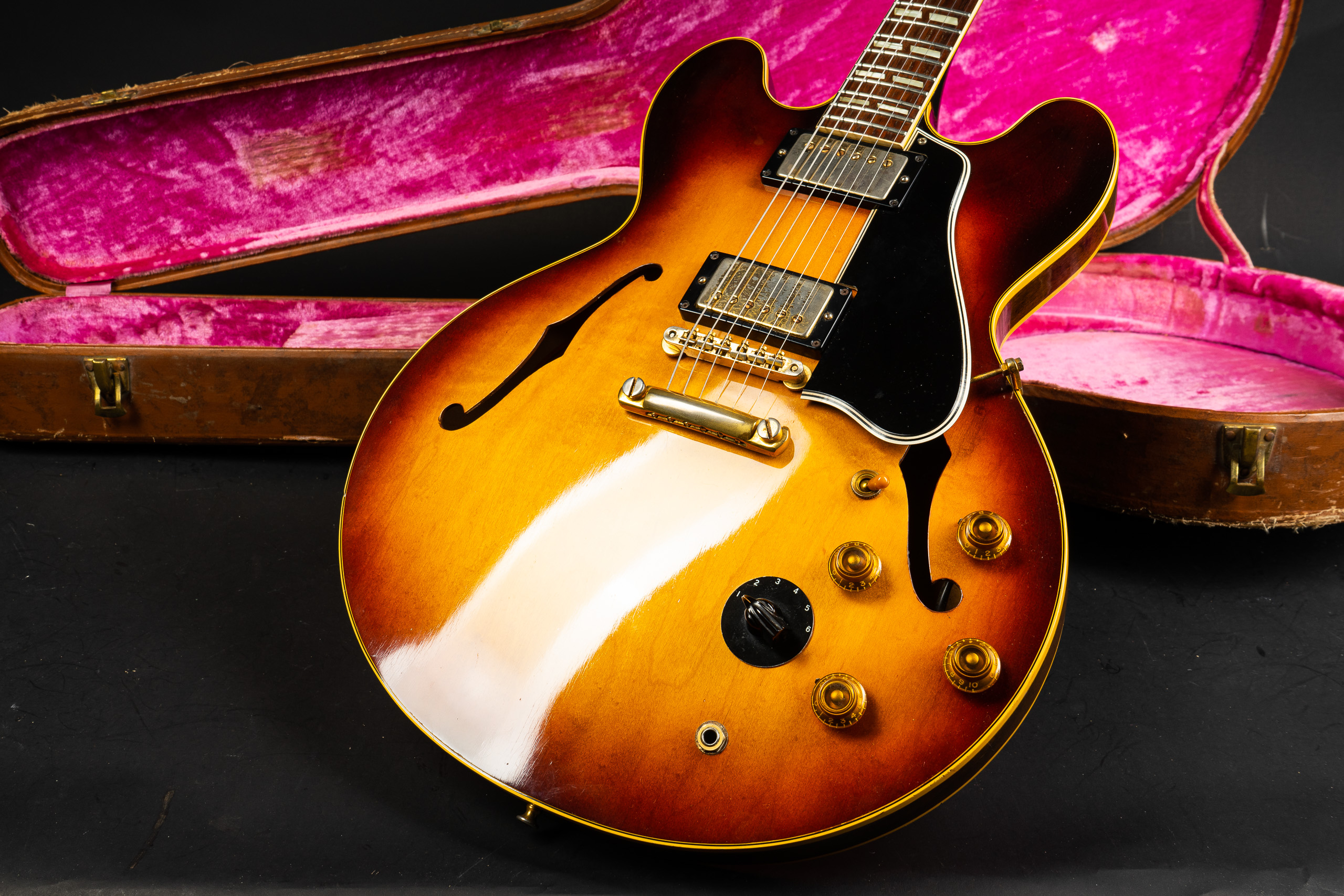 What a guitar… this all original 1959 Gibson ES-345TDSV is one of the first 345 models Gibson ever made. It still has the desirable thin top, the long pickguard and black Varitone ring. Perfect 1959 neck shape, “Mickey Mouse”-ears…and only minor playwear – it’s in excellent/exc+ condition. There is some wear on the fretboard and a few dings and dongs but the overall condition is outstanding clean. The color faded only a little bit and is still strong – very nice carving on top and back. If the 58/59 thin-top laminate 335 guitars are “Burst-Killers” – this ES-345 is right there with them. And really clean 1959 ES-335 models are already almost twice as much as this one… Comes incl. original brown Lifton case and original stereo cable!