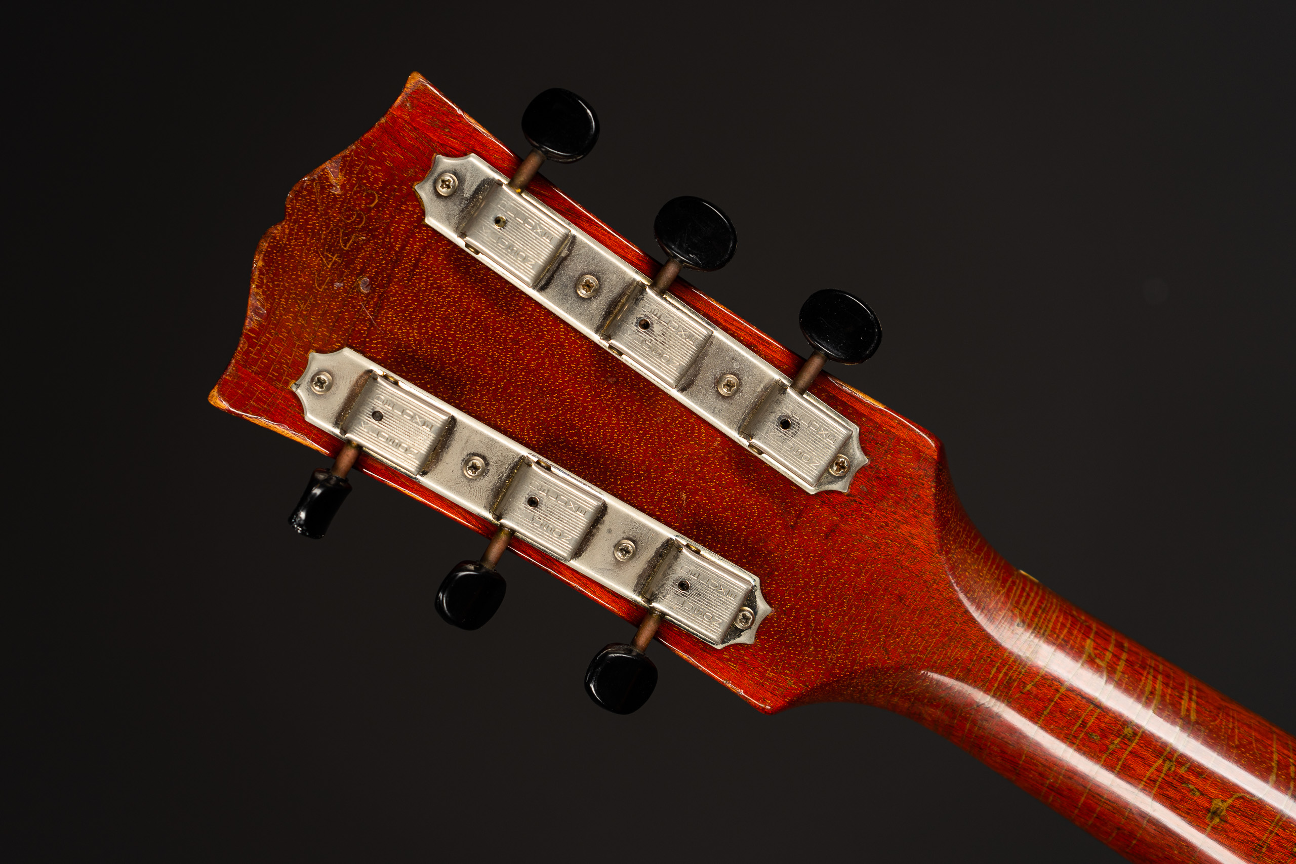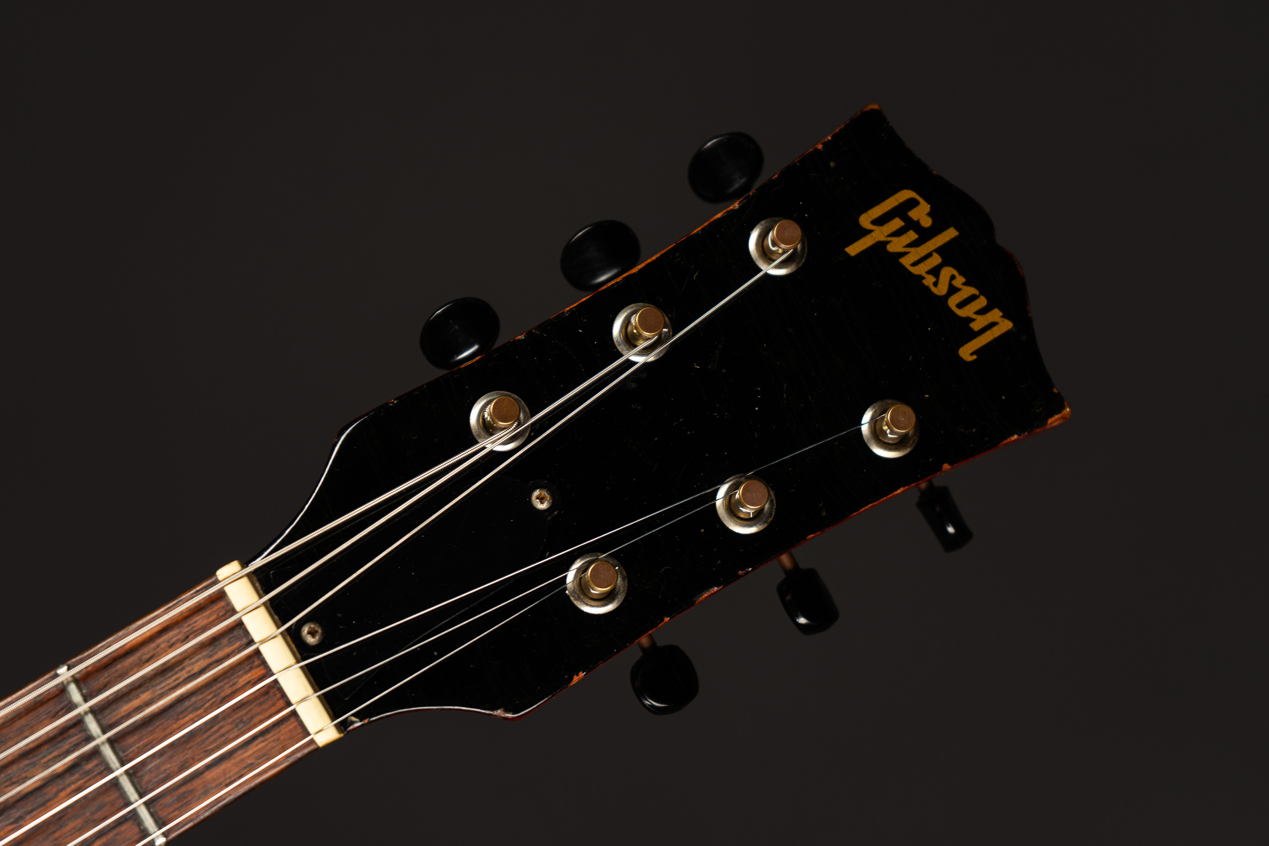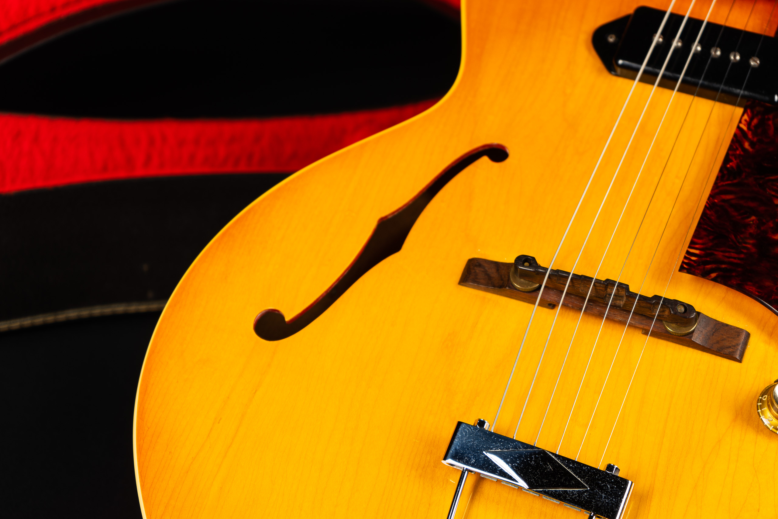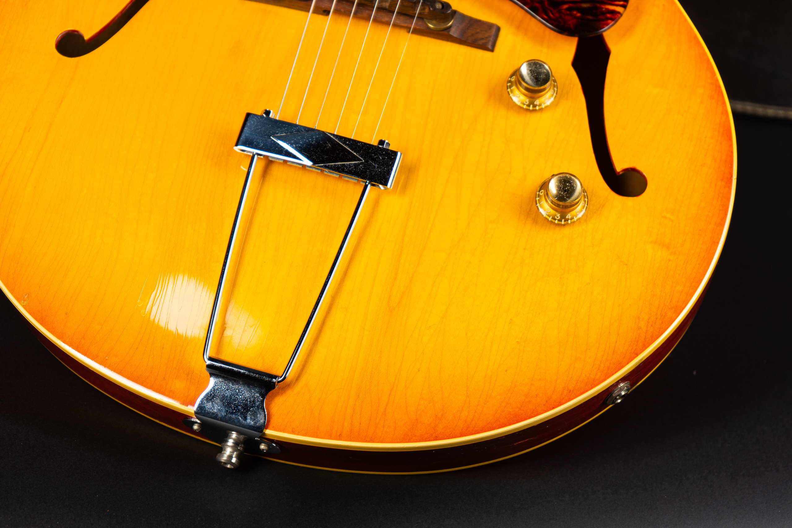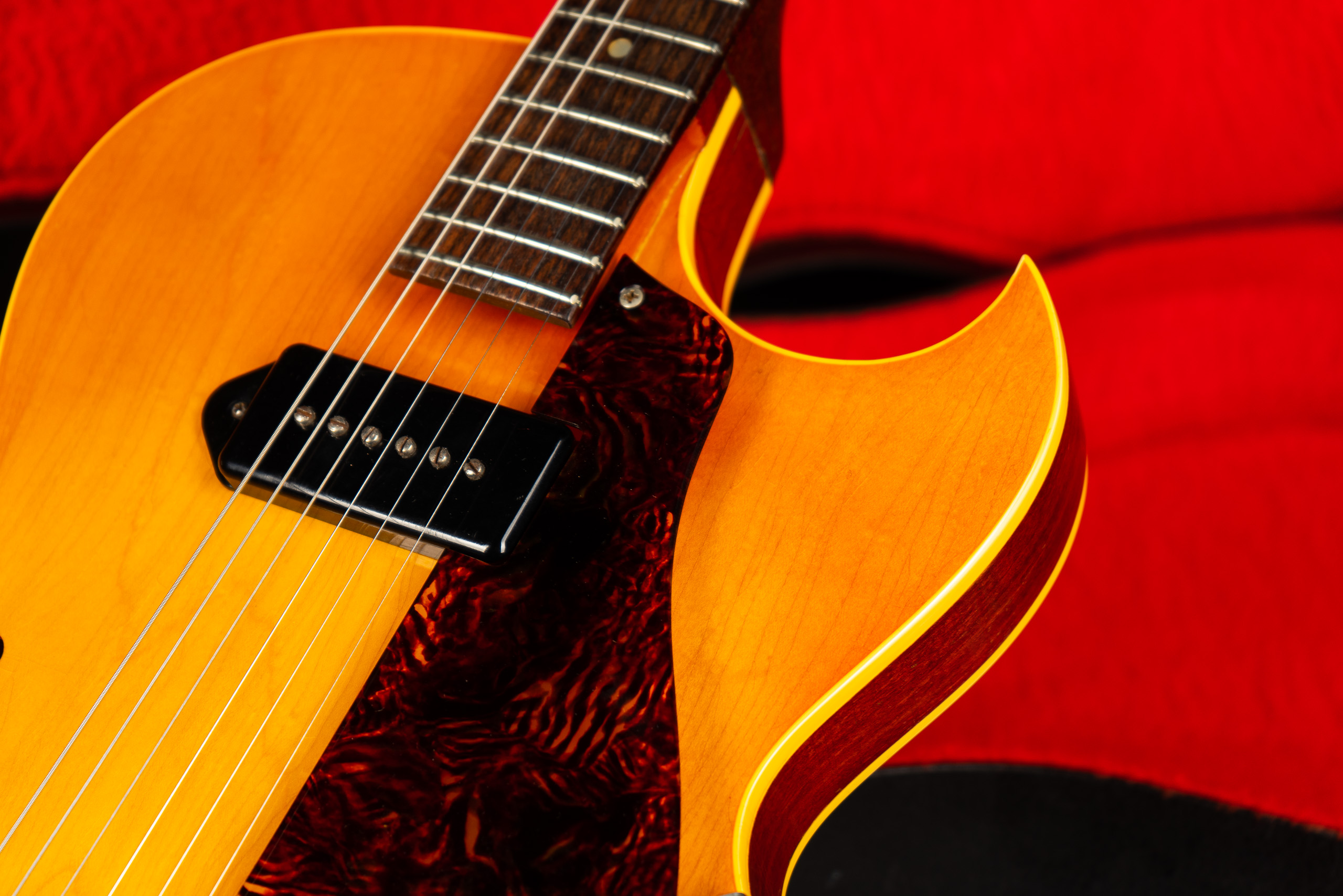 Clean 1966 Gibson ES-125T – classic model with single P90 neck pickup. The guitar has faded to a really really beautiful amber color with a hint of Sunburst left. It’s all original beside a changed tone pot. Great tone, even acoustically. Comes in it’s original Gibson soft case.