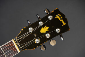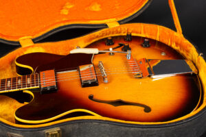 1967 Gibson ES-335TD with factory Maestro tremolo in great condition. Besides the guitar has been converted to old USA Grovers it is all original. It is covered with beautiful weather checking which makes it look and feel very very nice! It comes with a factory Maestro tremolo with makes it an even more versatile instrument. 65-69 Gibson ES models are really going up in value, since they are wonderful instruments with basically the same features as the a lot higher priced pre 65 guitars and just have a little narrower nut width. The original patent number pickups measure 7,62K(B) and 7,21K(N) and the pots are dated 137.67.2x. The weight is 4,02K. Comes incl. original black case with yellow plush.