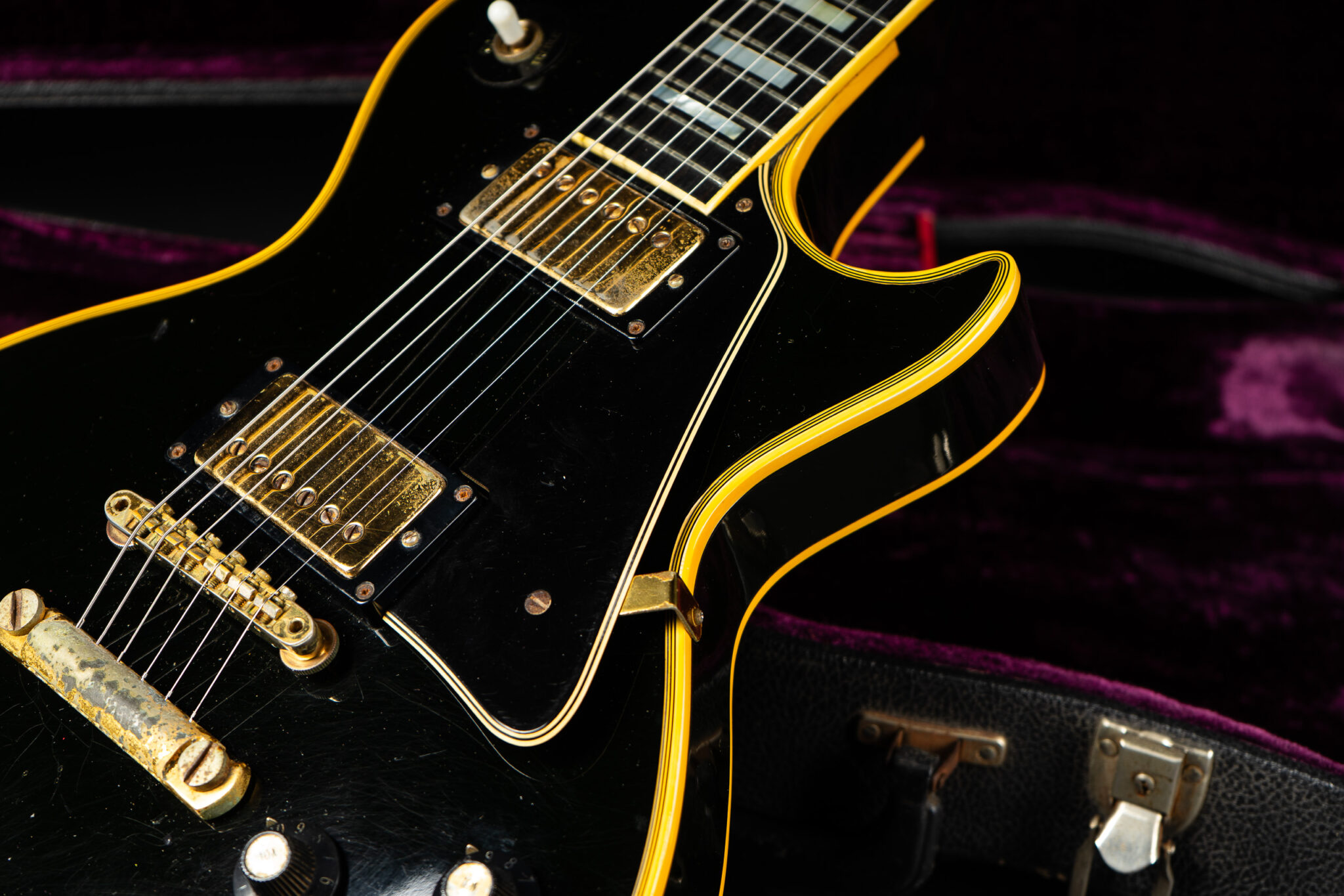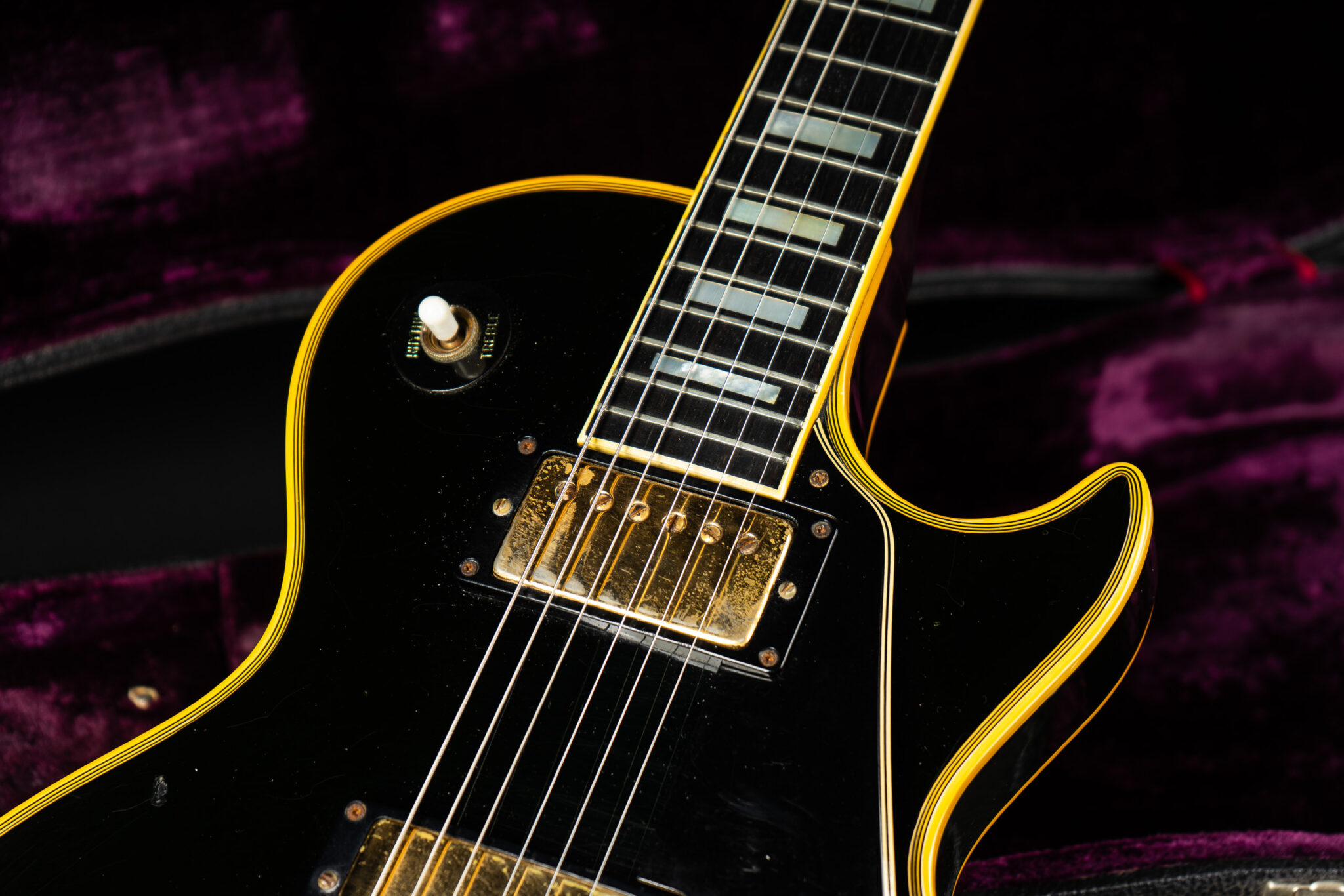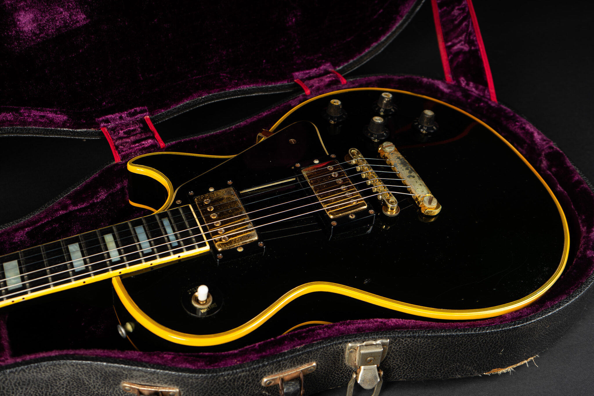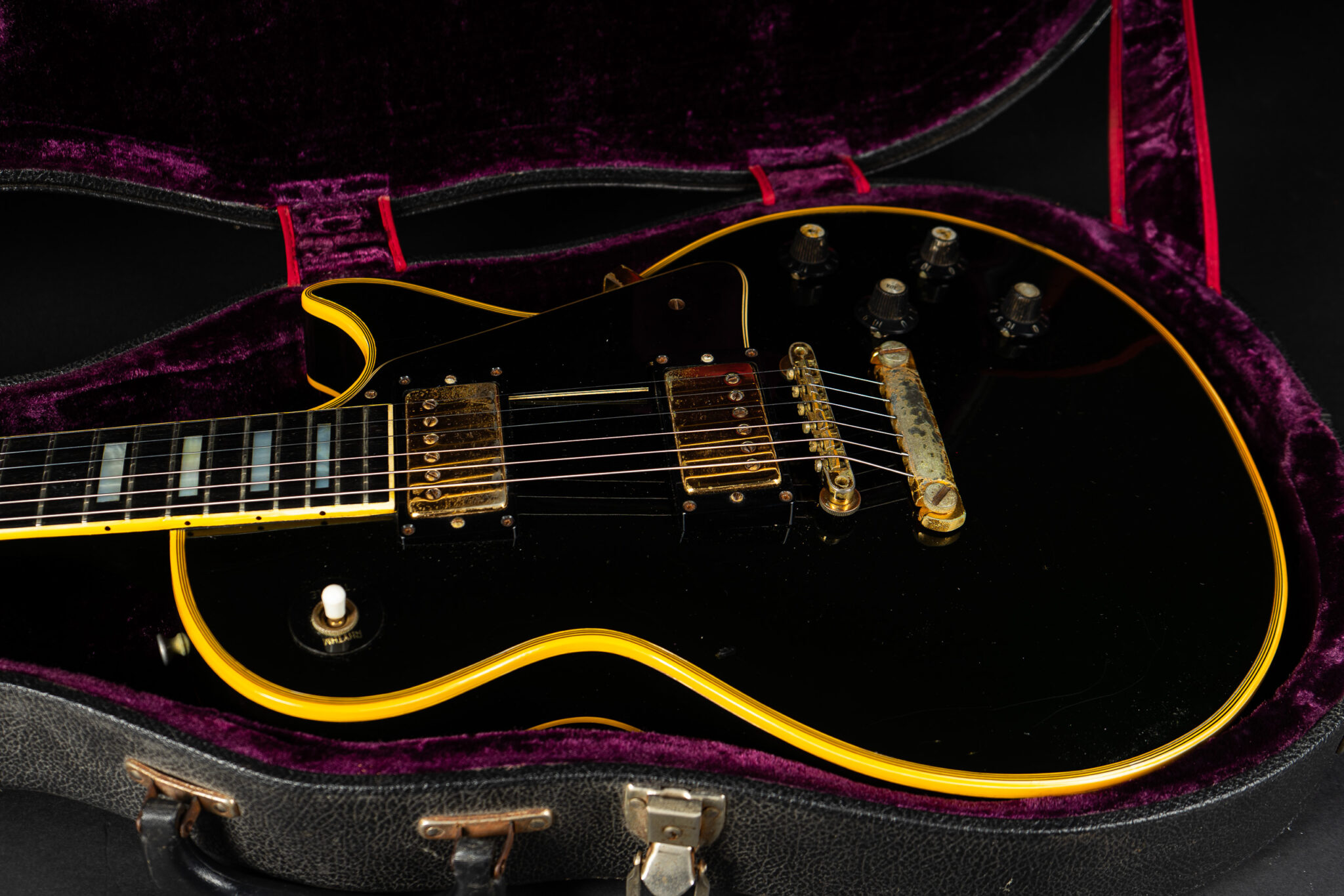 Wonderful example of a 1969 Gibson Les Paul Custom Black Beauty. It is the three-piece neck one-piece body version. Beautiful finish, no oversprays or repairs. All original guitar – besides it once had different tuners (the original waffle back tuners are back on), the jack plate is metal which is a good thing and the pickup covers had been off – thats it. The pickup rings are still M69s. The stoptail is a short seam lightweight aluminum. Nice full neck profile! The frets have almost zero life left so we are going to refret the guitar with Jescar 51100 wire. Comes incl. original case with purple plush!