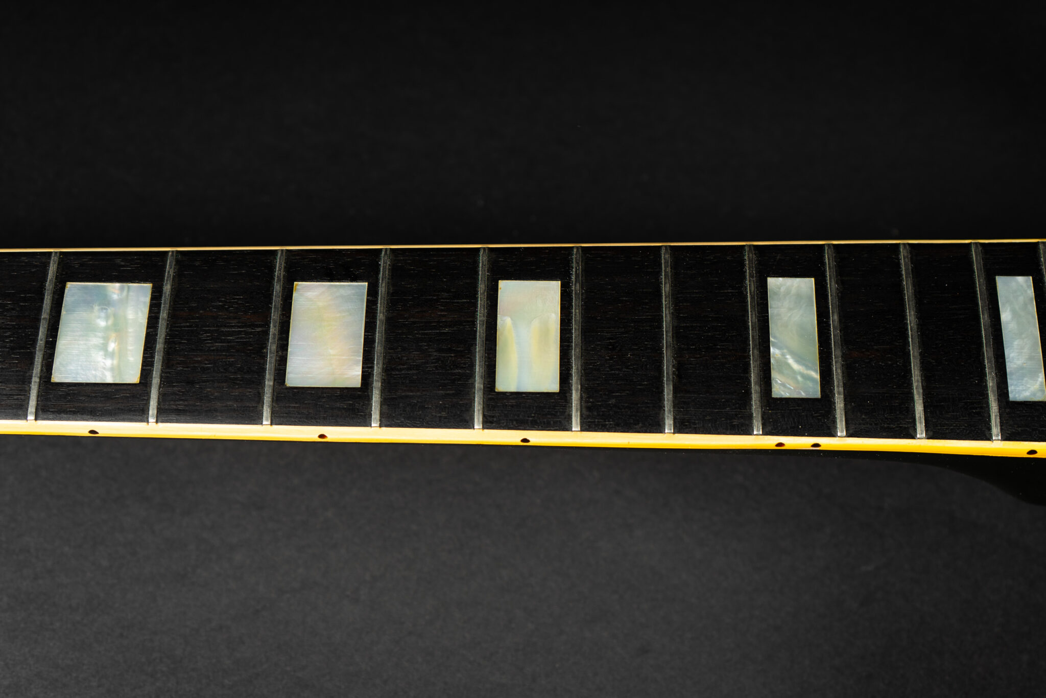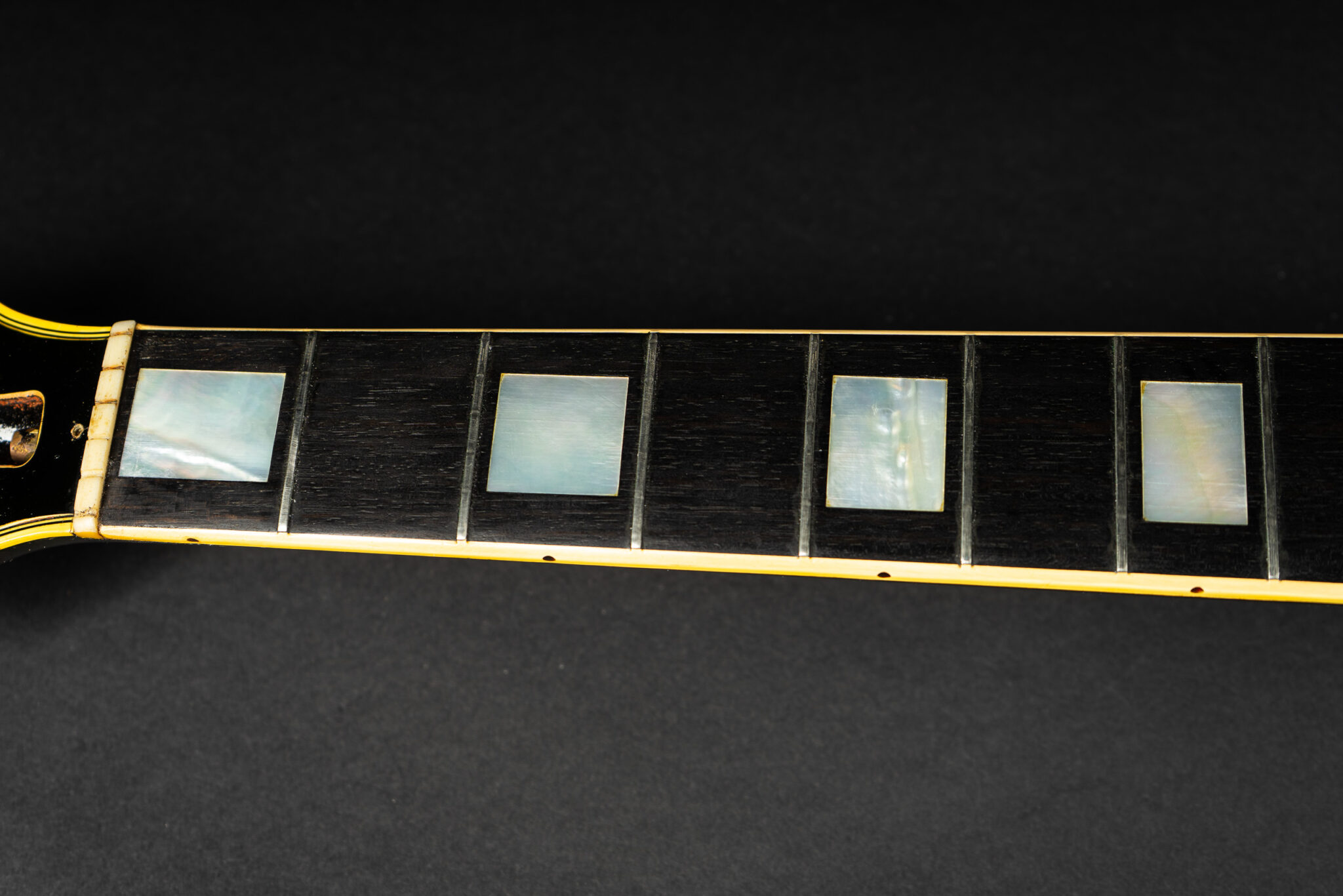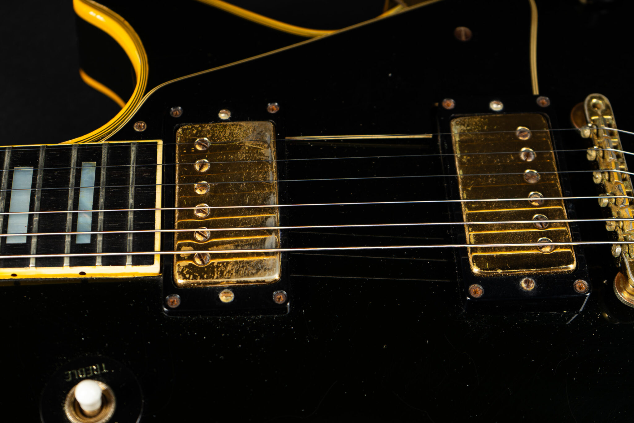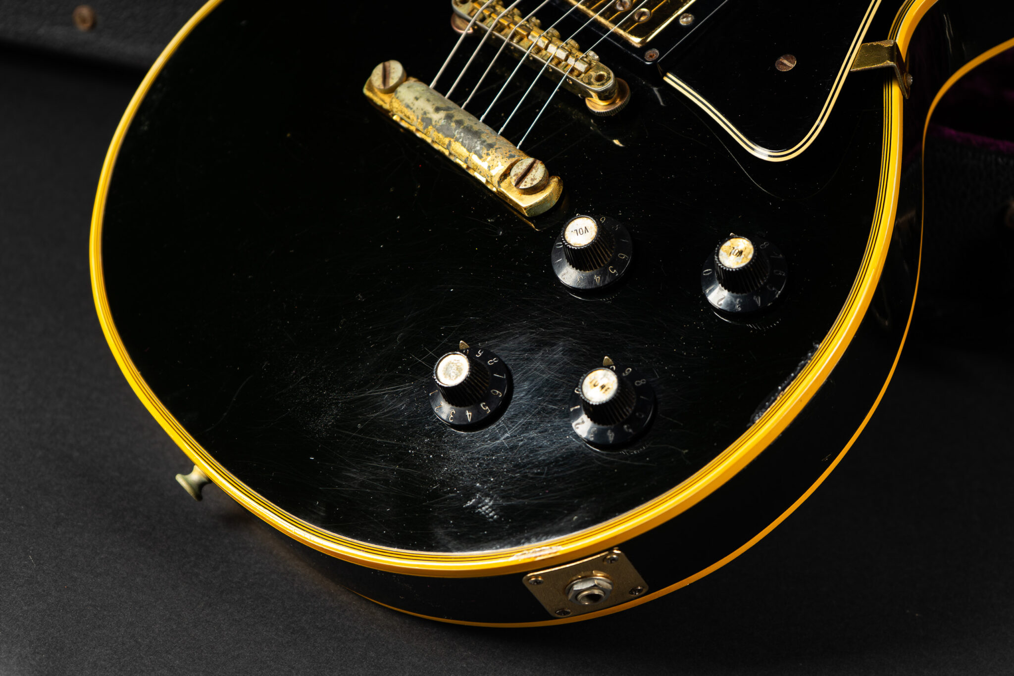 Wonderful example of a 1969 Gibson Les Paul Custom Black Beauty. It is the three-piece neck one-piece body version. Beautiful finish, no oversprays or repairs. All original guitar – besides it once had different tuners (the original waffle back tuners are back on), the jack plate is metal which is a good thing and the pickup covers had been off – thats it. The pickup rings are still M69s. The stoptail is a short seam lightweight aluminum. Nice full neck profile! The frets have almost zero life left so we are going to refret the guitar with Jescar 51100 wire. Comes incl. original case with purple plush!
