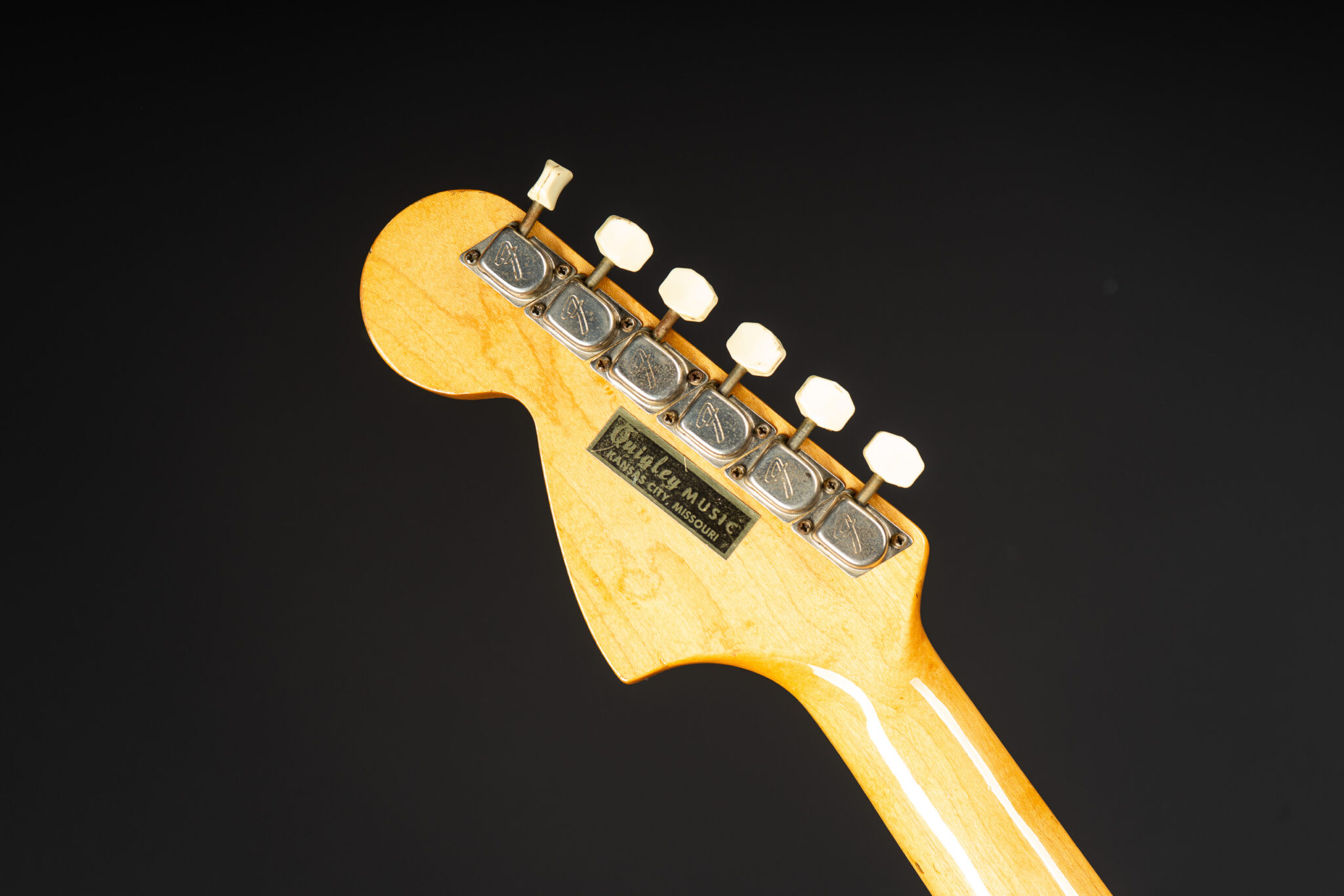 1970 Fender Mustang in Competition Burgundy with matching headstock! The Kurt Cobain Smells like Teen Spirit guitar… Super cool, second year. Nicely faded Burgundy finish with competition stripes, pickups and pots are dated 1970. Plays great with low action and comes incl. original case. Tremolo arm is missing – like on 99% of all Mustangs.