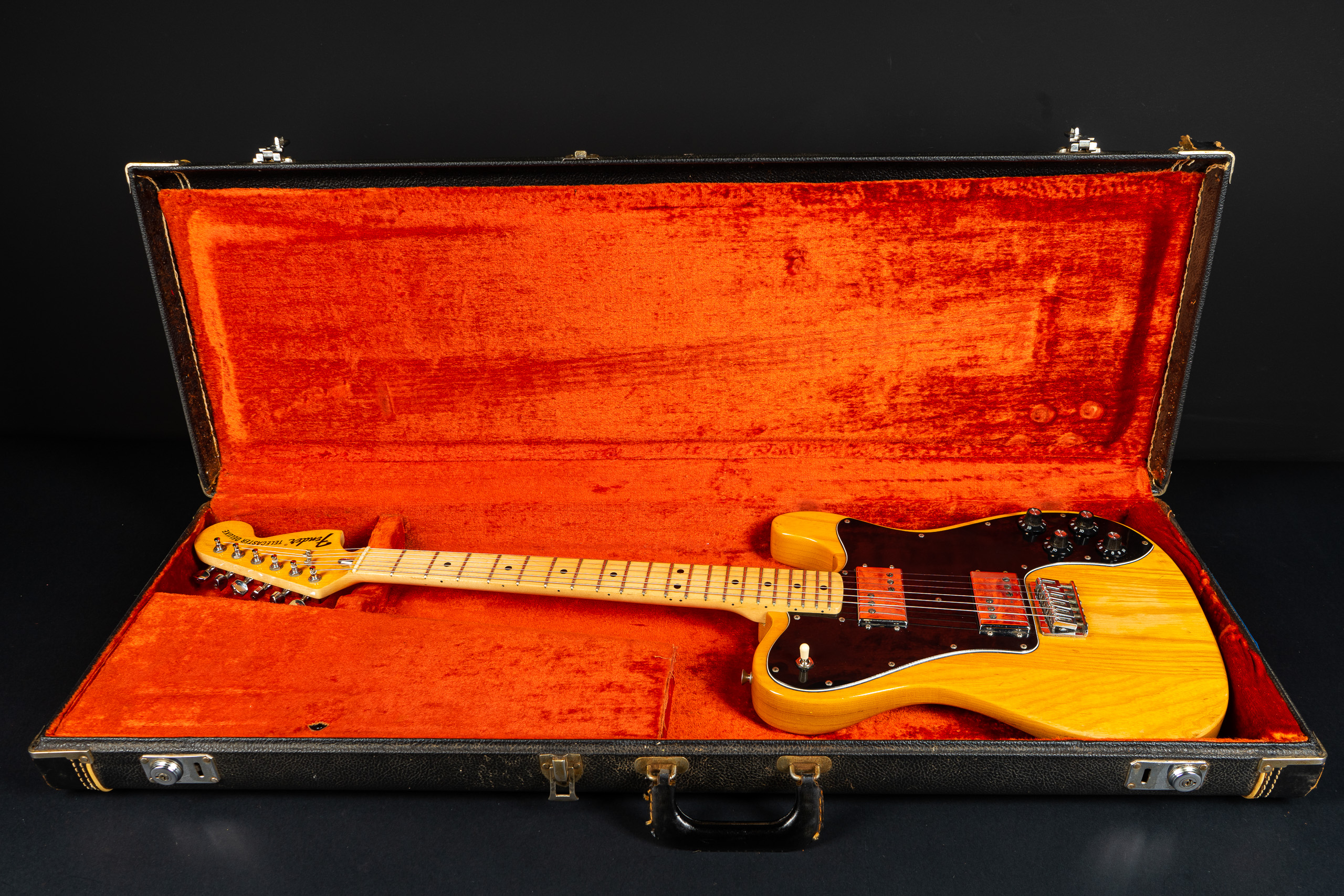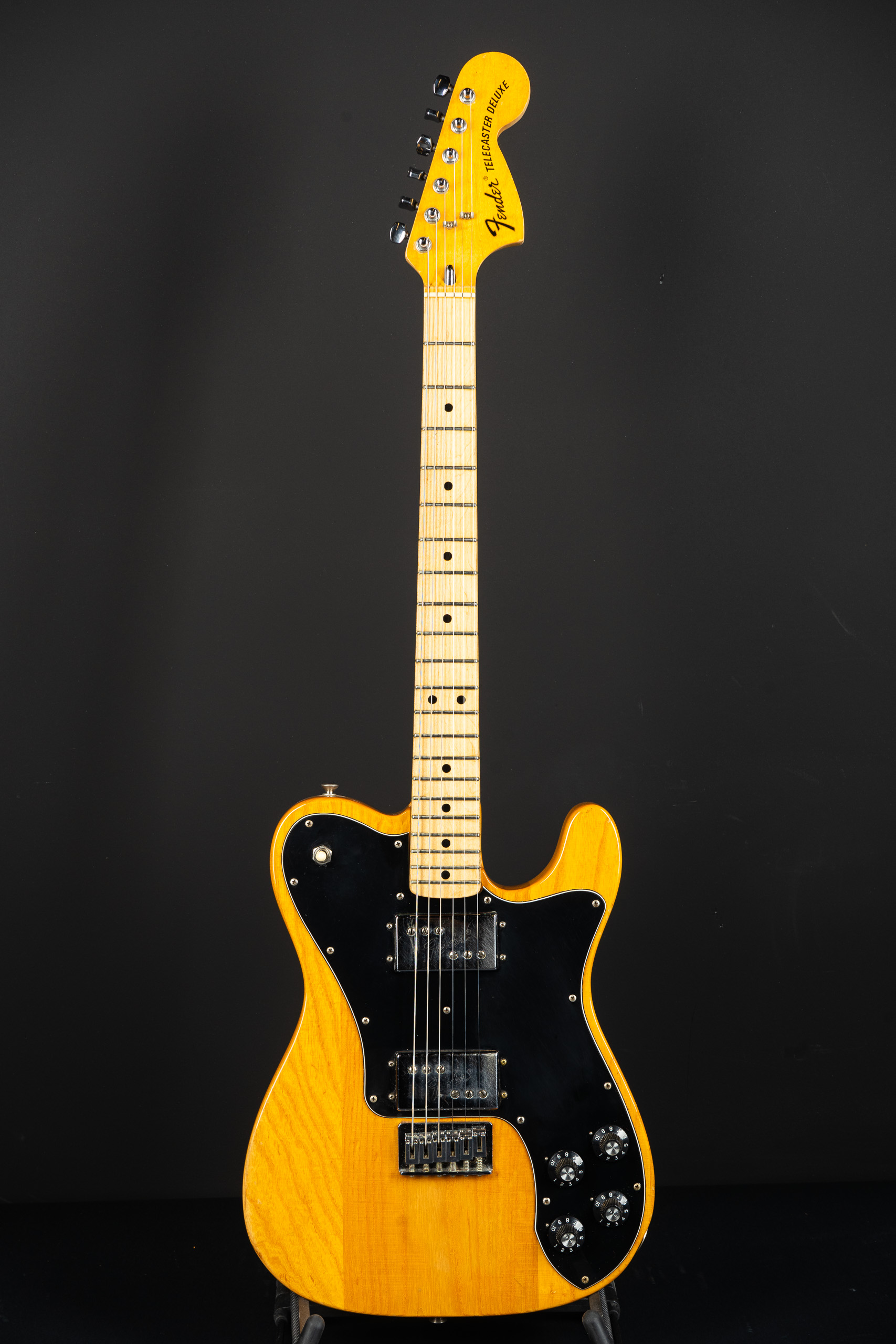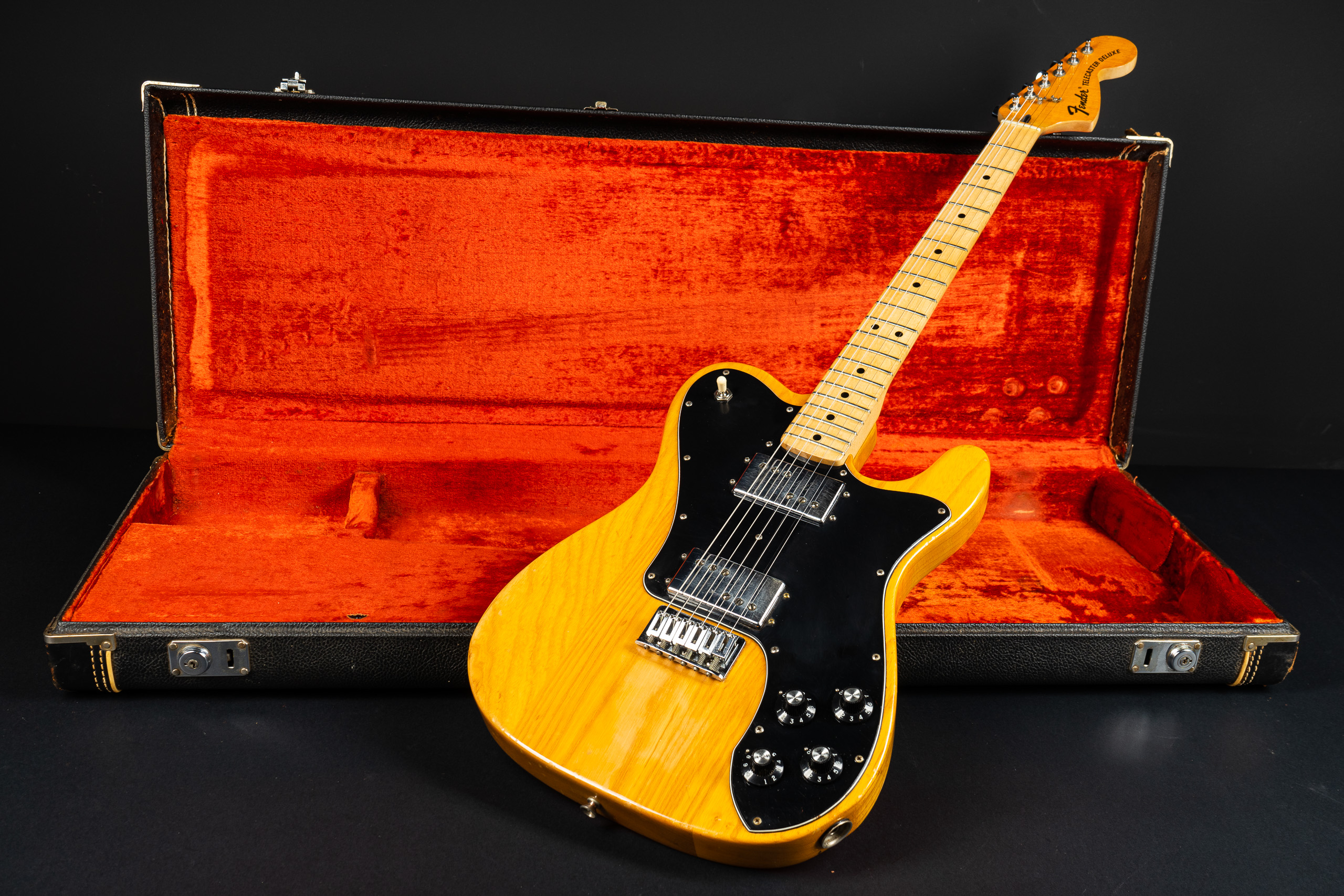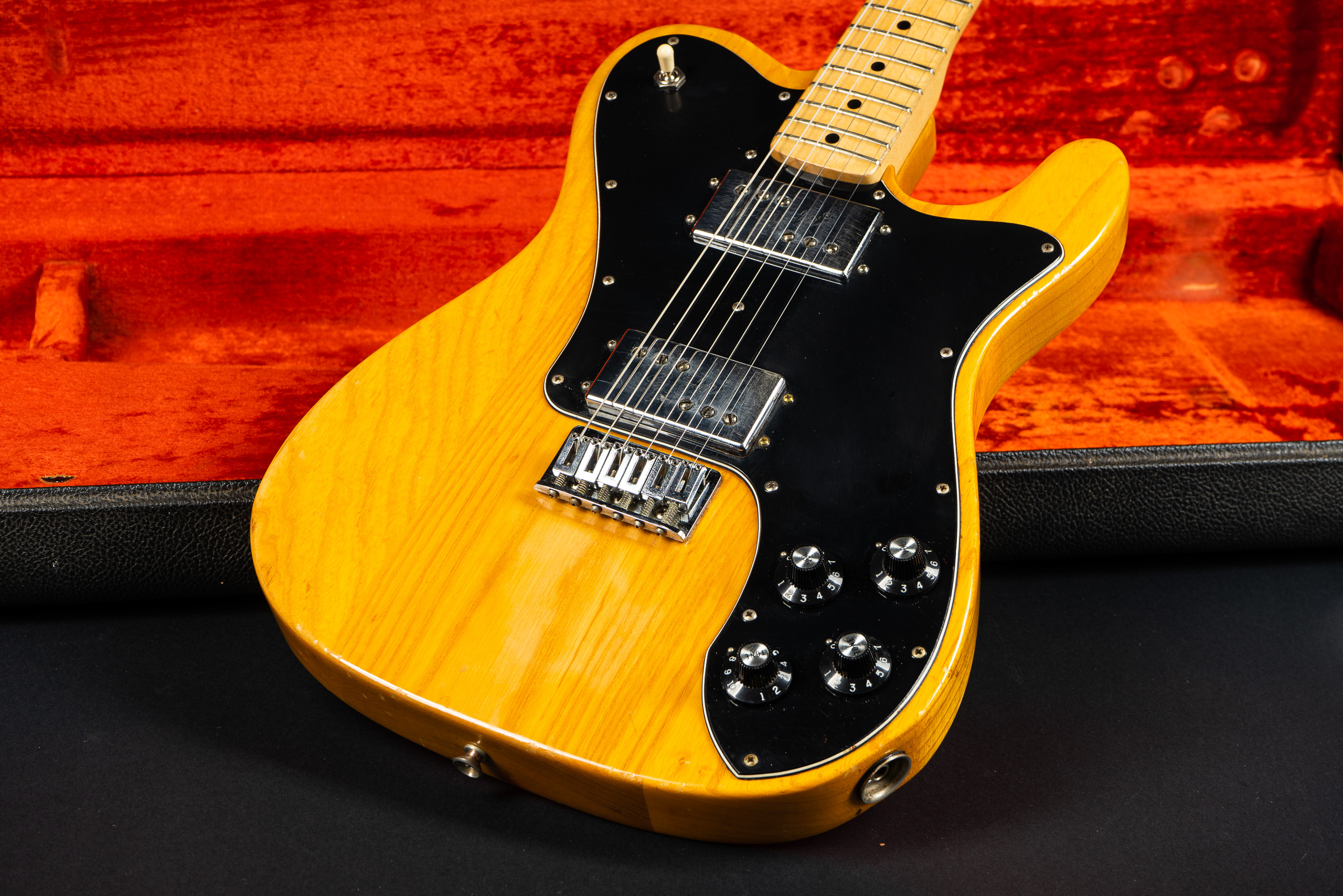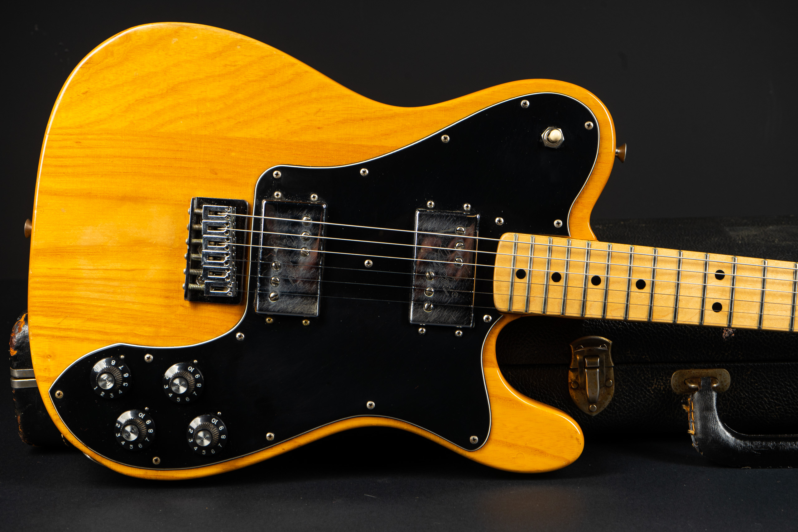 The 70s Deluxe Teles with the amazing sounding “Wide Range” humbuckers became more and more popular during the last years since they offer a great “between both worlds” sound variation and are wonderful versatile instruments! This guitar is all original and in excellent condition besides some minor remains in the clear lacquer from a former sticker on the top behind the bridge and some minor play-wear and tarnish of the chrome-plating. The two original Fender humbuckers have strong outputs of 10,72K(N) and 10,42K(B) and sound great! The medium-sized c-shape neck is very comfortable to play, the original frets are still in good condition. Comes in orig. black Fender tolex Case w/orange interior.