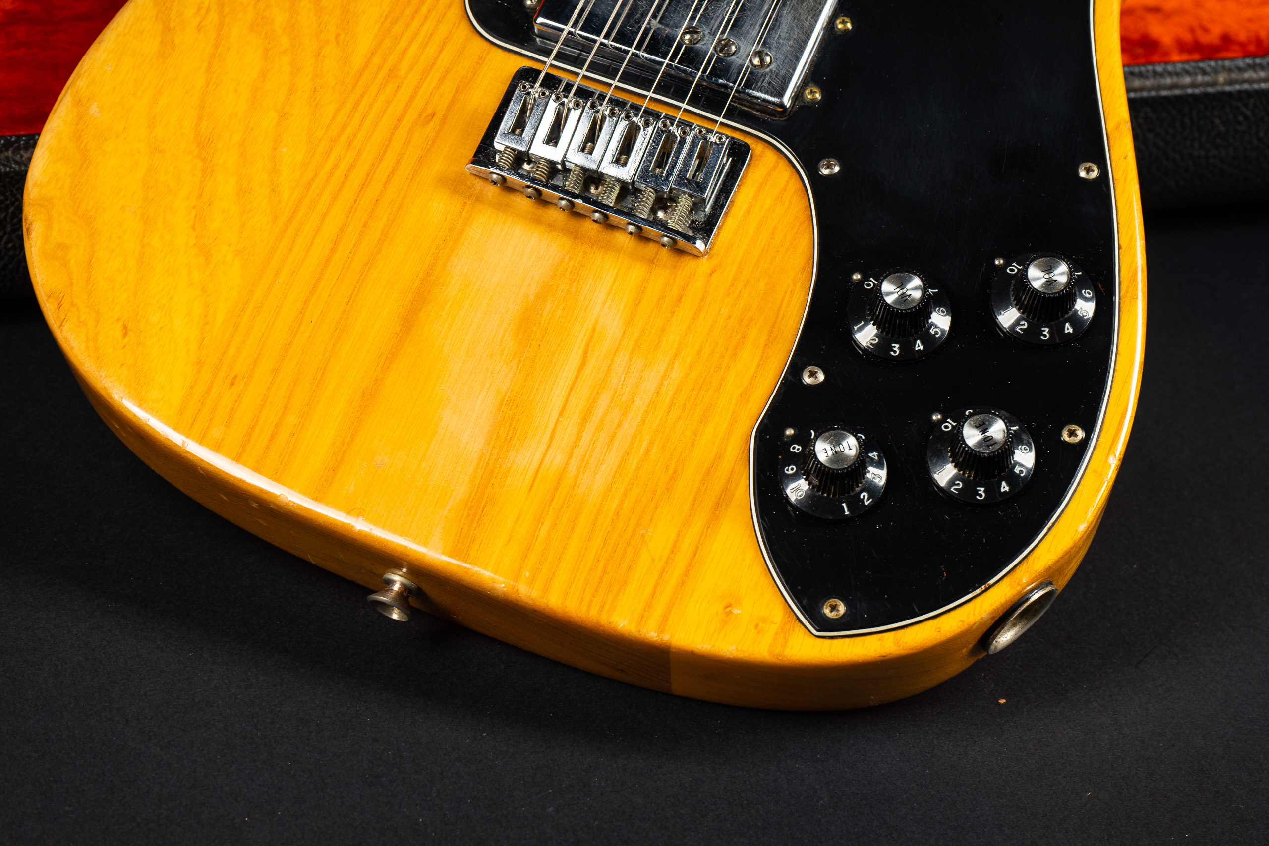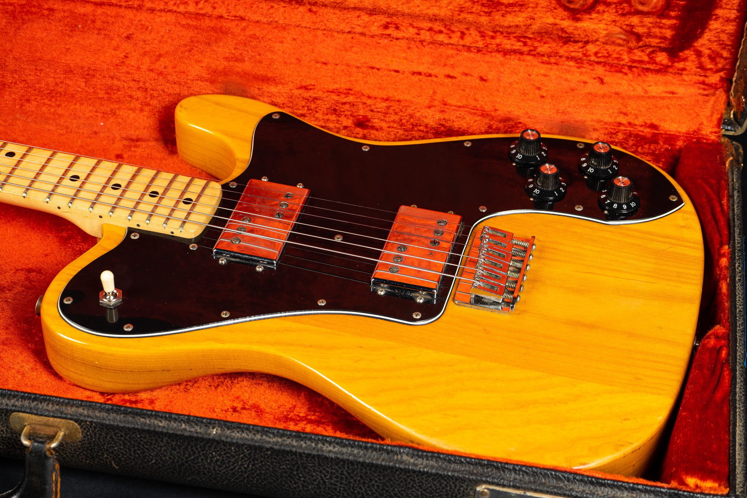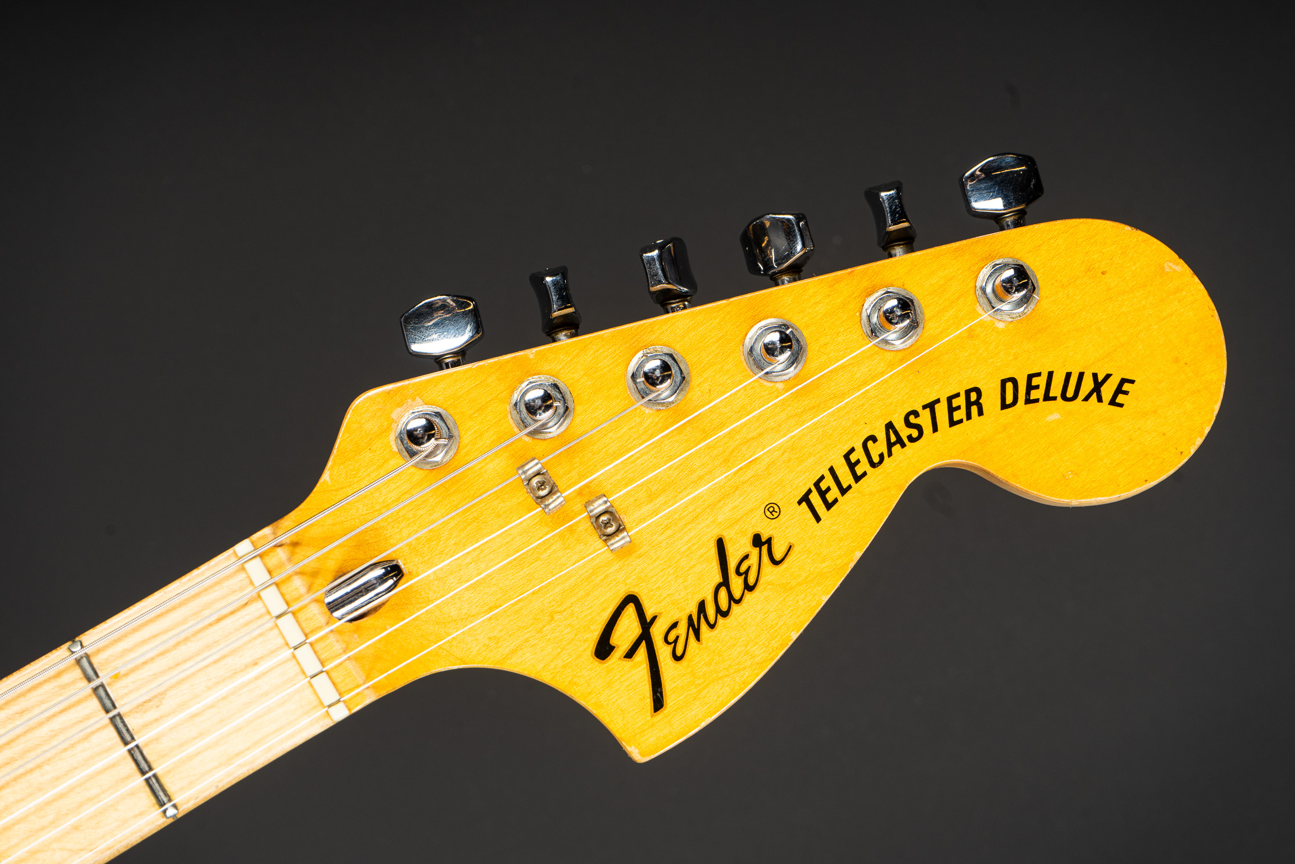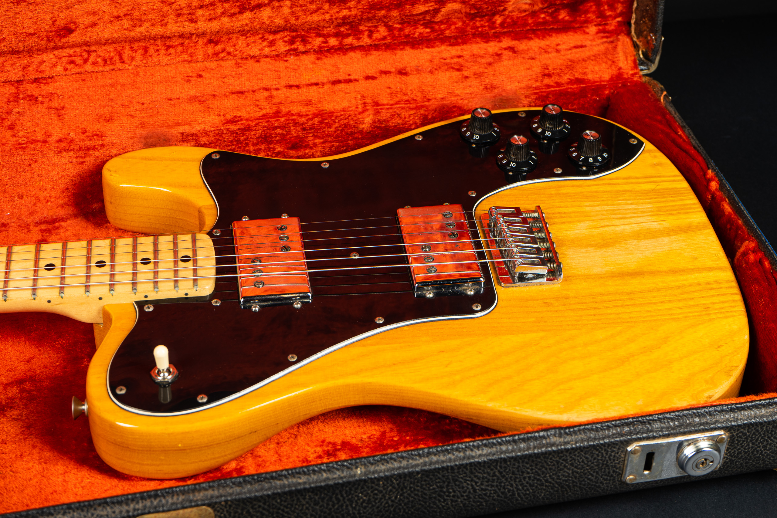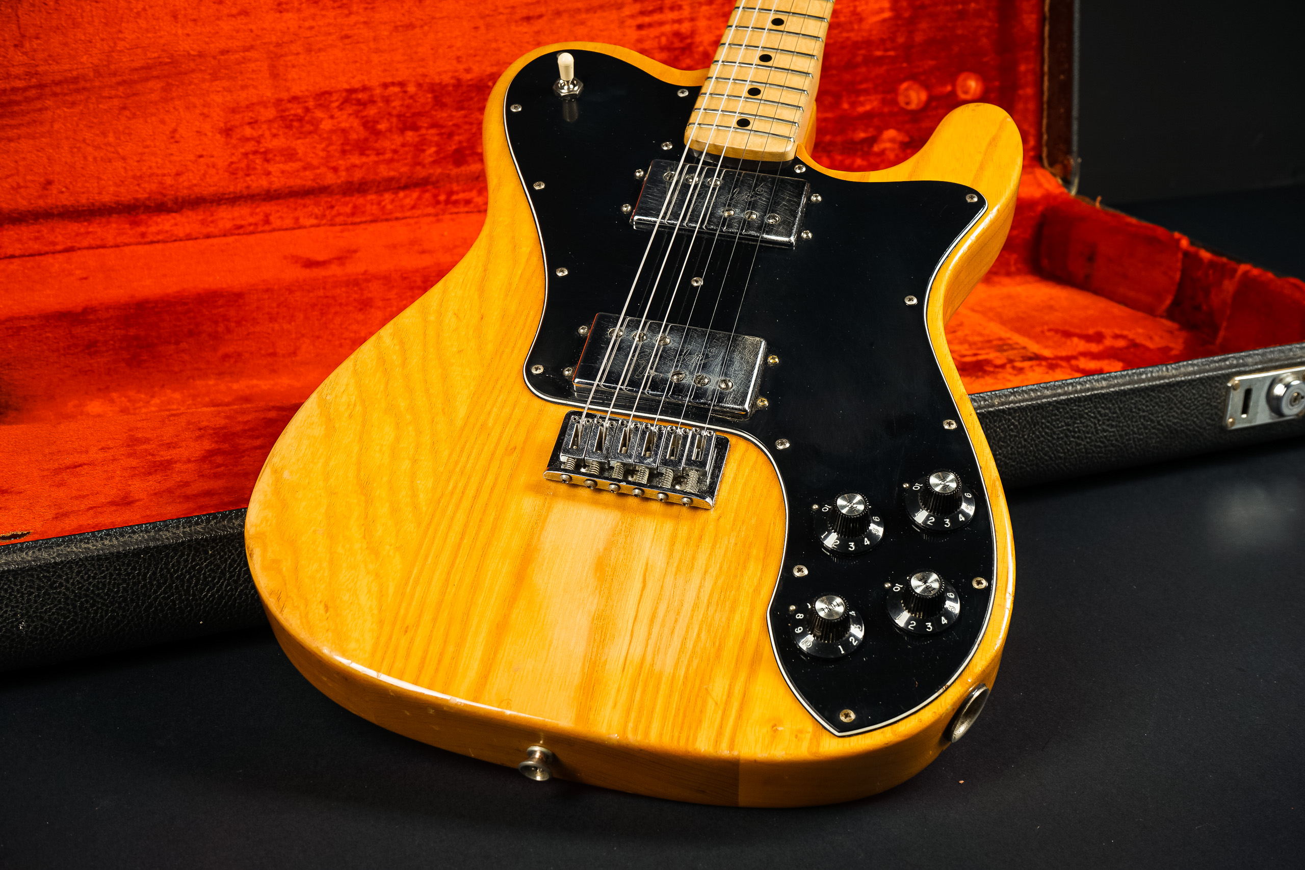 The 70s Deluxe Teles with the amazing sounding “Wide Range” humbuckers became more and more popular during the last years since they offer a great “between both worlds” sound variation and are wonderful versatile instruments! This guitar is all original and in excellent condition besides some minor remains in the clear lacquer from a former sticker on the top behind the bridge and some minor play-wear and tarnish of the chrome-plating. The two original Fender humbuckers have strong outputs of 10,72K(N) and 10,42K(B) and sound great! The medium-sized c-shape neck is very comfortable to play, the original frets are still in good condition. Comes in orig. black Fender tolex Case w/orange interior.