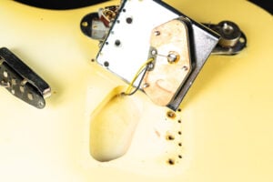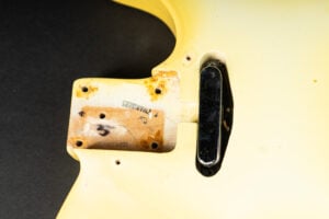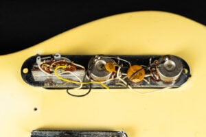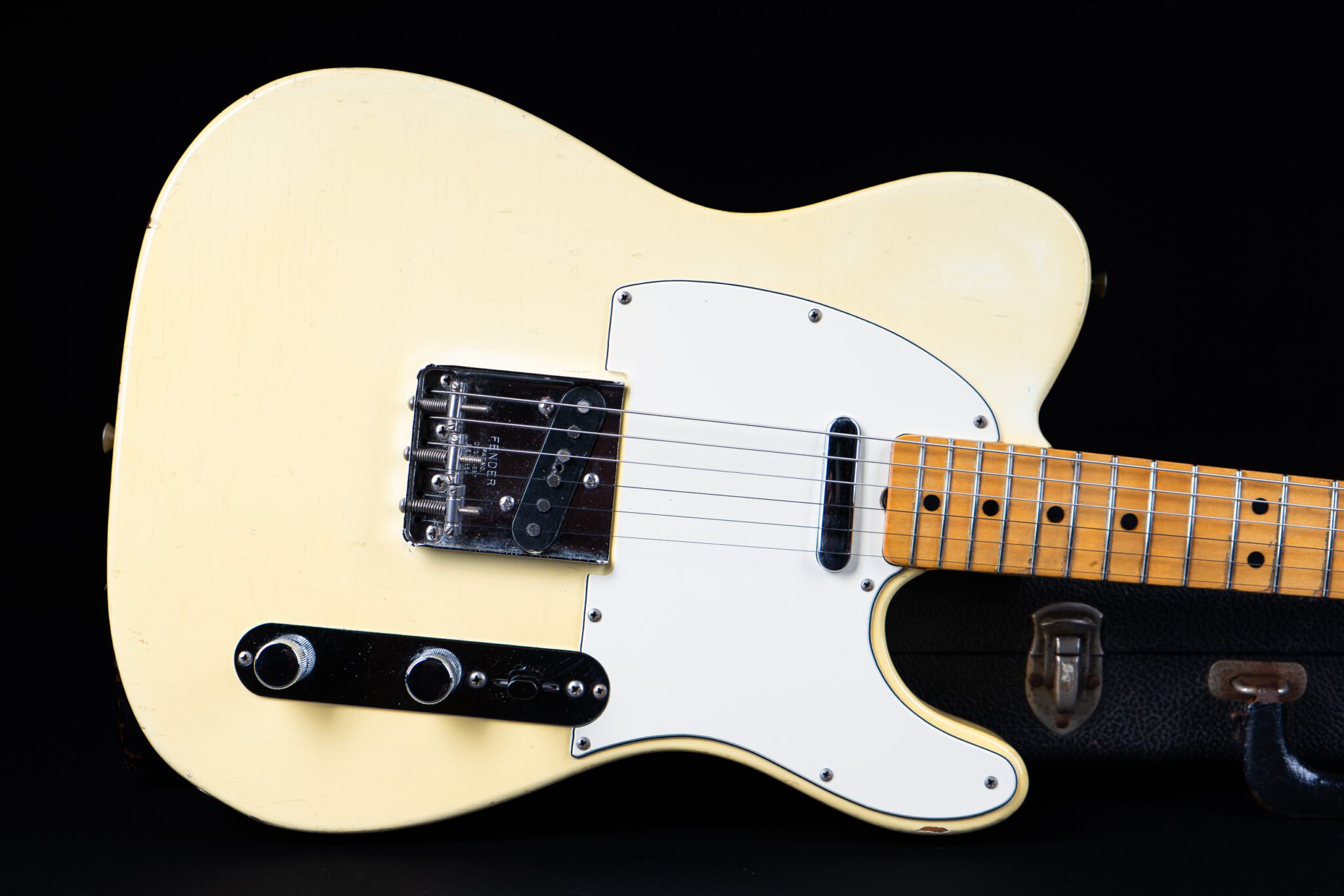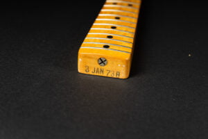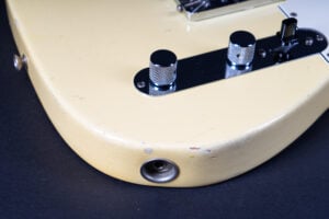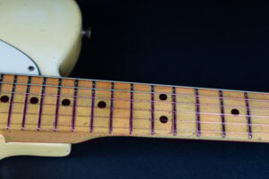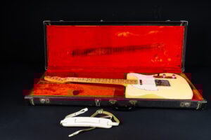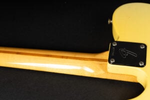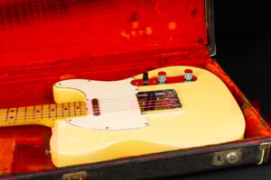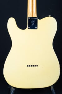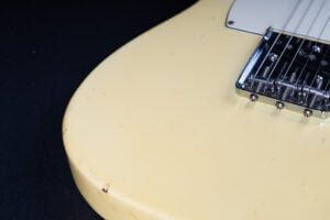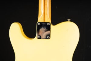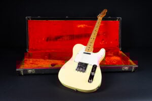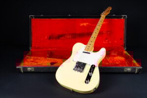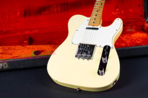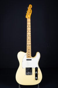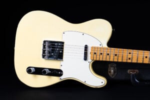 Thats a cool one: early 1973 Telecaster in Olympic White finish – not Blond. It has the Alder body instead of Ash and solid (custom color!) Olympic White finish with maple neck. What a looker! The neck has a comfortable round feel, not as thin as later examples. All original guitar with untouched solder joints! January 1973 neck and 65 pot dates! Comes incl. original case, strap and ashtray!