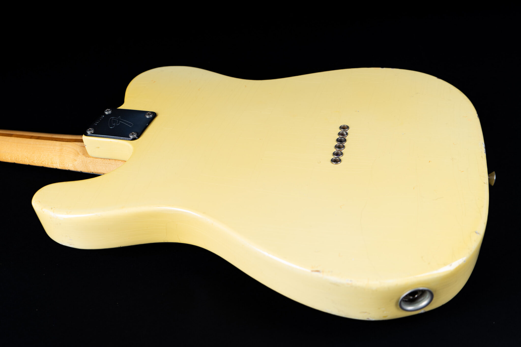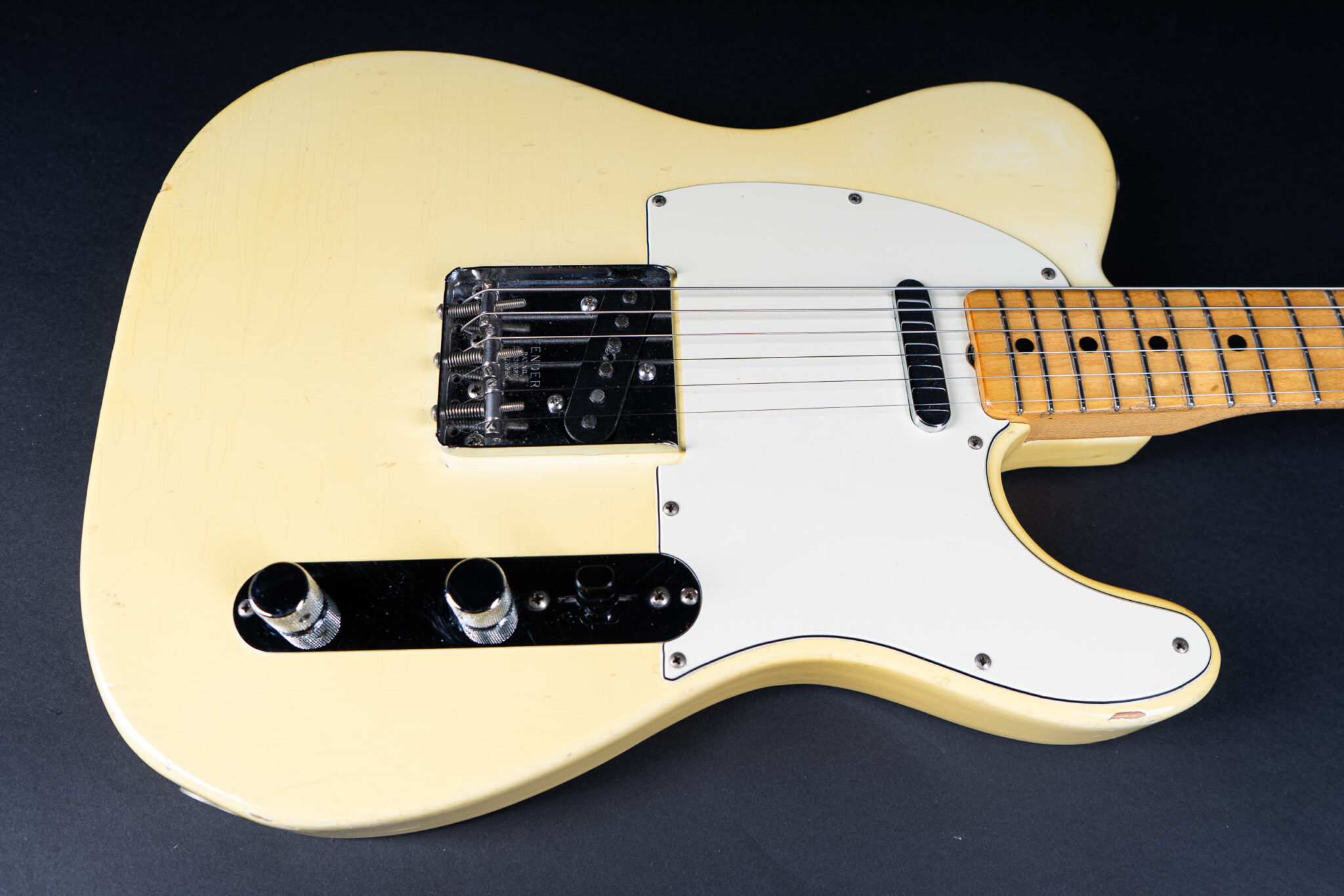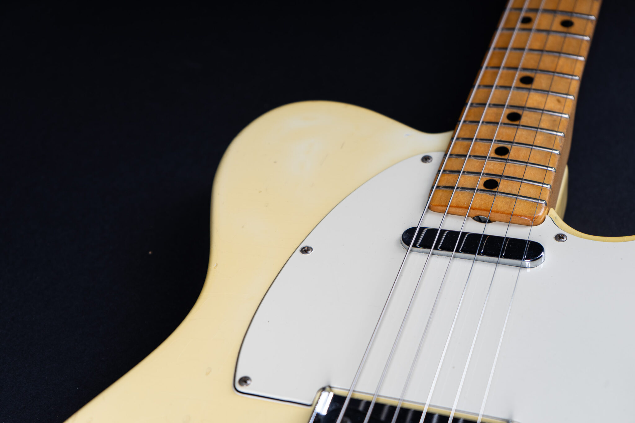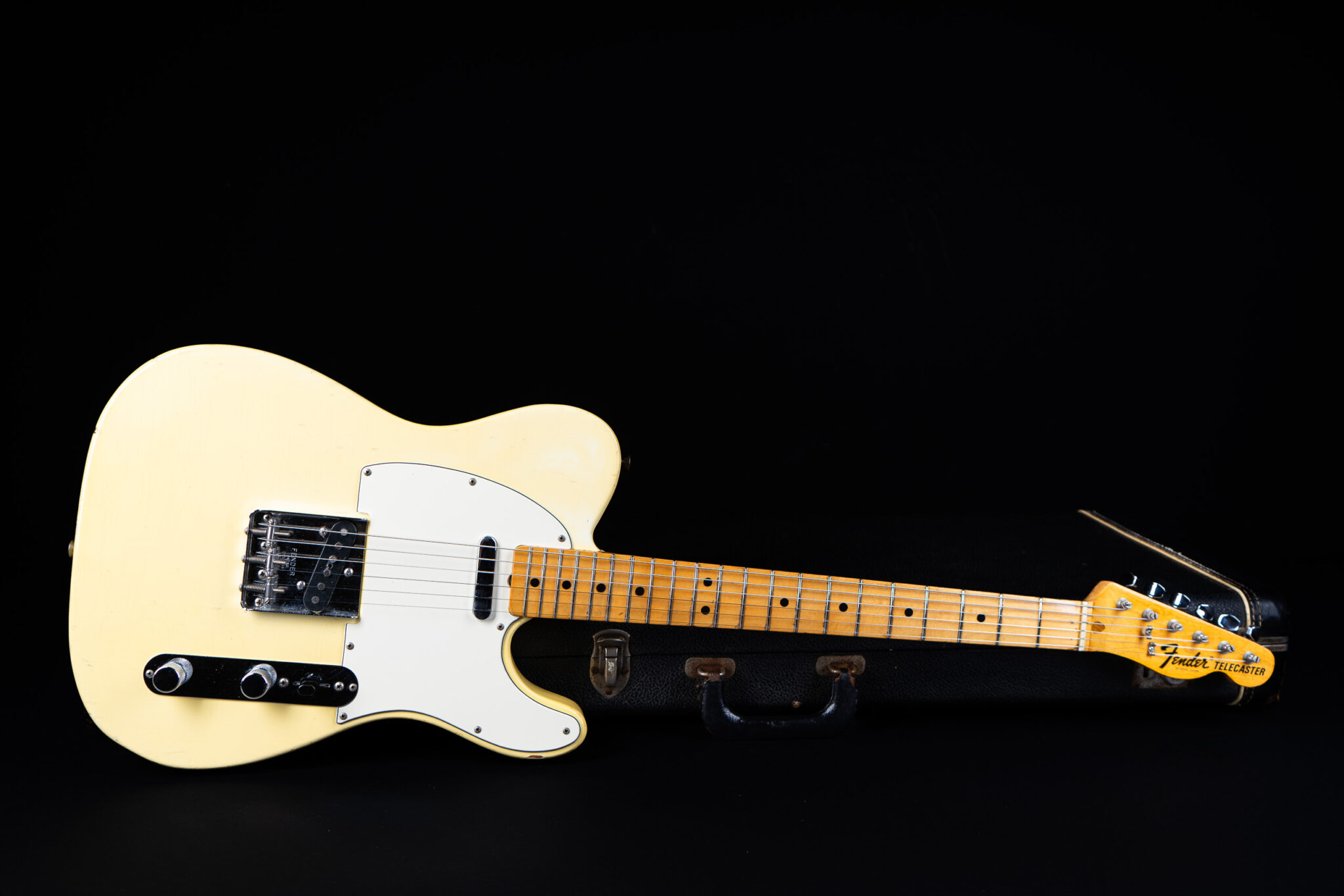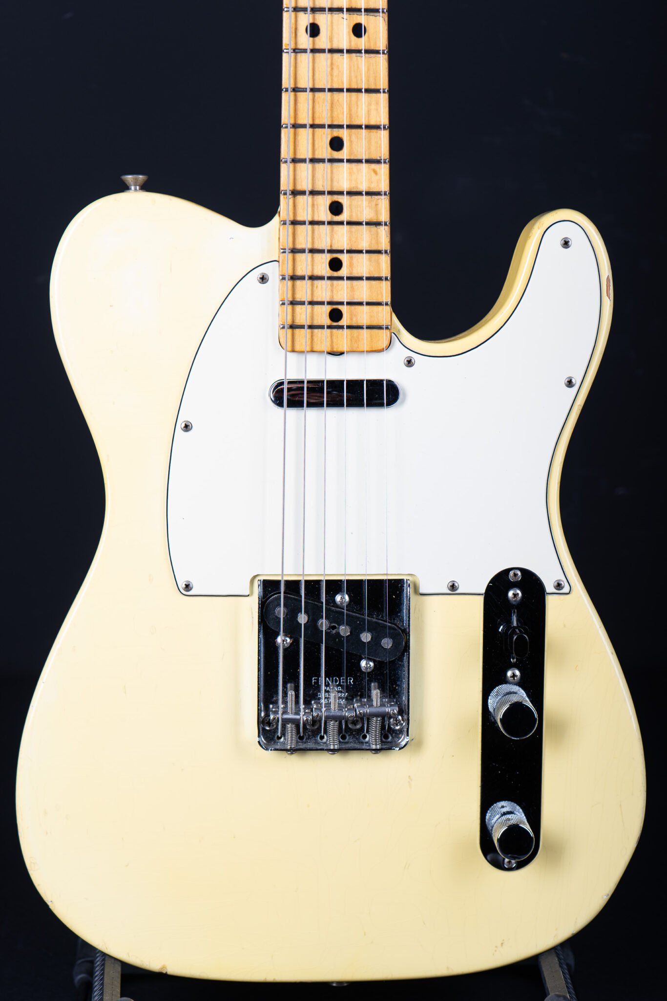 Thats a cool one: early 1973 Telecaster in Olympic White finish – not Blond. It has the Alder body instead of Ash and solid (custom color!) Olympic White finish with maple neck. What a looker! The neck has a comfortable round feel, not as thin as later examples. All original guitar with untouched solder joints! January 1973 neck and 65 pot dates! Comes incl. original case, strap and ashtray!
