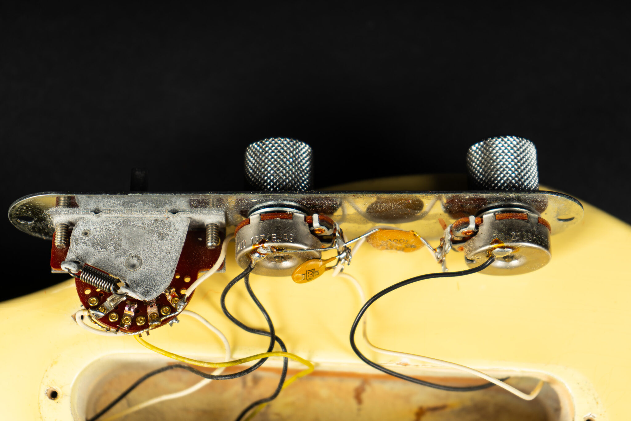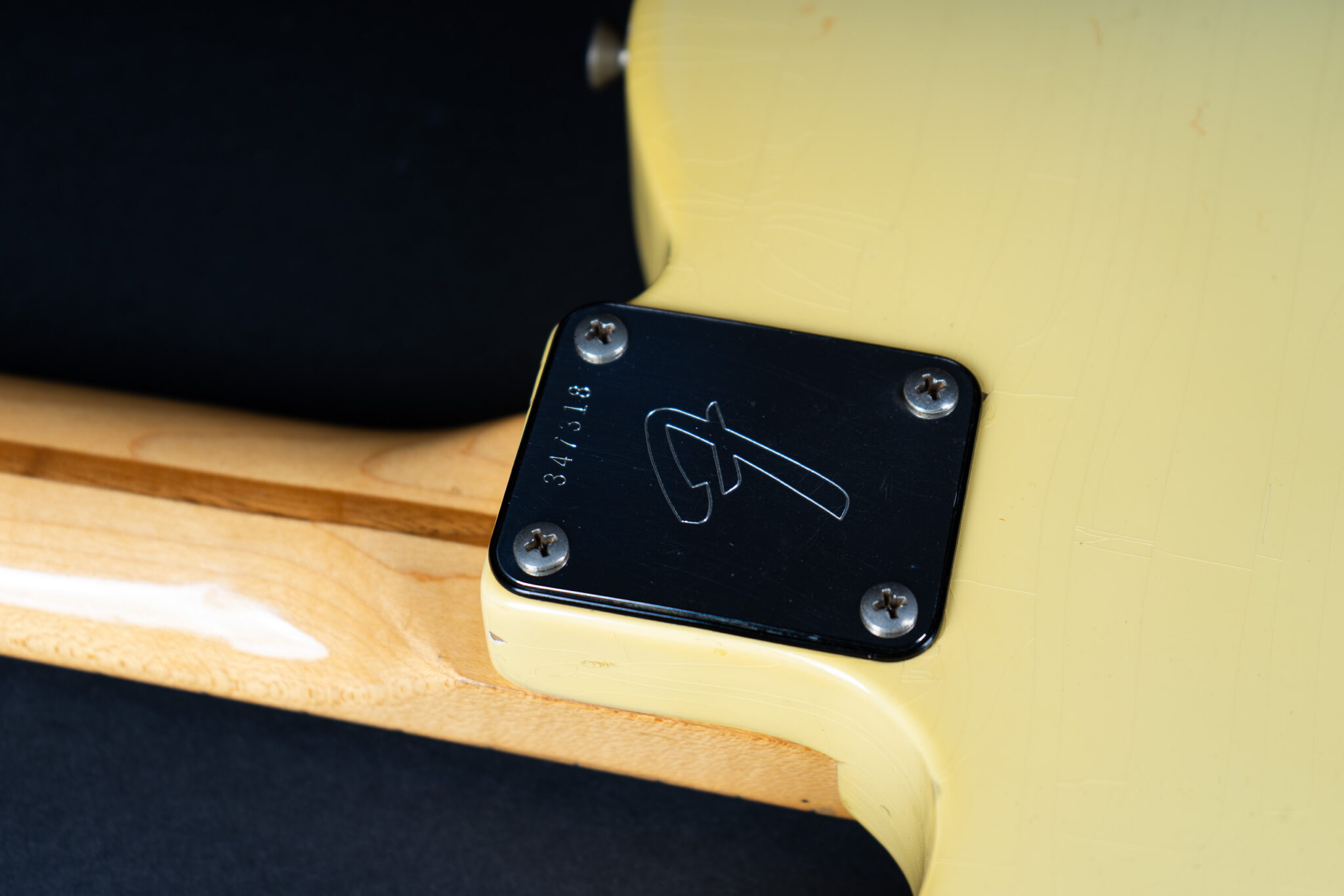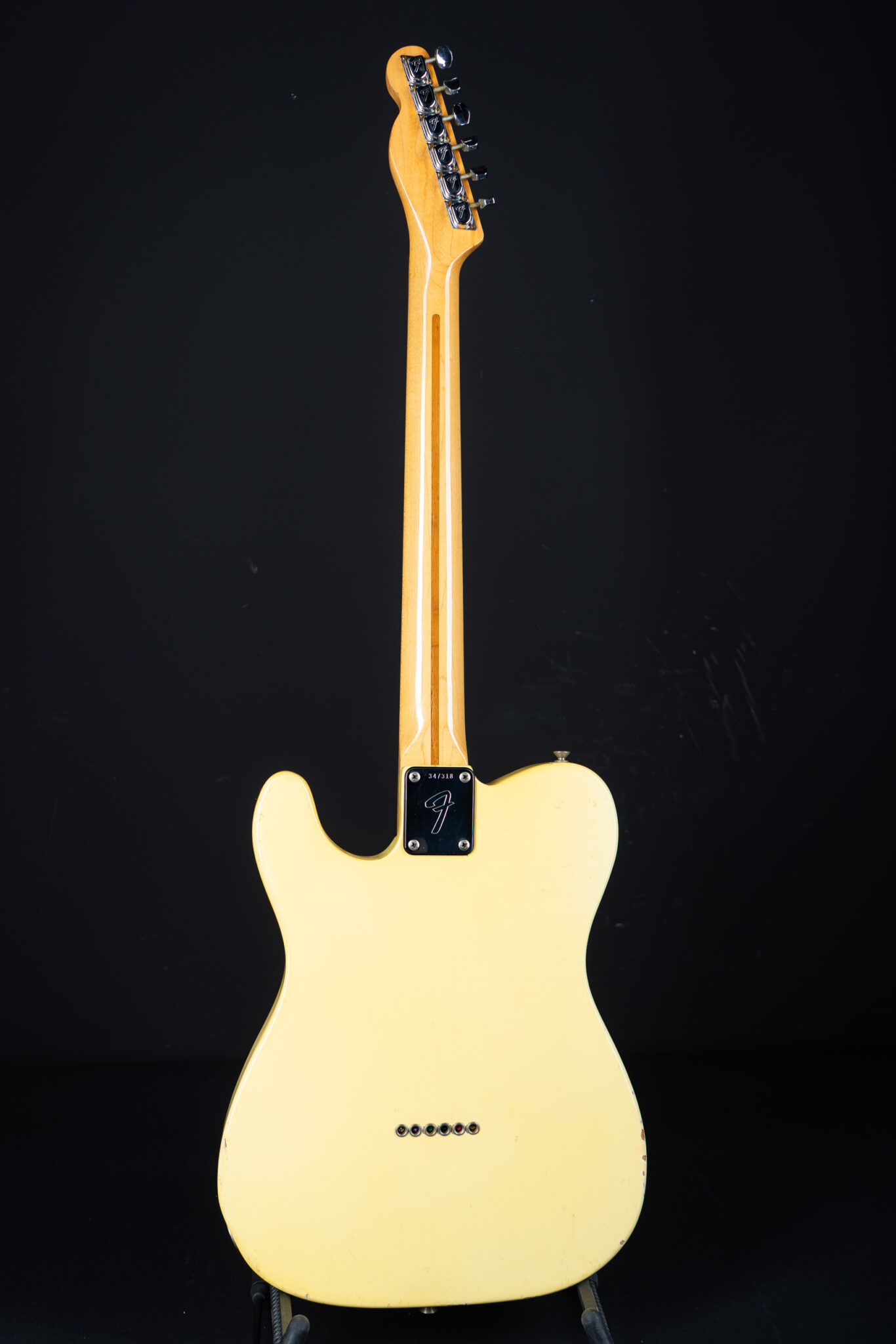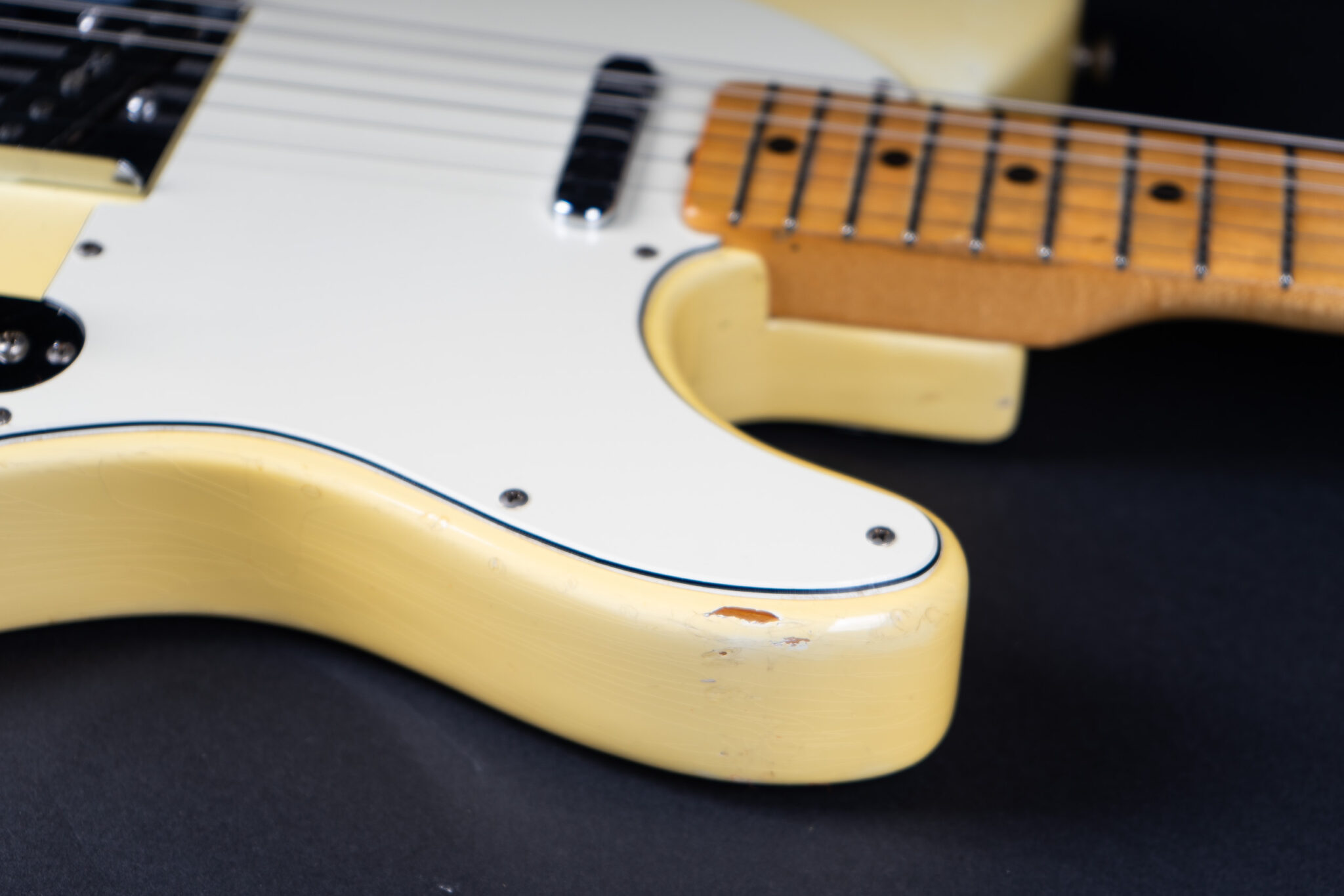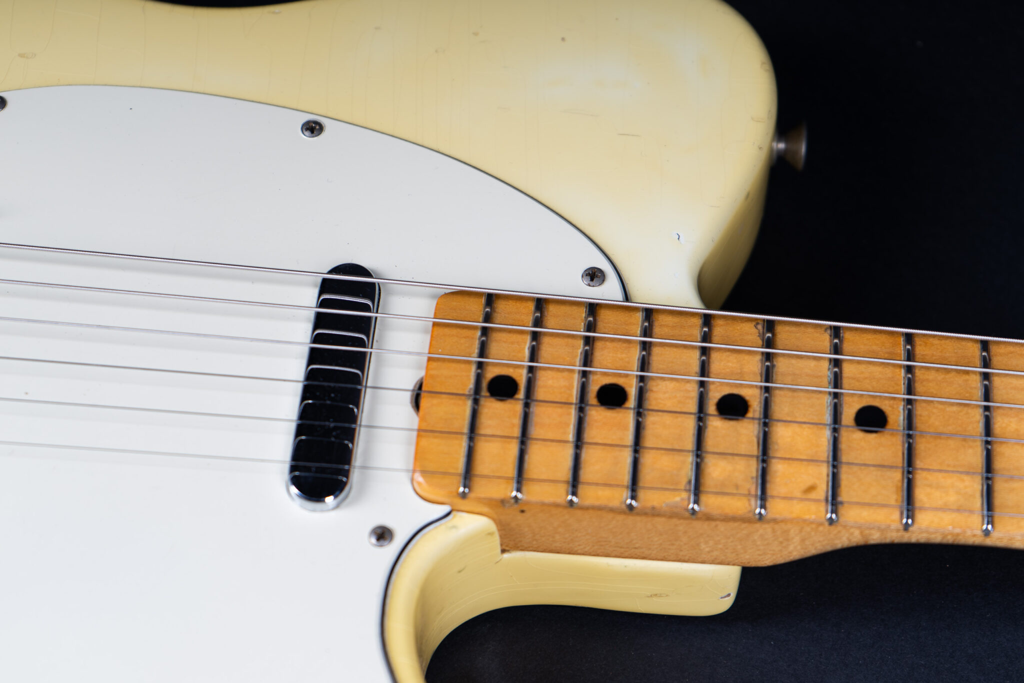 Thats a cool one: early 1973 Telecaster in Olympic White finish – not Blond. It has the Alder body instead of Ash and solid (custom color!) Olympic White finish with maple neck. What a looker! The neck has a comfortable round feel, not as thin as later examples. All original guitar with untouched solder joints! January 1973 neck and 65 pot dates! Comes incl. original case, strap and ashtray!