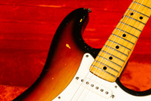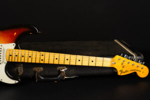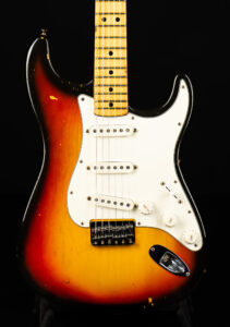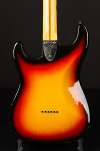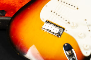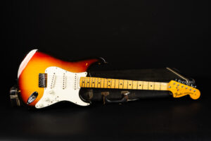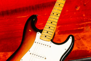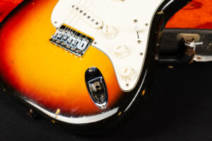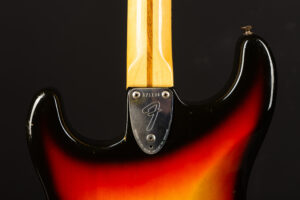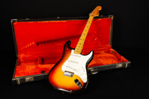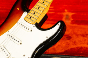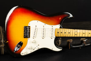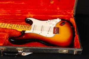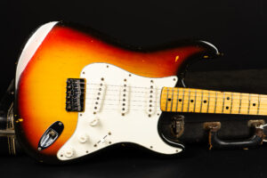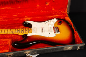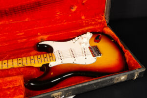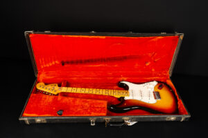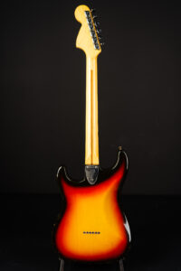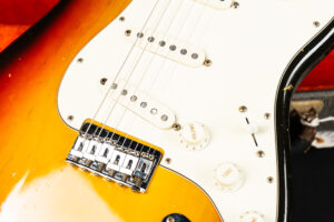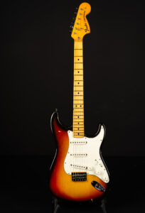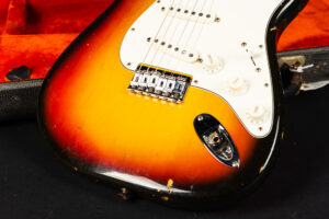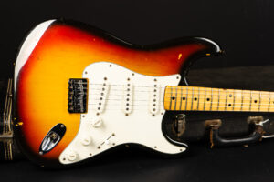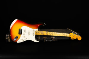 Late 1974 Fender Hardtail Stratocaster in excellent condition. All original besides new switch tip and nut, all pickups dated 1974, neck dated 1974 and pots are 51st week of 1974. Serial is 1974 is well. Already the flat pole pickups. Lightweight twangy hardtail – really nice. Some wear, especially on the neck but overall a clean example! Comes incl. original case (2 missing latches).