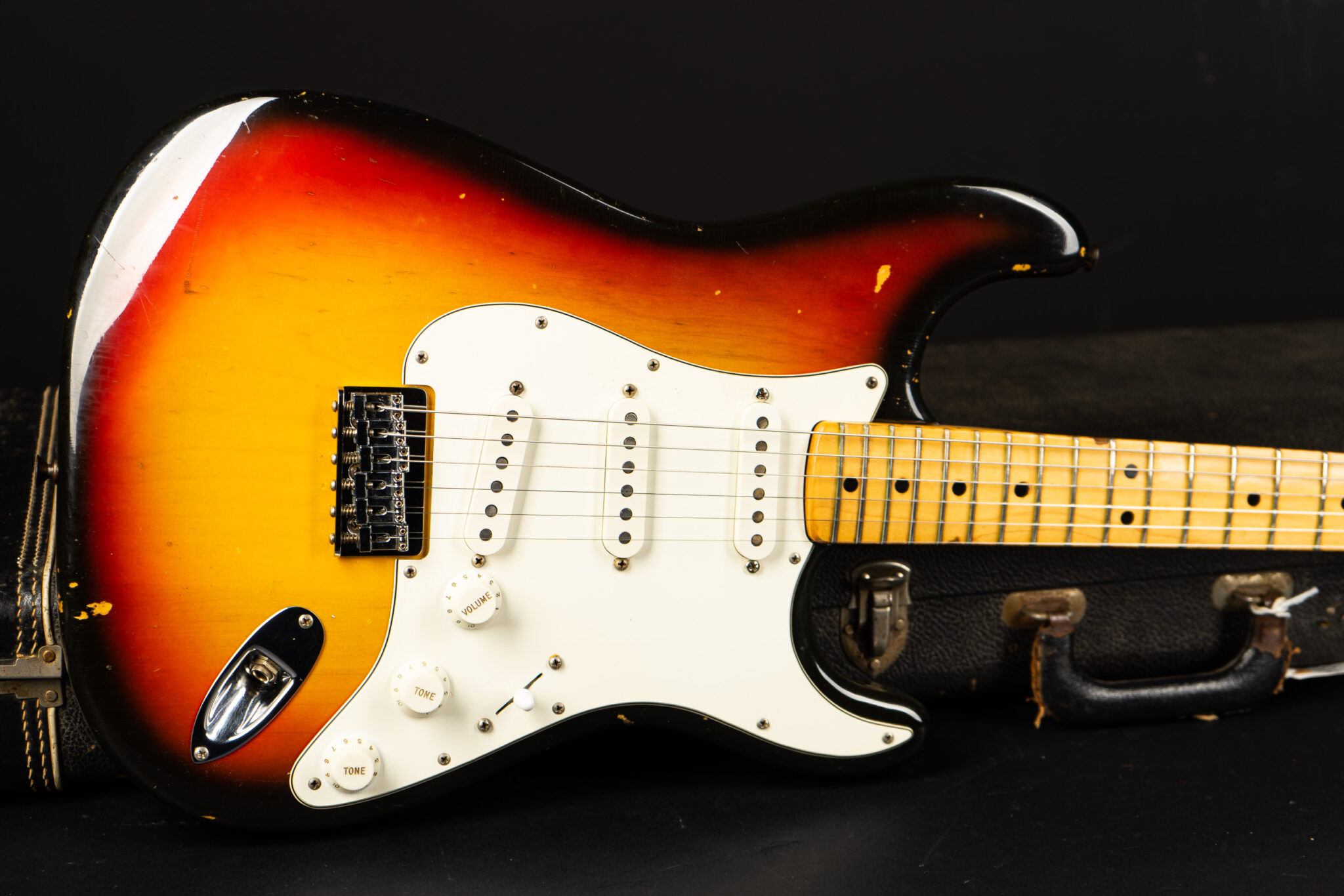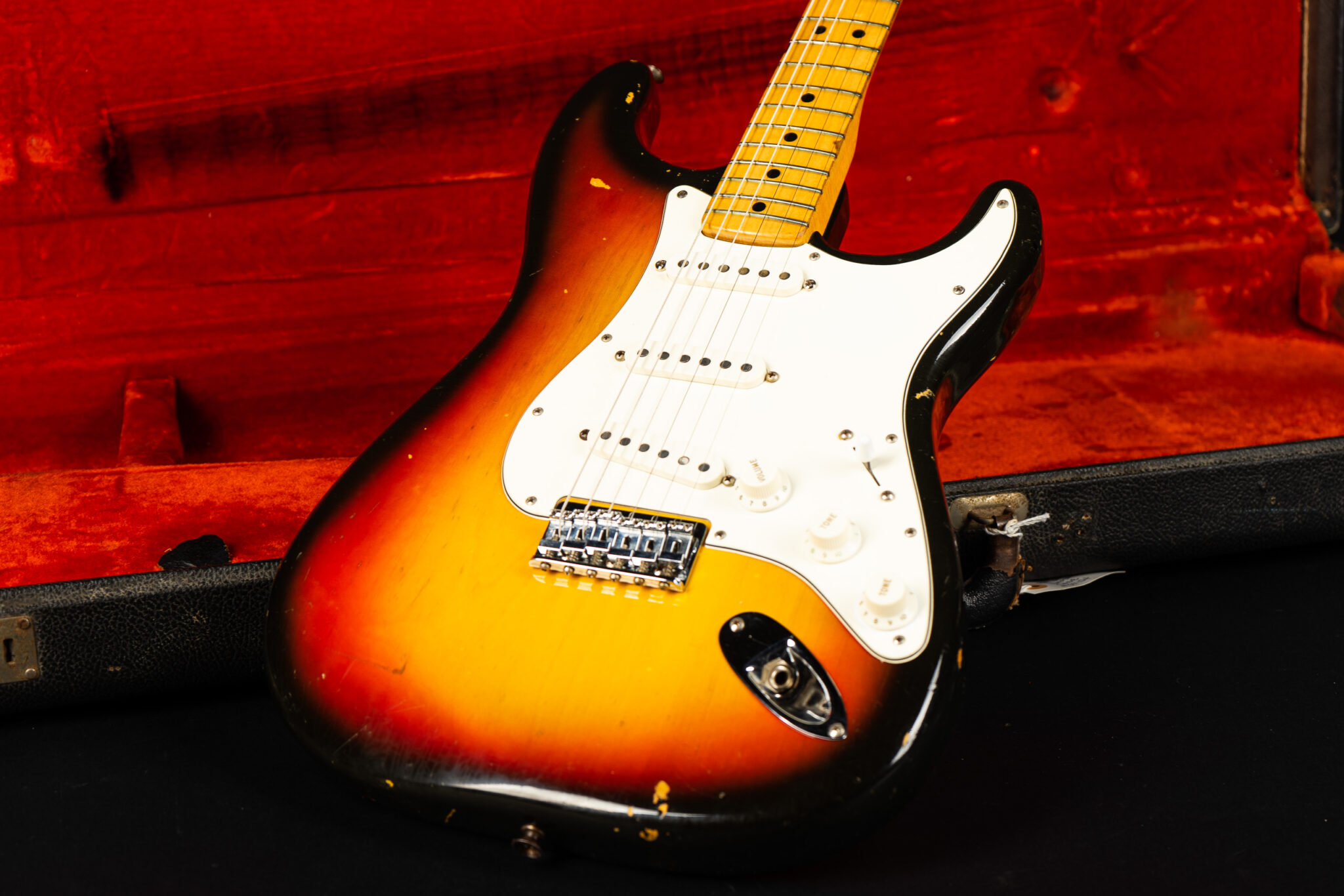 Late 1974 Fender Hardtail Stratocaster in excellent condition. All original besides new switch tip and nut, all pickups dated 1974, neck dated 1974 and pots are 51st week of 1974. Serial is 1974 is well. Already the flat pole pickups. Lightweight twangy hardtail – really nice. Some wear, especially on the neck but overall a clean example! Comes incl. original case (2 missing latches).