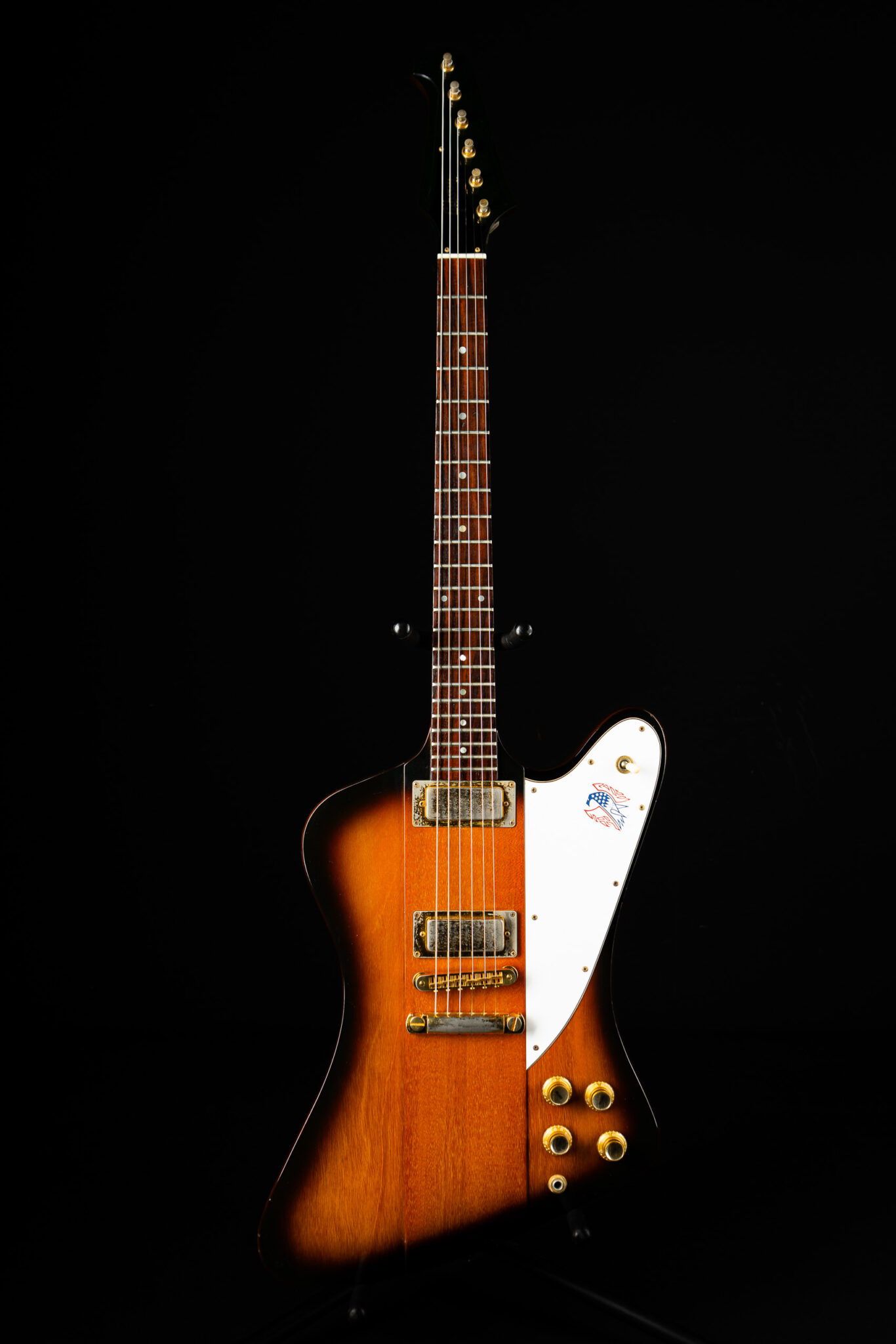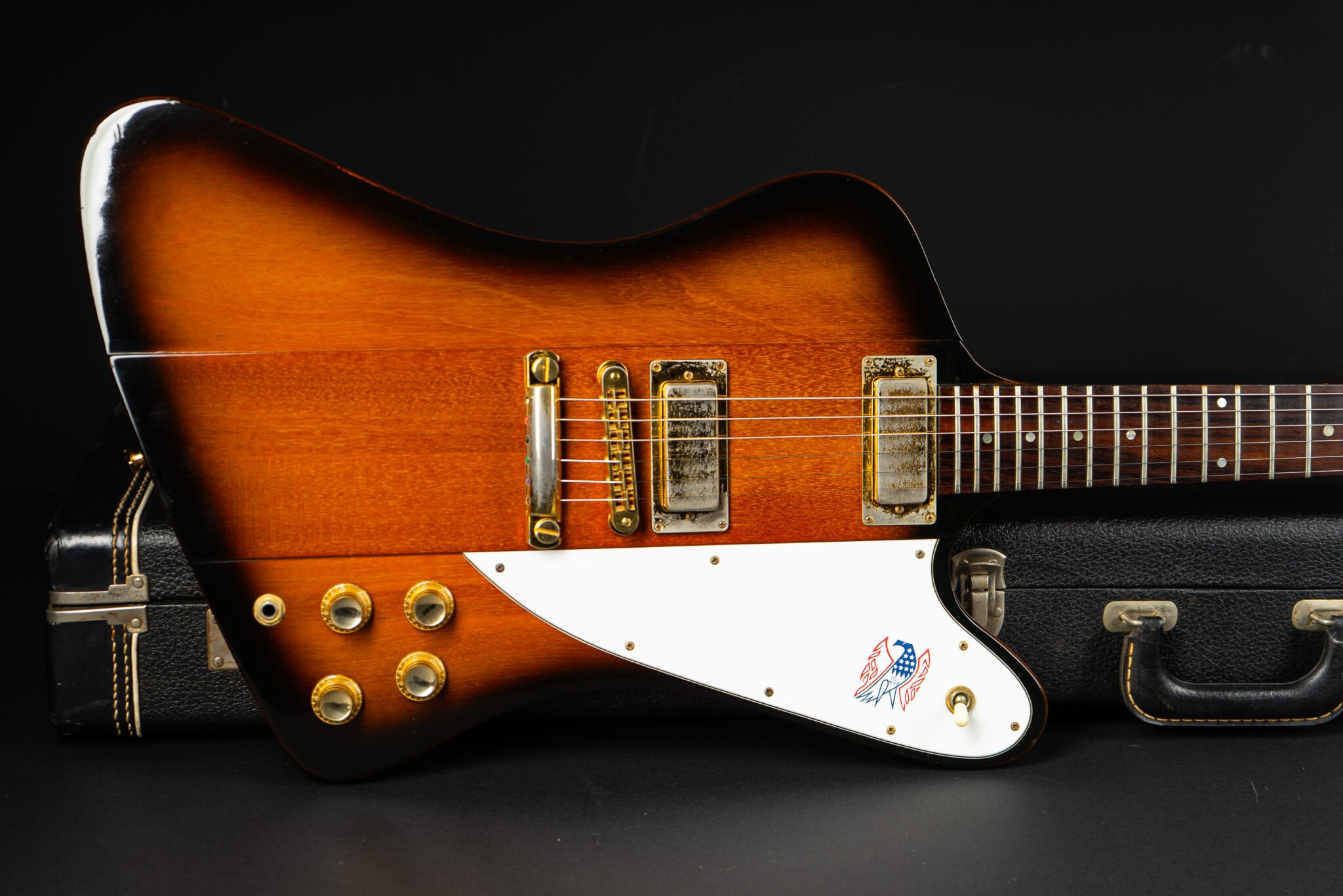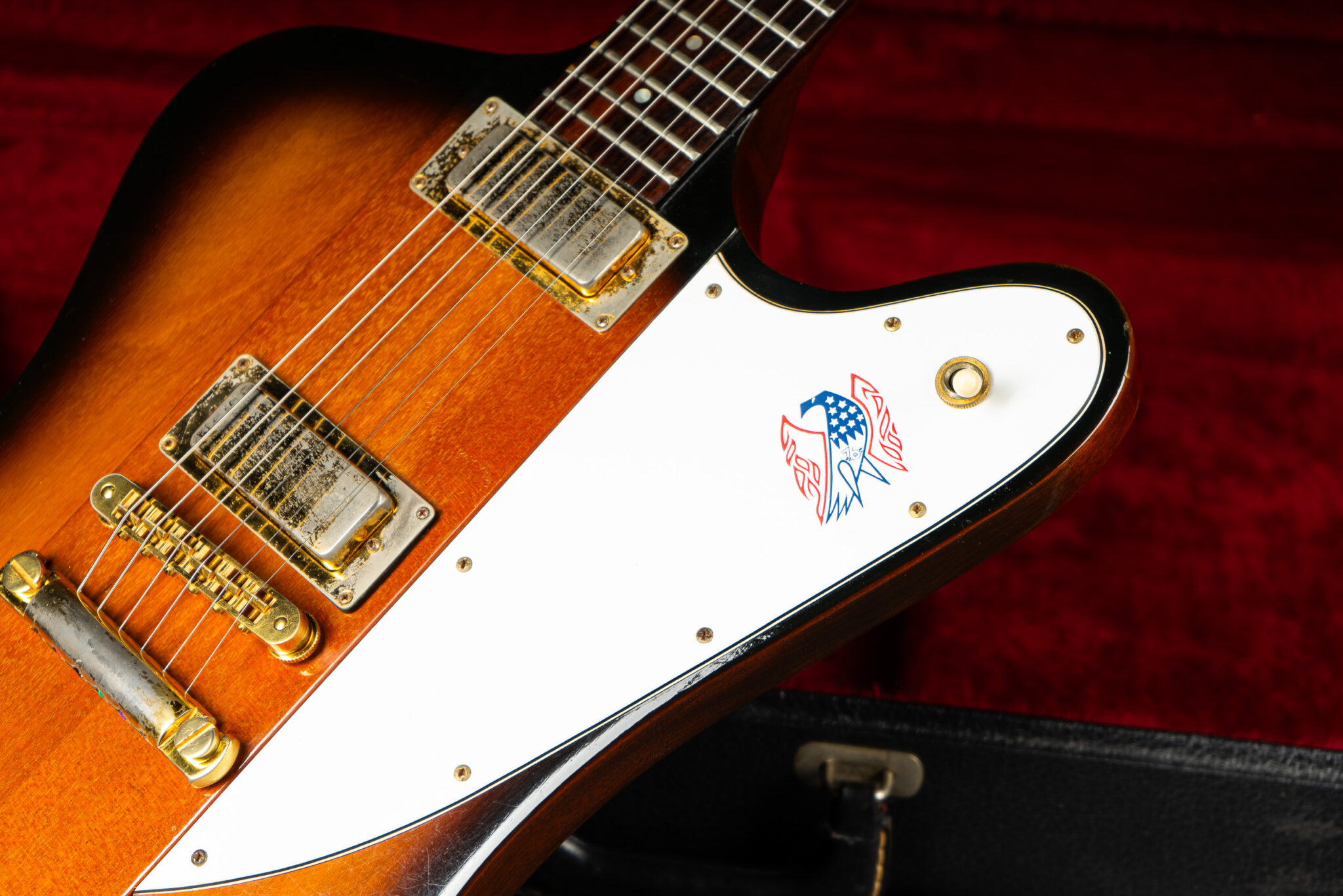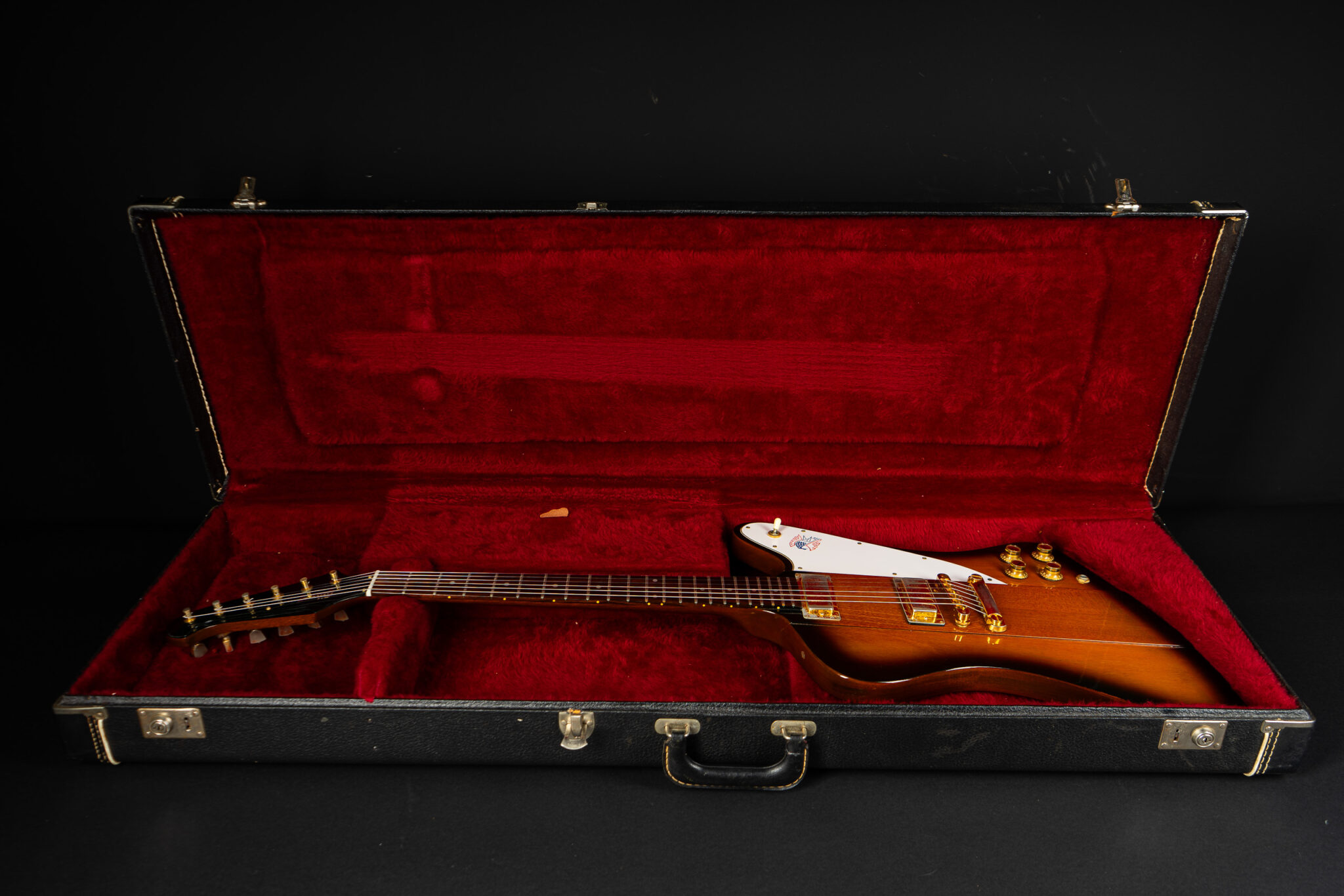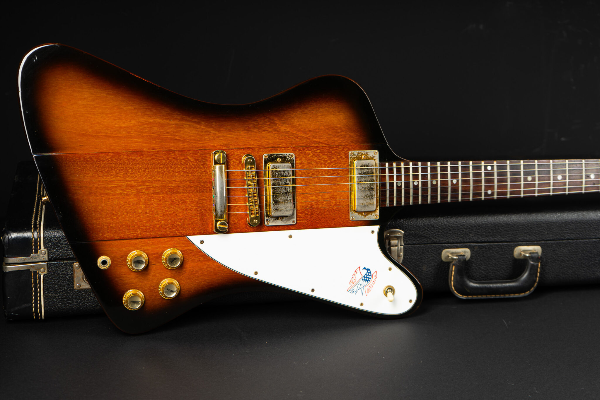 Super clean 1976 Gibson Firebird Bicentennial in classic Sunburst finish and all original (besides a hole from an added strap pin)! Besides some light wear it’s in excellent condition – really stunning instrument! It’s got a big round neck and is lightweight with only 3480g! Dream neck and amazing rock tone! Great low action and playability! Comes in its original black Gibson Firebird case.