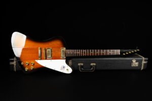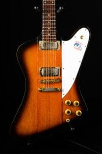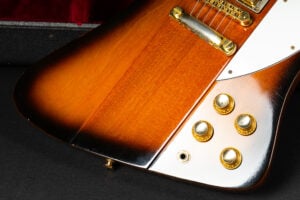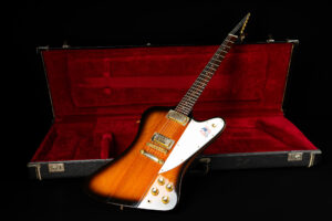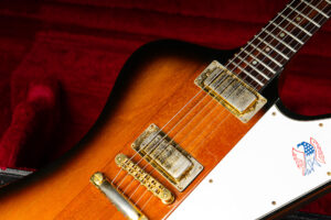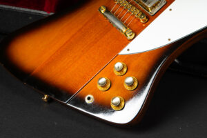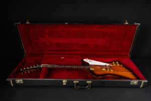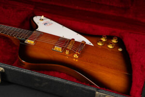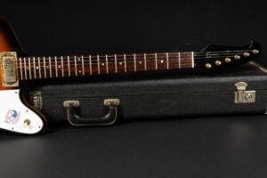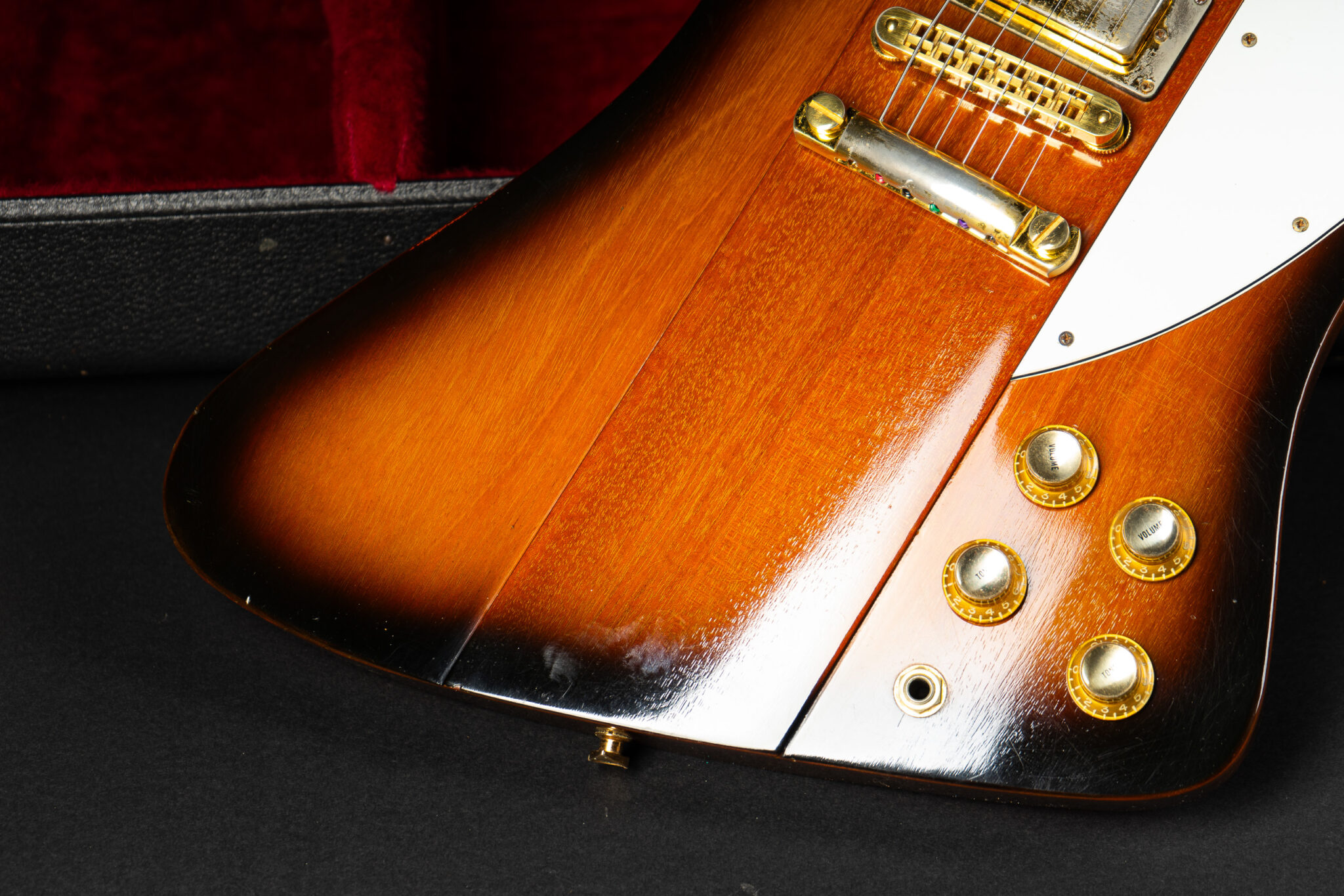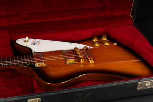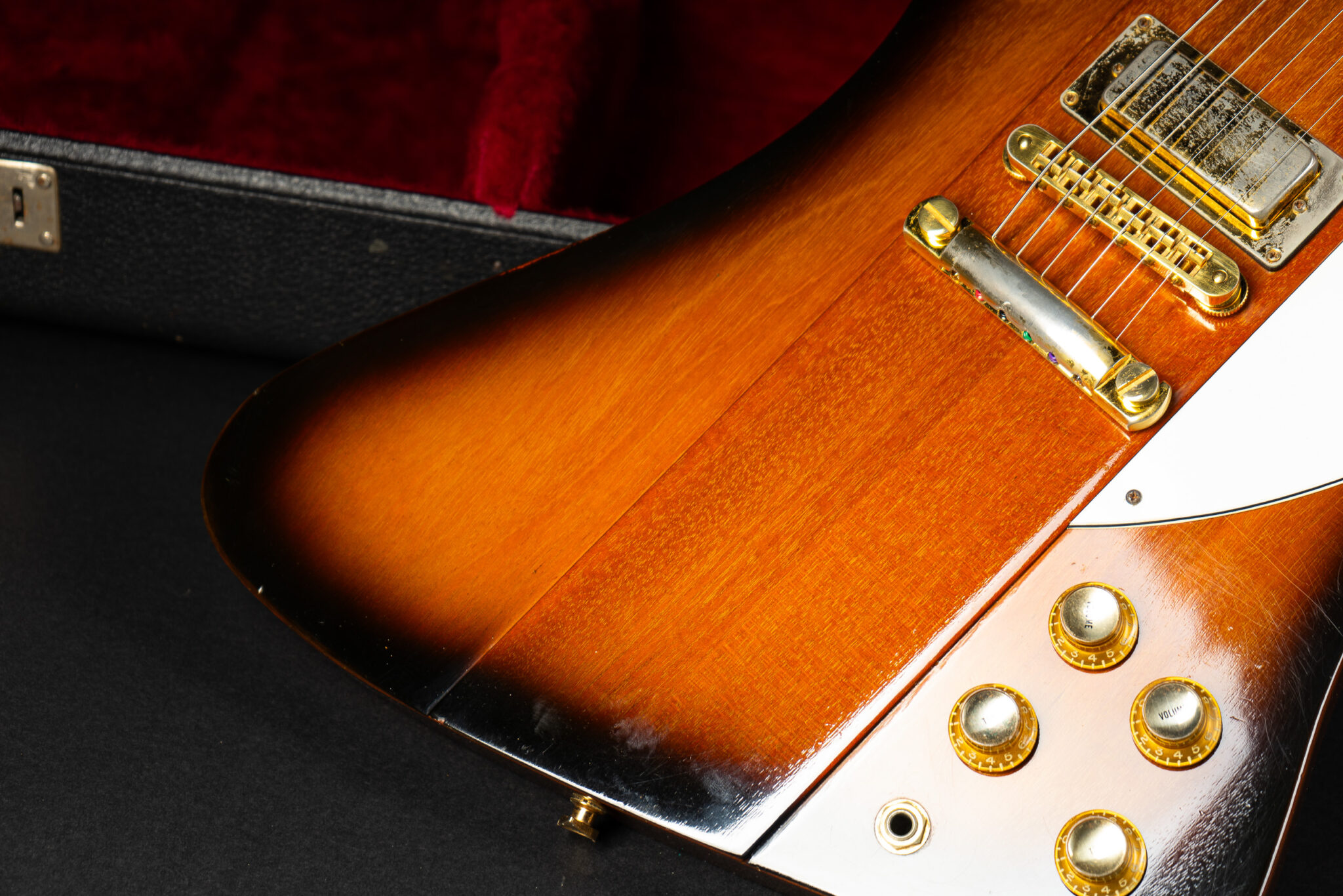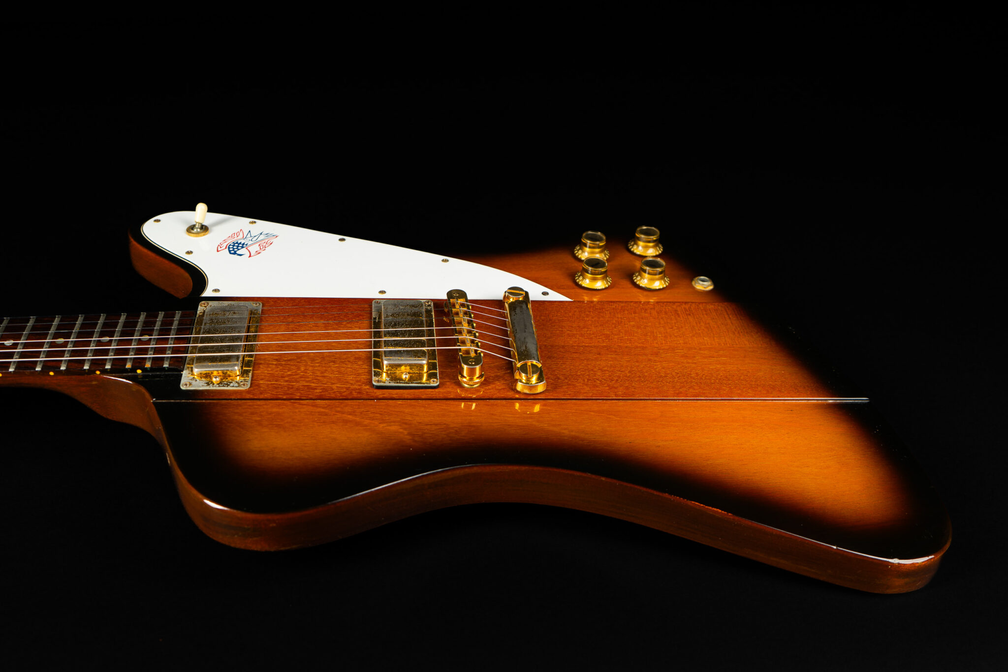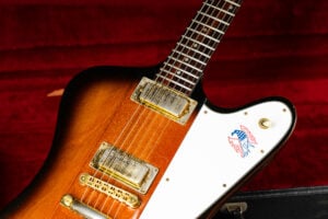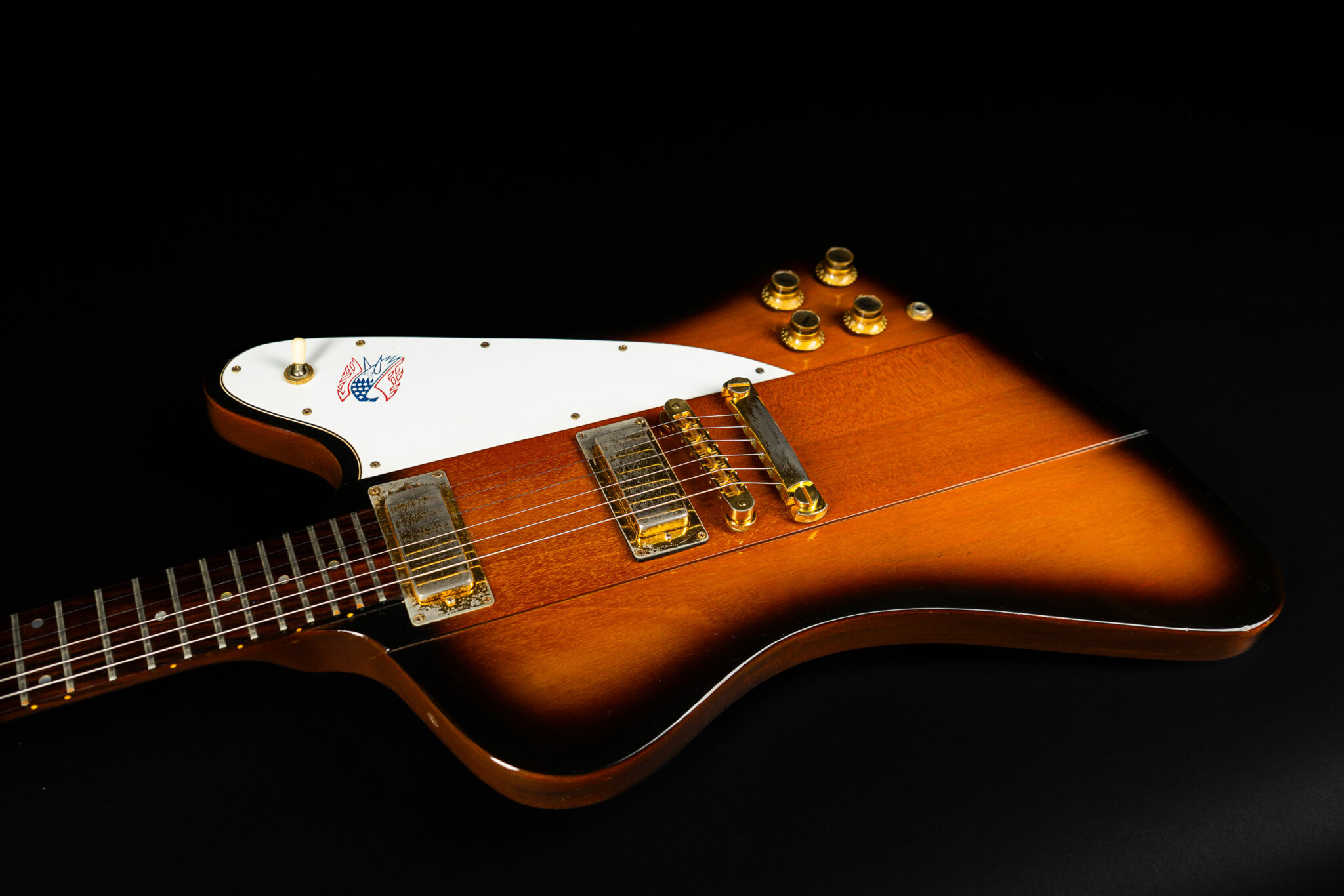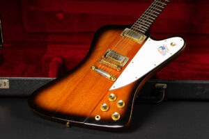 Super clean 1976 Gibson Firebird Bicentennial in classic Sunburst finish and all original (besides a hole from an added strap pin)! Besides some light wear it’s in excellent condition – really stunning instrument! It’s got a big round neck and is lightweight with only 3480g! Dream neck and amazing rock tone! Great low action and playability! Comes in its original black Gibson Firebird case.