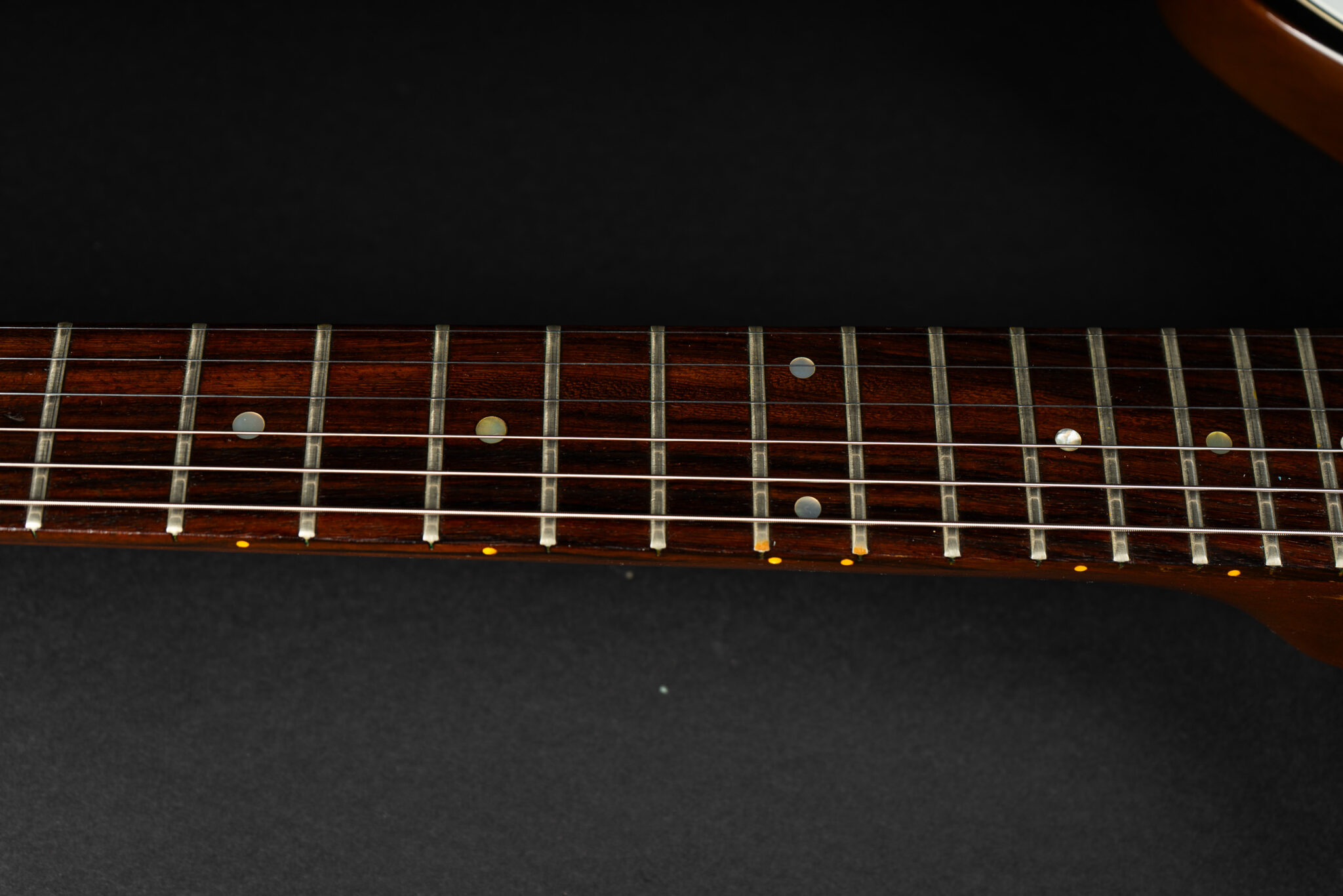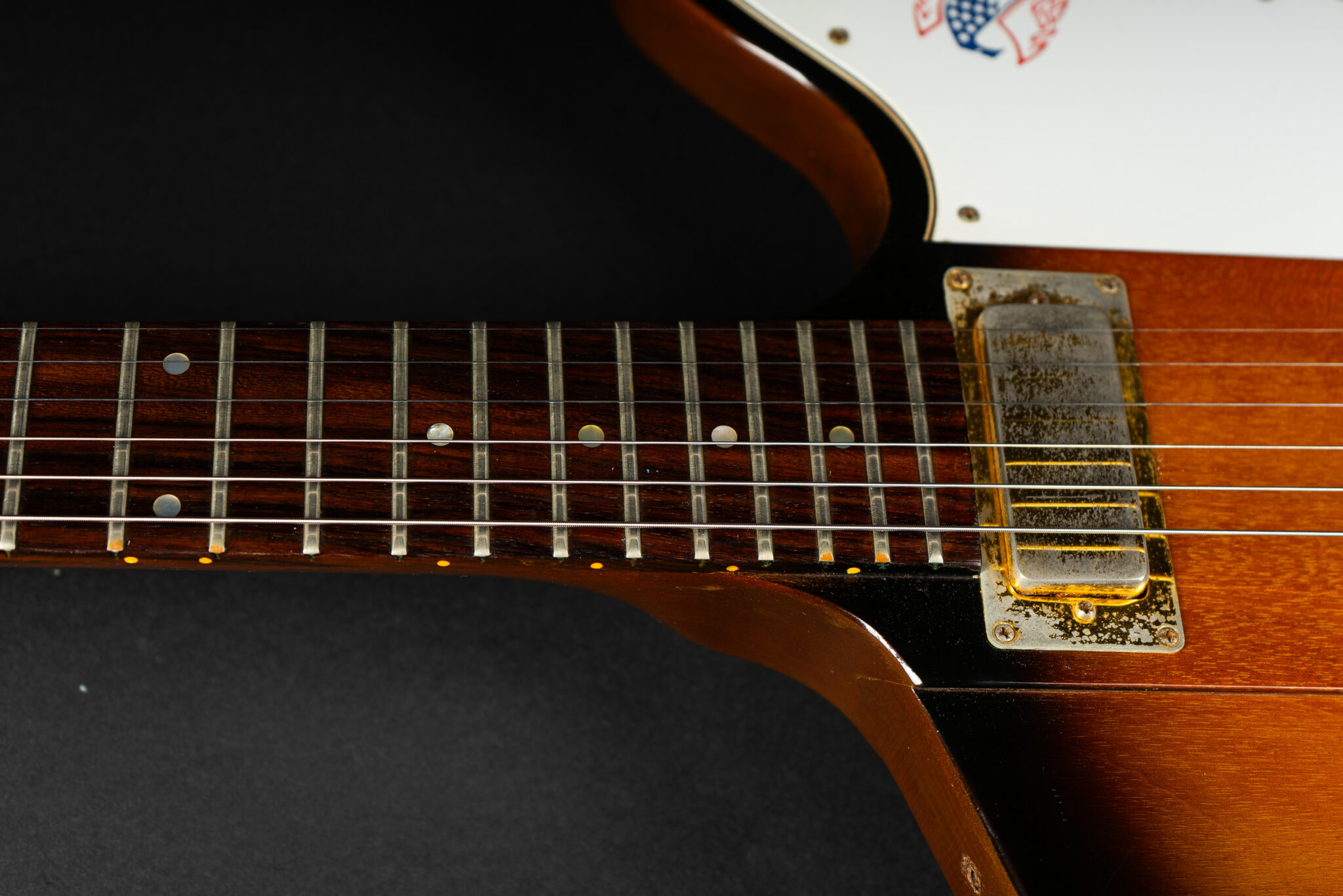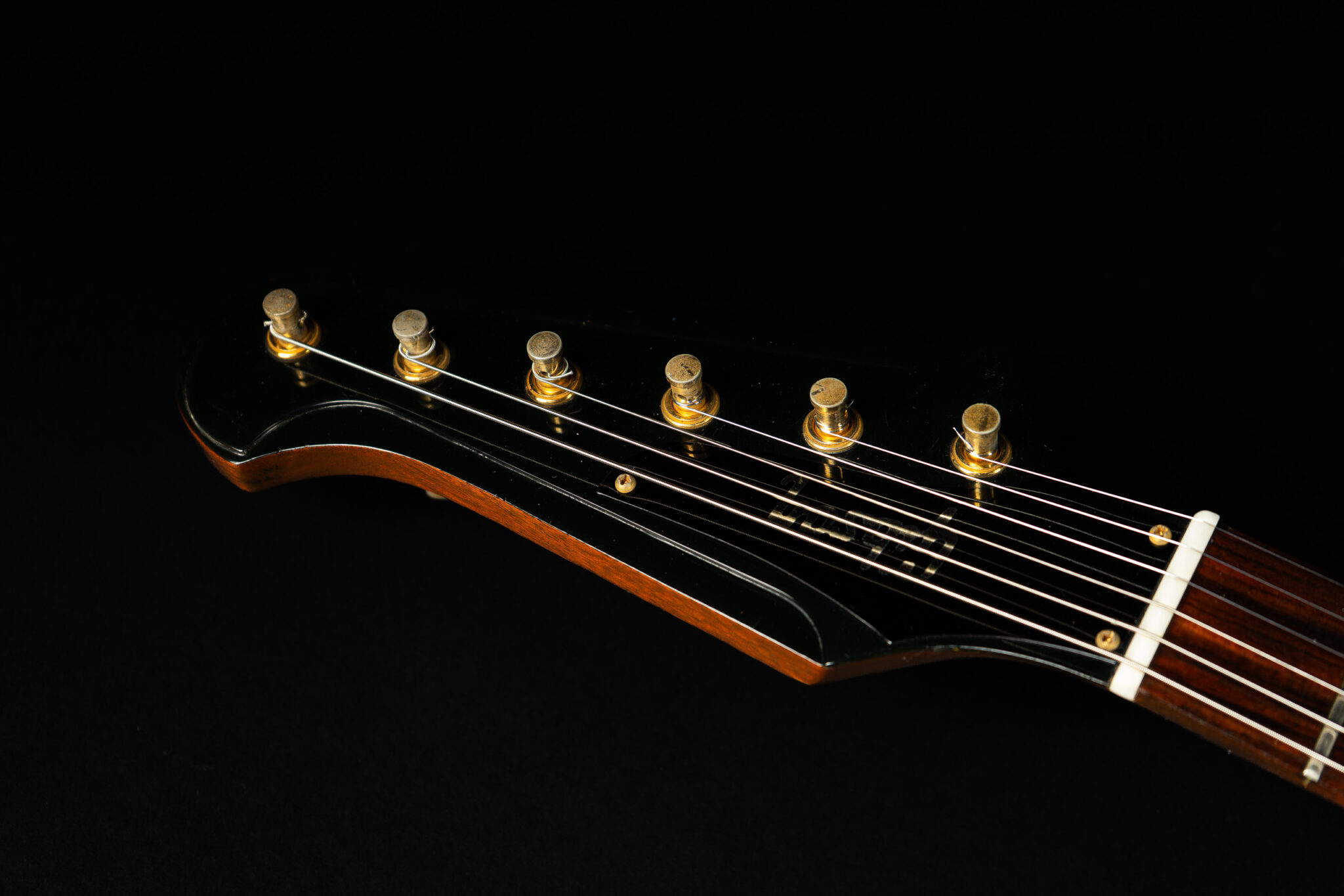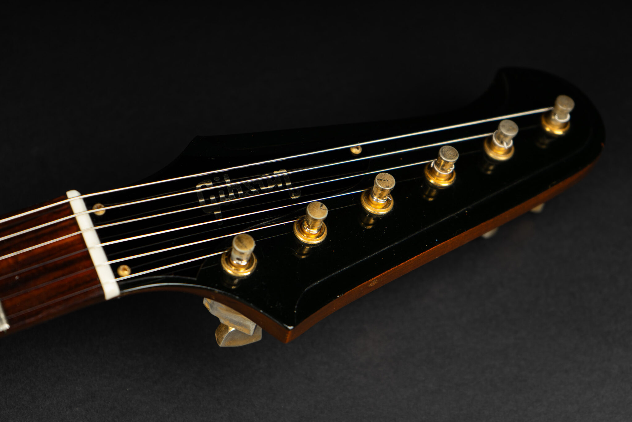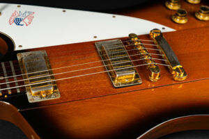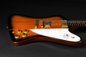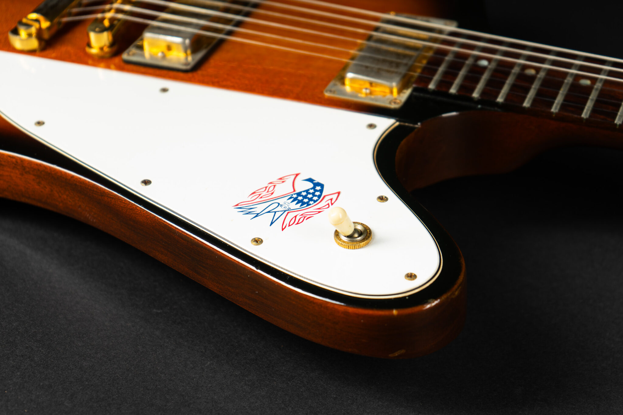 Super clean 1976 Gibson Firebird Bicentennial in classic Sunburst finish and all original (besides a hole from an added strap pin)! Besides some light wear it’s in excellent condition – really stunning instrument! It’s got a big round neck and is lightweight with only 3480g! Dream neck and amazing rock tone! Great low action and playability! Comes in its original black Gibson Firebird case.