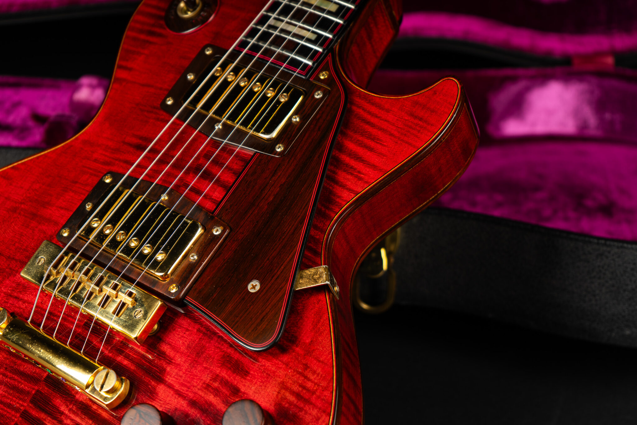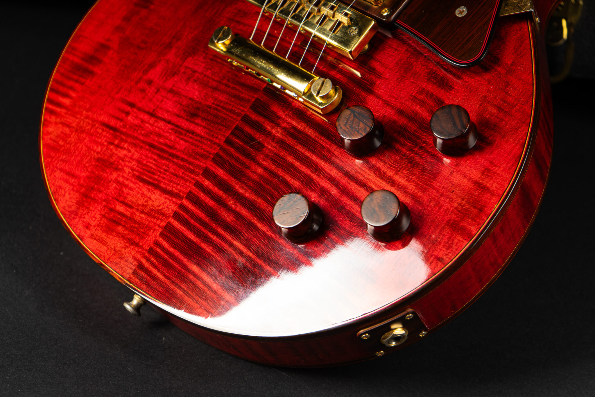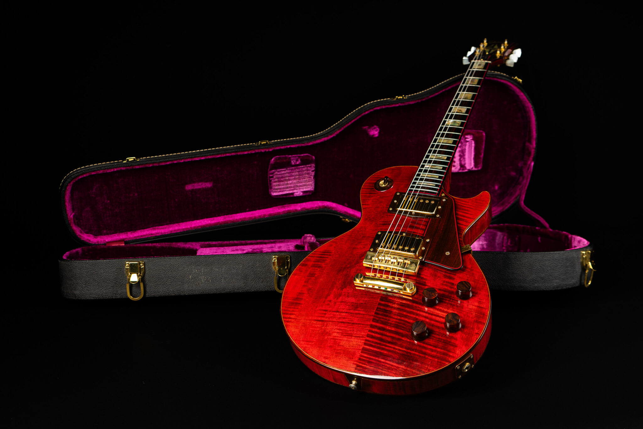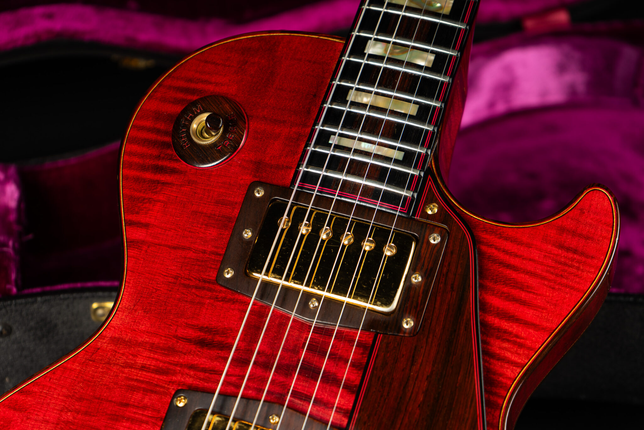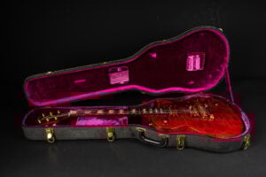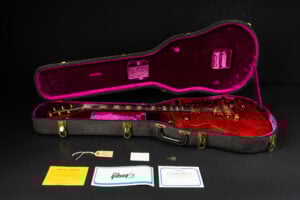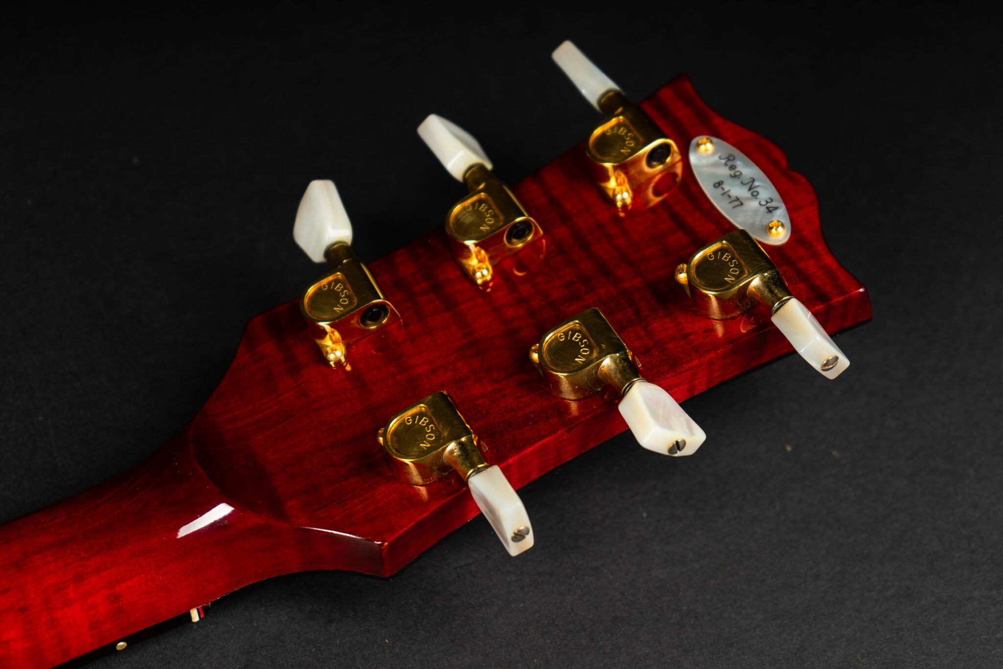 Introduced at the 1975 Namm Show as the ultimate Les Paul… produced from 1976 – 1979 “The Les Paul” is a unique piece of art and the top-of-the-line model of all 1970s Les Pauls! Made of specially sourced Austrian maple top, back and sides with a mahogany core, multiply wooden binding and hand made wooden parts the construction of this guitar is very complicated and the guitar was very expensive even back then ($3199 – which would be $17.200 today!) The fretboard is made of ebony and rosewood, the pickups are “Super Humbuckers”…only 77 have been poduced and only 18 are Wine Red – just like this wonderful example with Reg. No. 34. Since its an earlier/mid production model, serialized in August 1977, it still has all the wooden parts – since Gibson ran out of high quality material for this very special run, later models had plastic knobs or brass nuts. A highly collectible Les Paul, THE Les Paul – and the first Wine Red colored we’ve had. Comes with original case and warranty card.