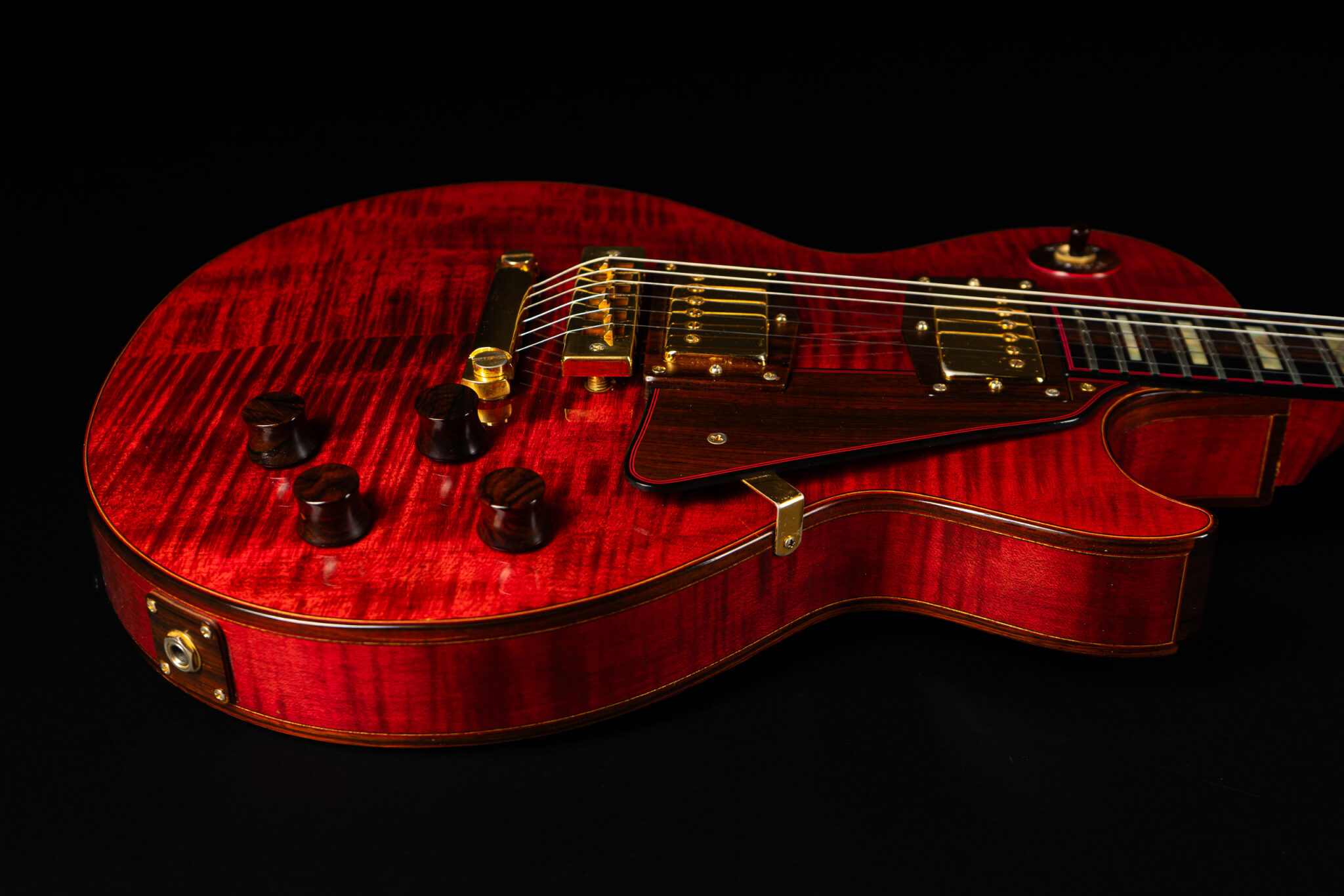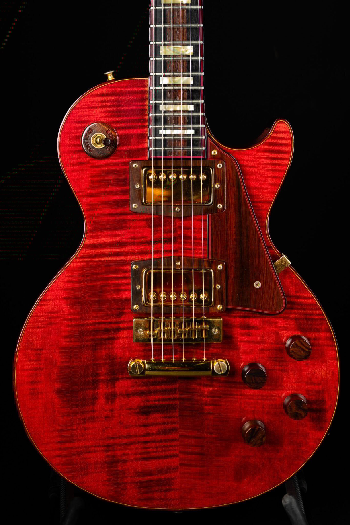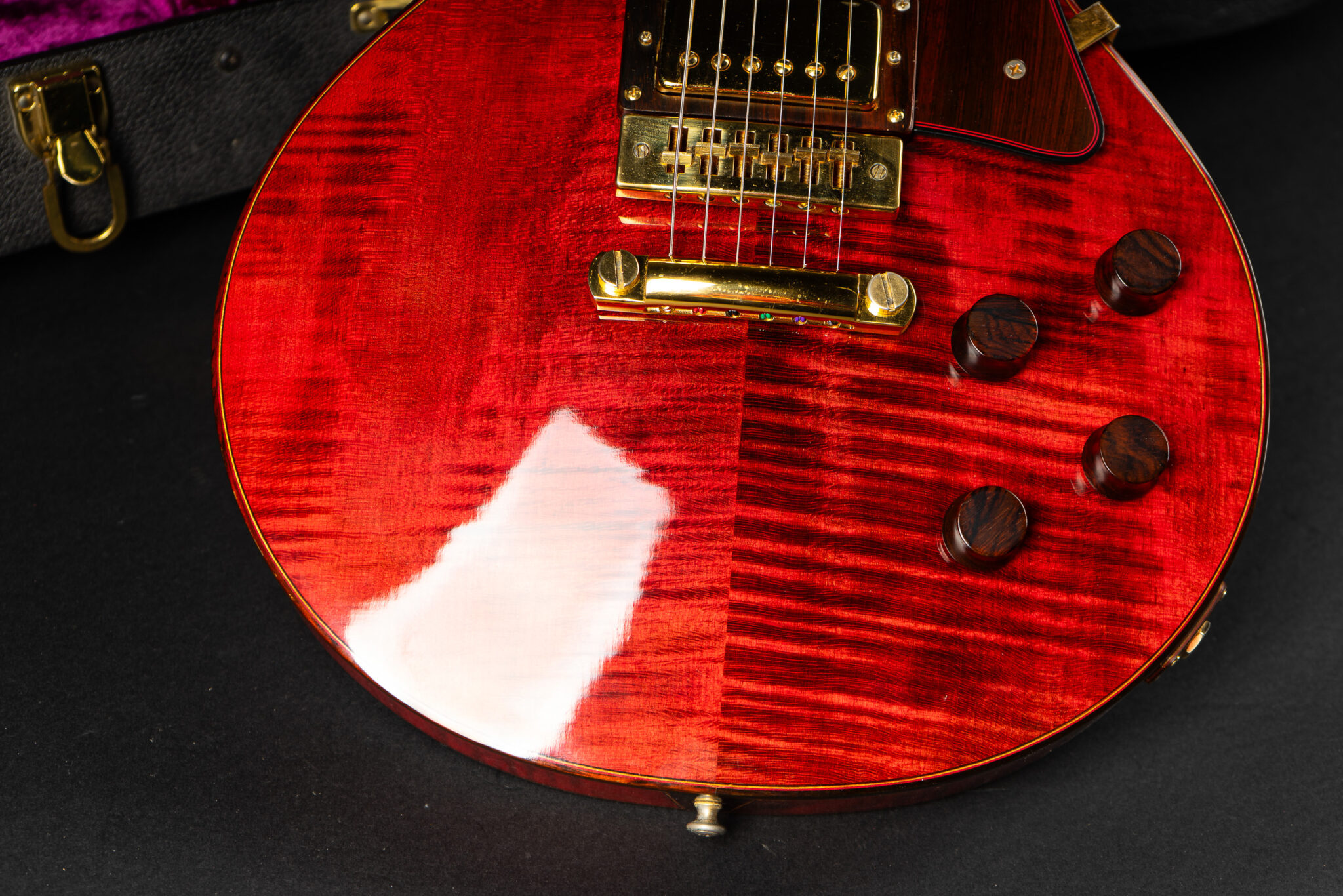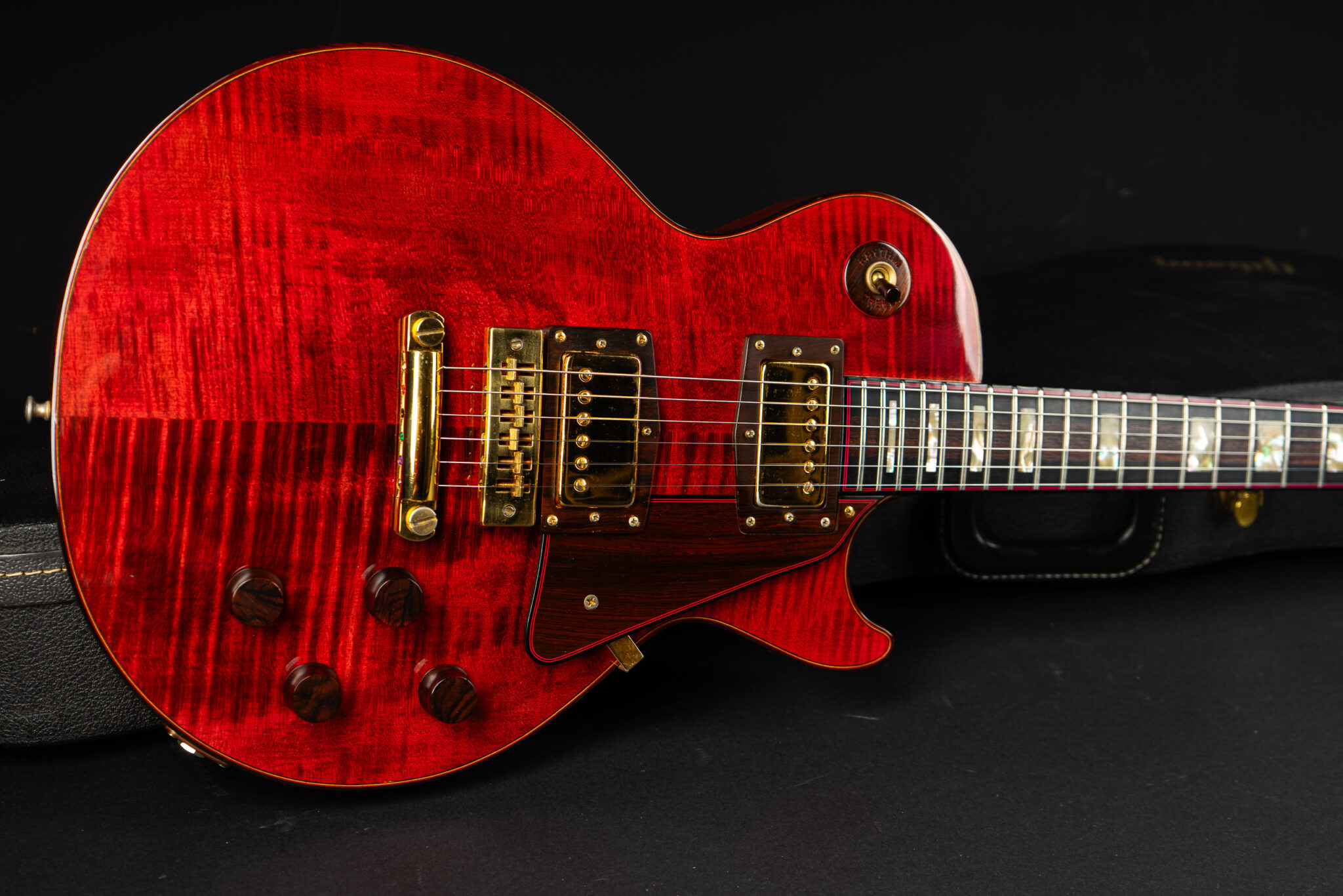 Introduced at the 1975 Namm Show as the ultimate Les Paul… produced from 1976 – 1979 “The Les Paul” is a unique piece of art and the top-of-the-line model of all 1970s Les Pauls! Made of specially sourced Austrian maple top, back and sides with a mahogany core, multiply wooden binding and hand made wooden parts the construction of this guitar is very complicated and the guitar was very expensive even back then ($3199 – which would be $17.200 today!) The fretboard is made of ebony and rosewood, the pickups are “Super Humbuckers”…only 77 have been poduced and only 18 are Wine Red – just like this wonderful example with Reg. No. 34. Since its an earlier/mid production model, serialized in August 1977, it still has all the wooden parts – since Gibson ran out of high quality material for this very special run, later models had plastic knobs or brass nuts. A highly collectible Les Paul, THE Les Paul – and the first Wine Red colored we’ve had. Comes with original case and warranty card.