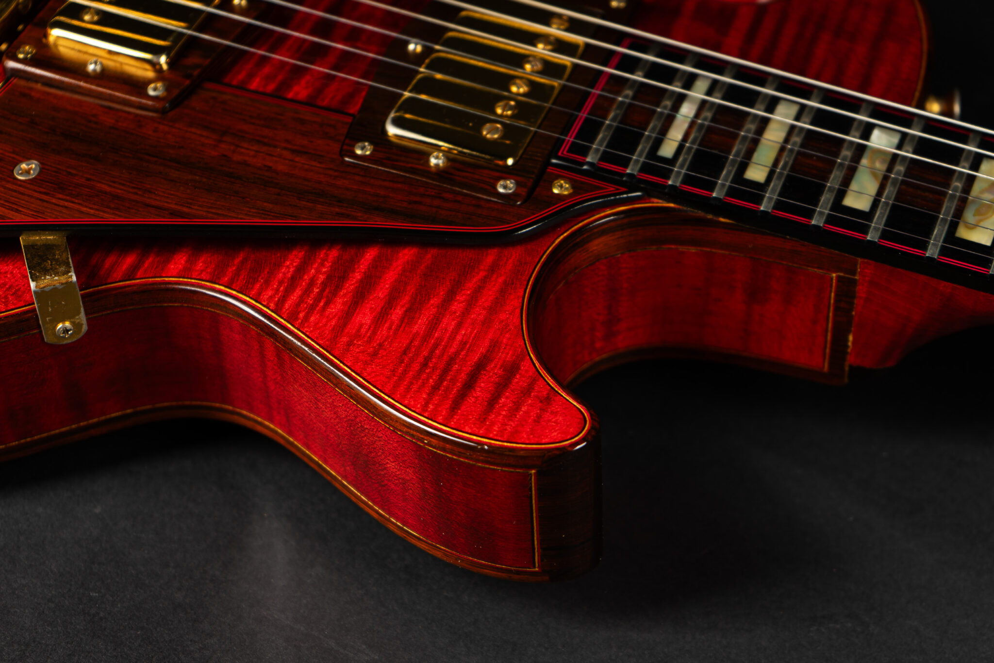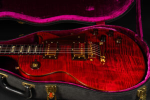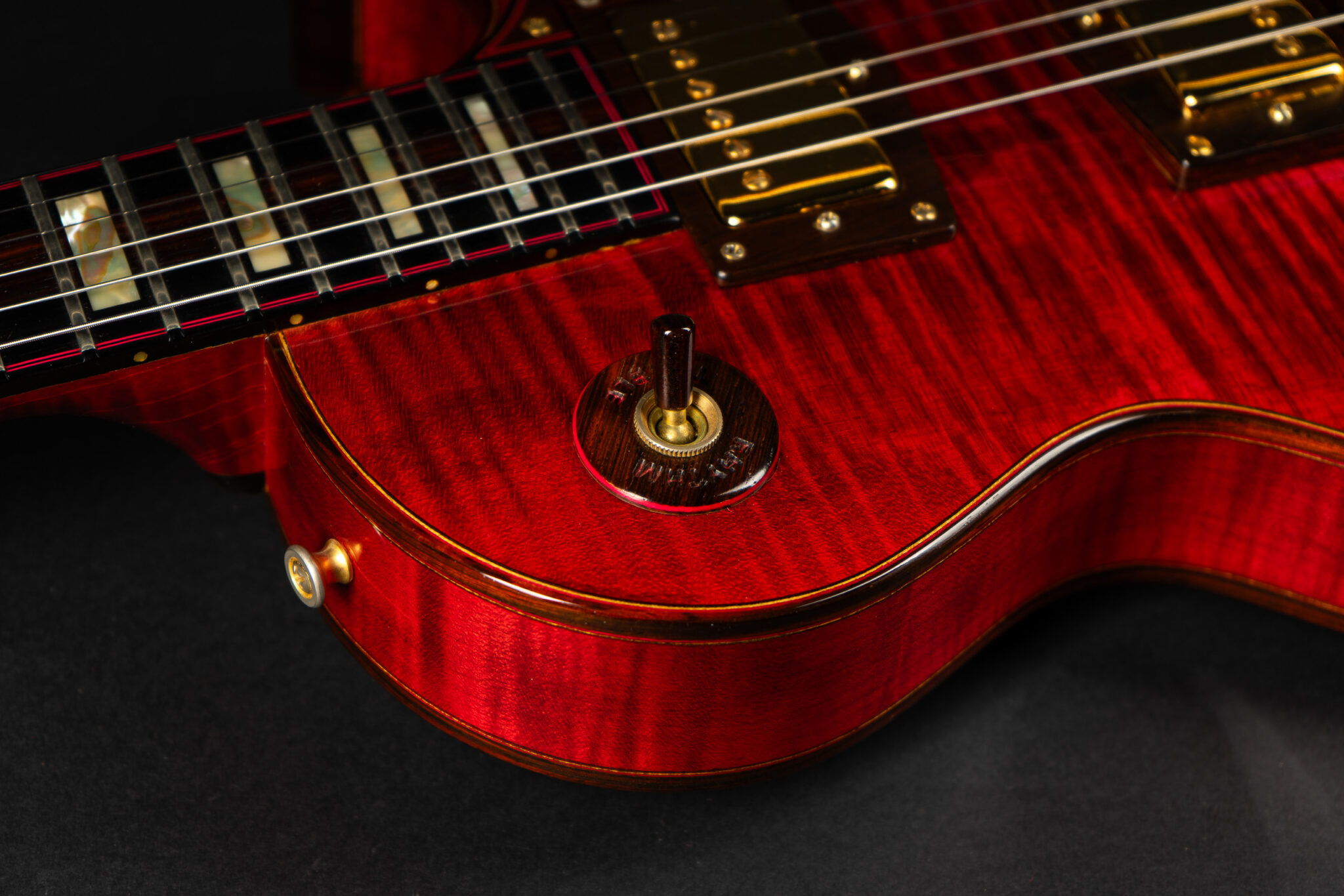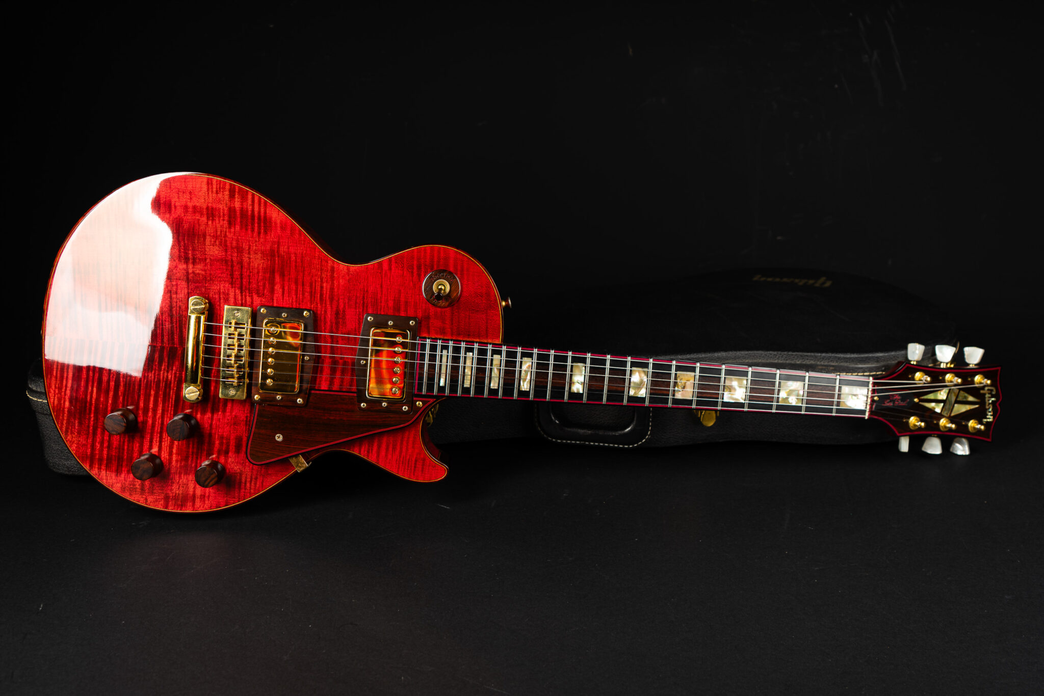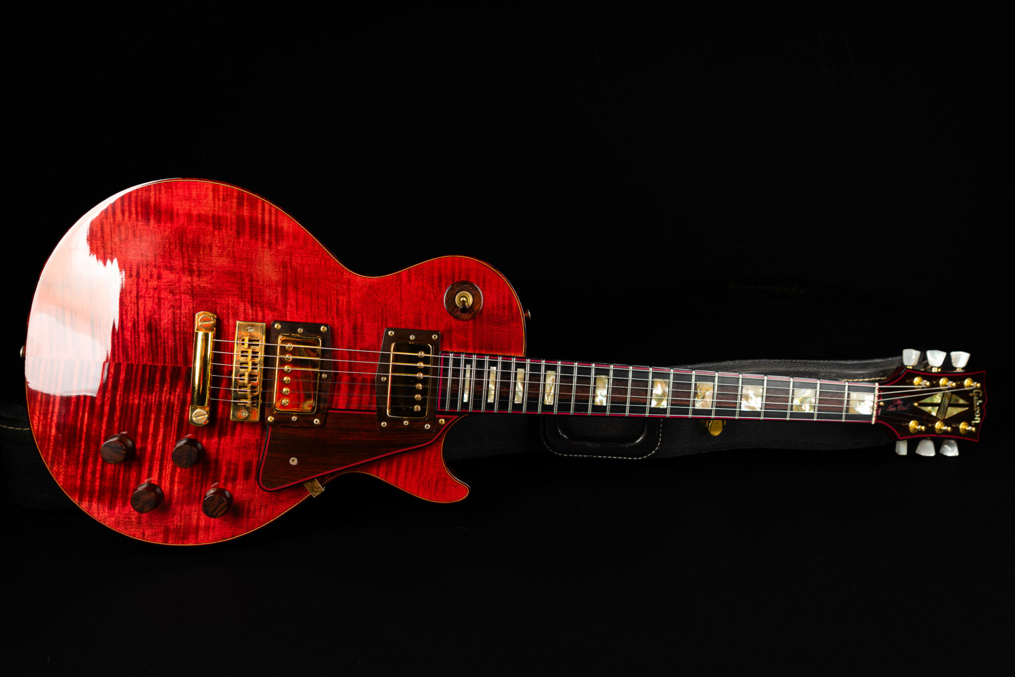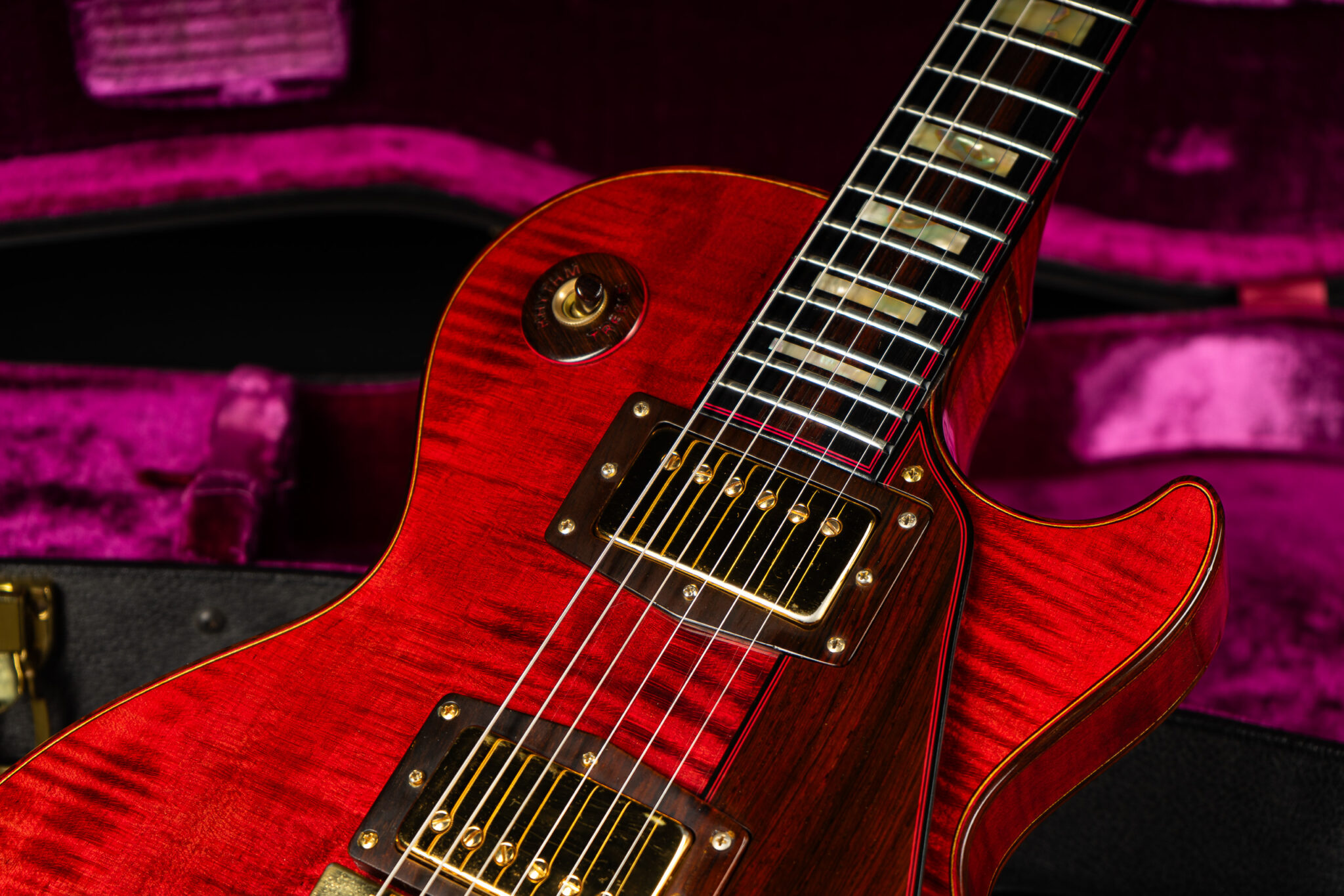 Introduced at the 1975 Namm Show as the ultimate Les Paul… produced from 1976 – 1979 “The Les Paul” is a unique piece of art and the top-of-the-line model of all 1970s Les Pauls! Made of specially sourced Austrian maple top, back and sides with a mahogany core, multiply wooden binding and hand made wooden parts the construction of this guitar is very complicated and the guitar was very expensive even back then ($3199 – which would be $17.200 today!) The fretboard is made of ebony and rosewood, the pickups are “Super Humbuckers”…only 77 have been poduced and only 18 are Wine Red – just like this wonderful example with Reg. No. 34. Since its an earlier/mid production model, serialized in August 1977, it still has all the wooden parts – since Gibson ran out of high quality material for this very special run, later models had plastic knobs or brass nuts. A highly collectible Les Paul, THE Les Paul – and the first Wine Red colored we’ve had. Comes with original case and warranty card.
