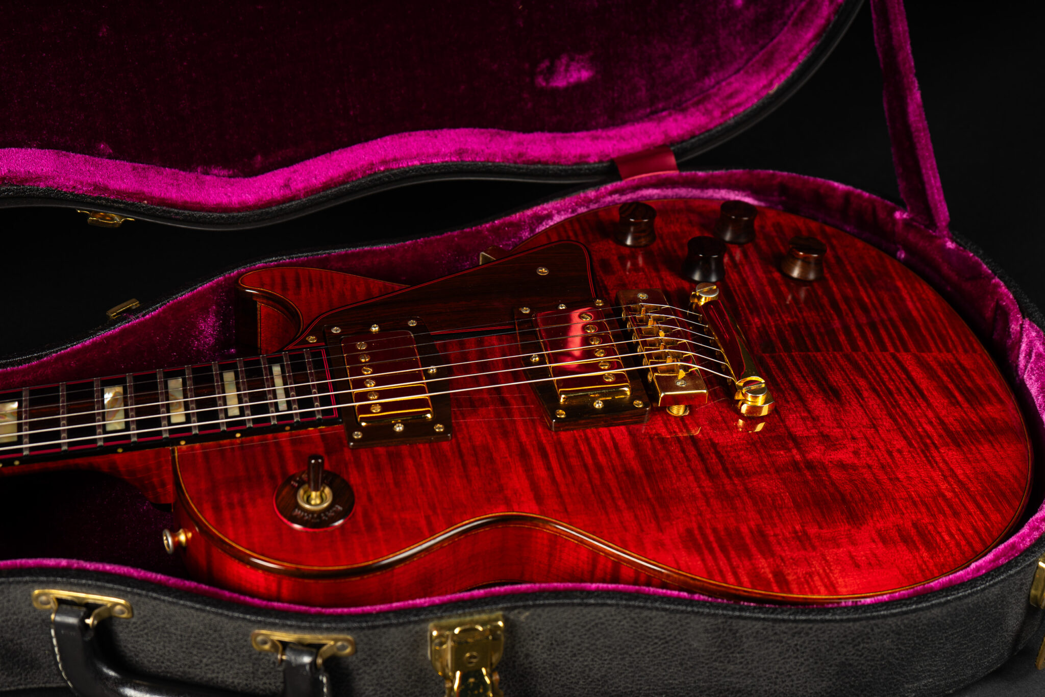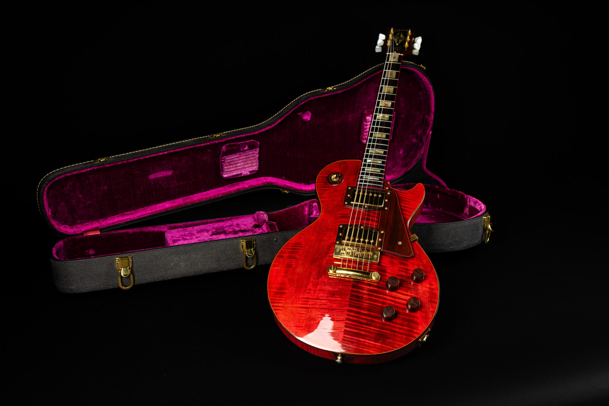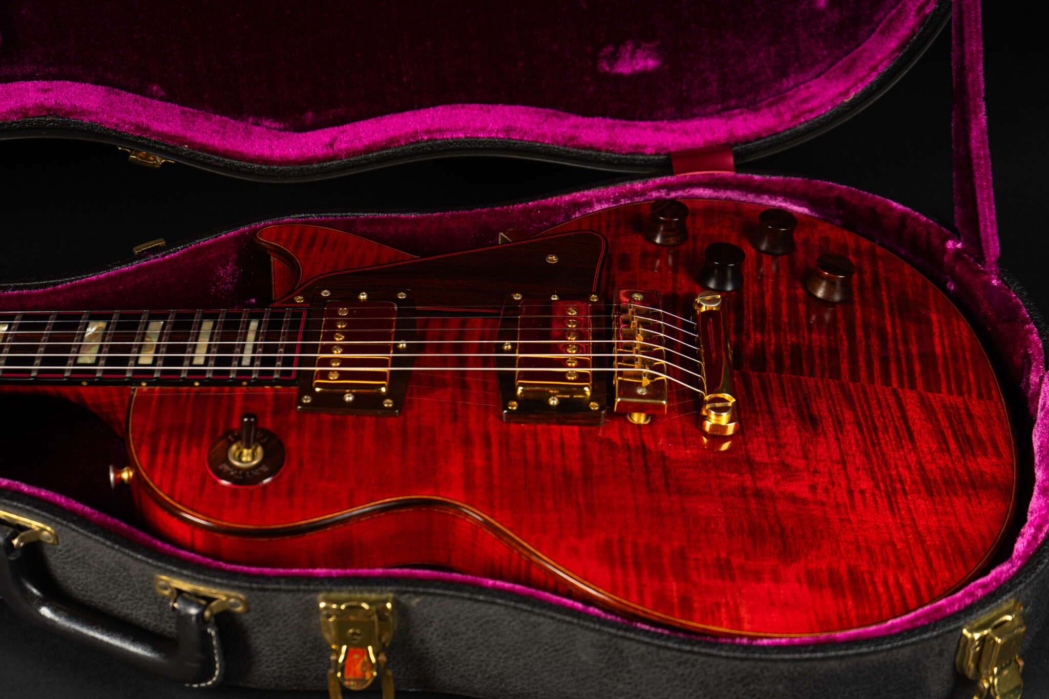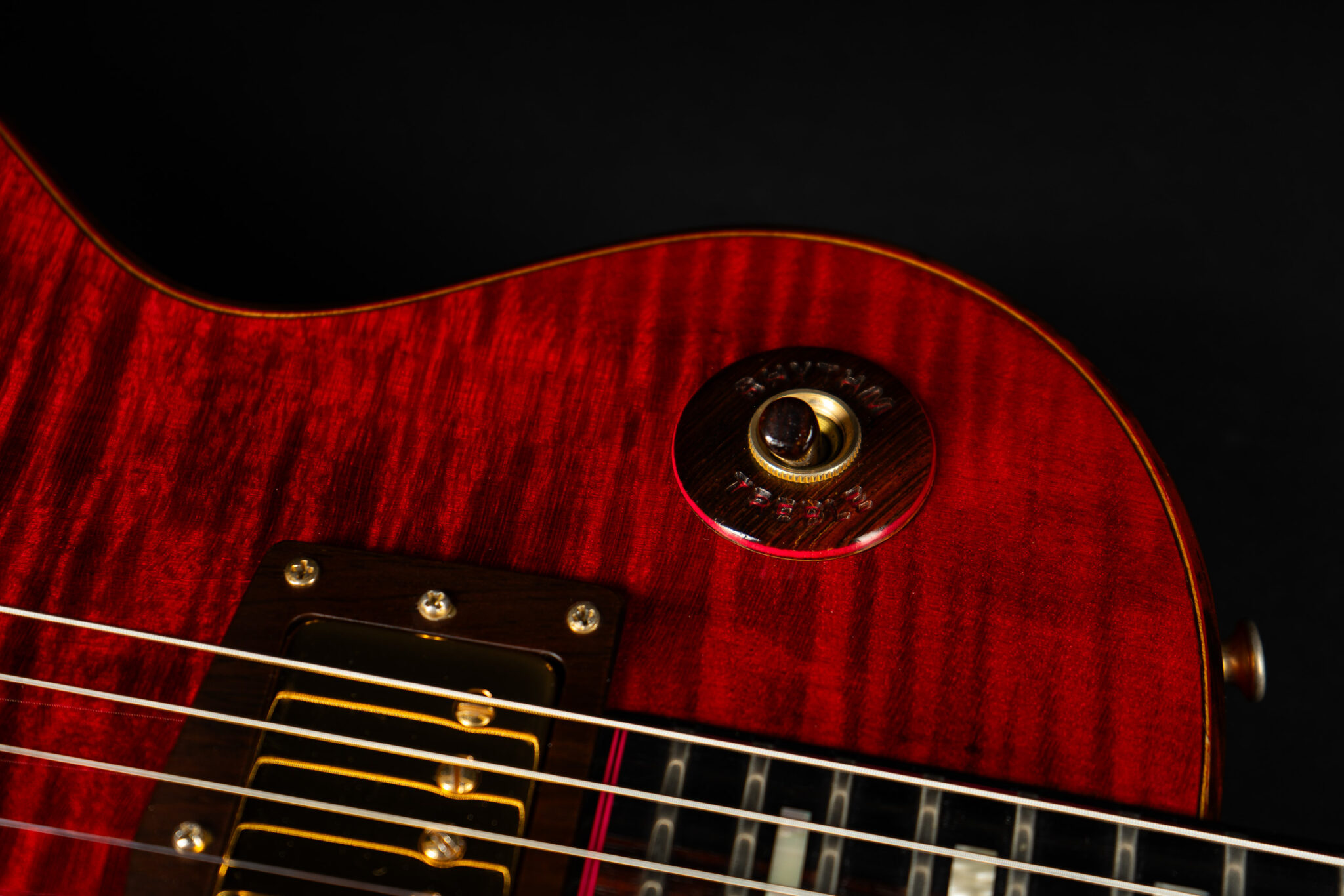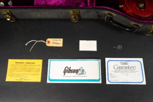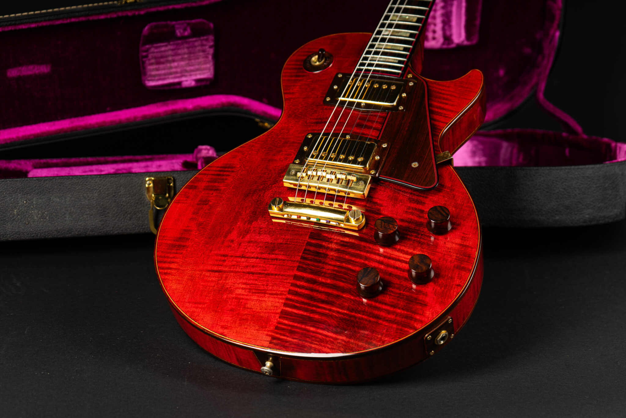 Introduced at the 1975 Namm Show as the ultimate Les Paul… produced from 1976 – 1979 “The Les Paul” is a unique piece of art and the top-of-the-line model of all 1970s Les Pauls! Made of specially sourced Austrian maple top, back and sides with a mahogany core, multiply wooden binding and hand made wooden parts the construction of this guitar is very complicated and the guitar was very expensive even back then ($3199 – which would be $17.200 today!) The fretboard is made of ebony and rosewood, the pickups are “Super Humbuckers”…only 77 have been poduced and only 18 are Wine Red – just like this wonderful example with Reg. No. 34. Since its an earlier/mid production model, serialized in August 1977, it still has all the wooden parts – since Gibson ran out of high quality material for this very special run, later models had plastic knobs or brass nuts. A highly collectible Les Paul, THE Les Paul – and the first Wine Red colored we’ve had. Comes with original case and warranty card.