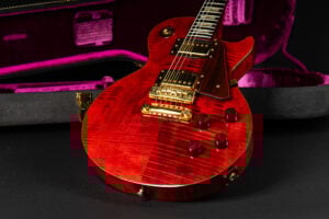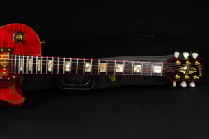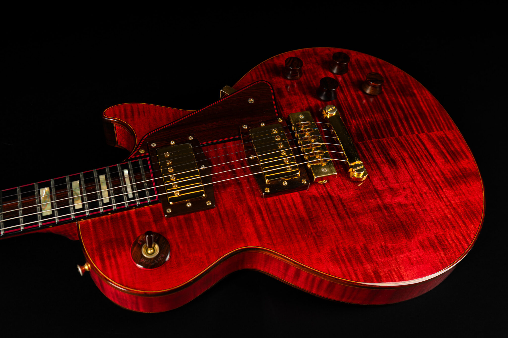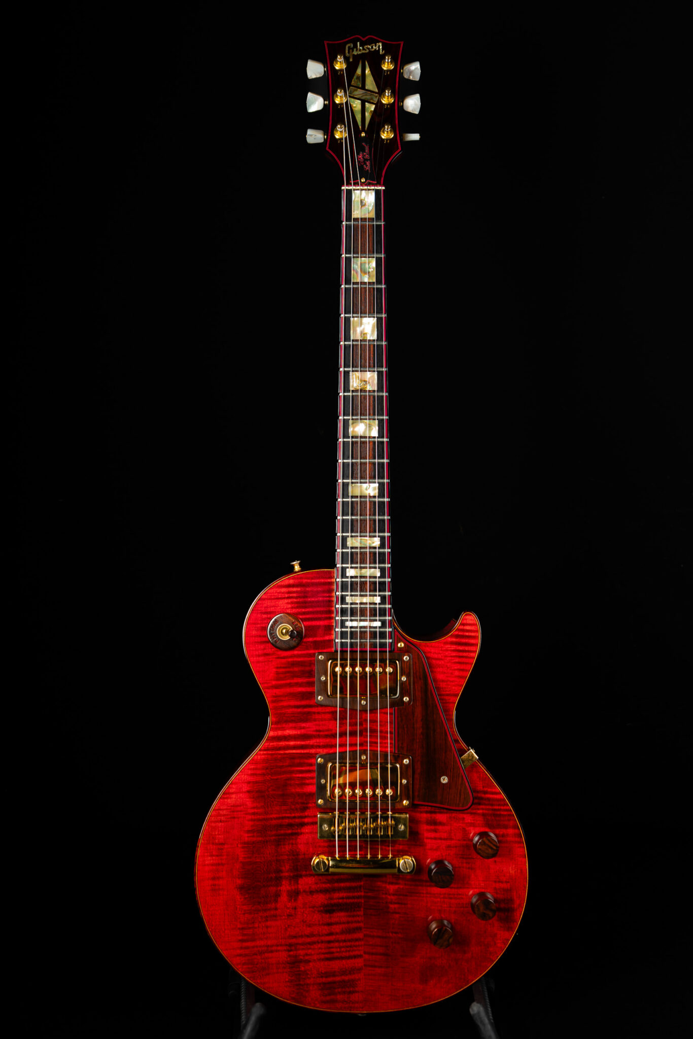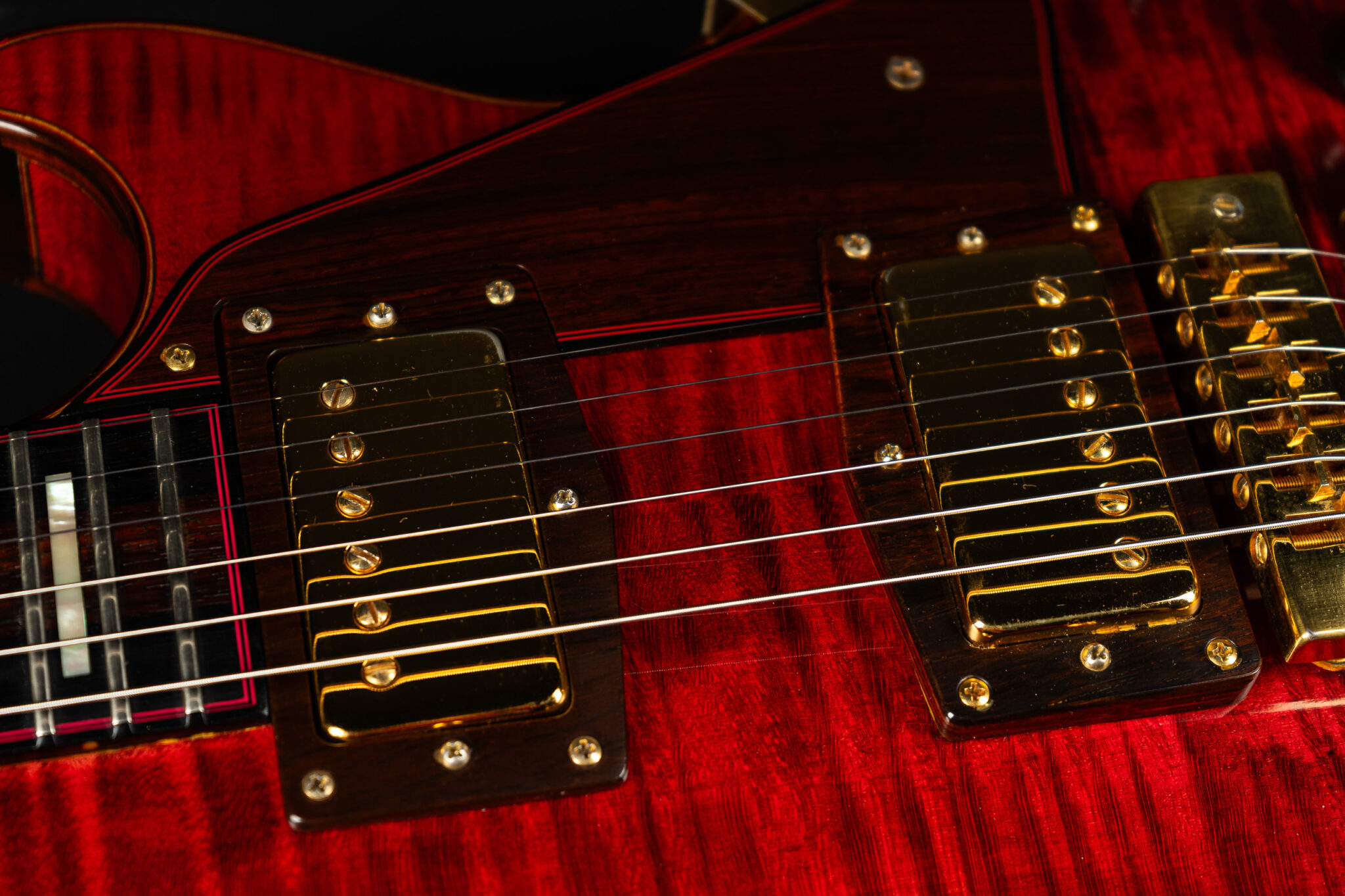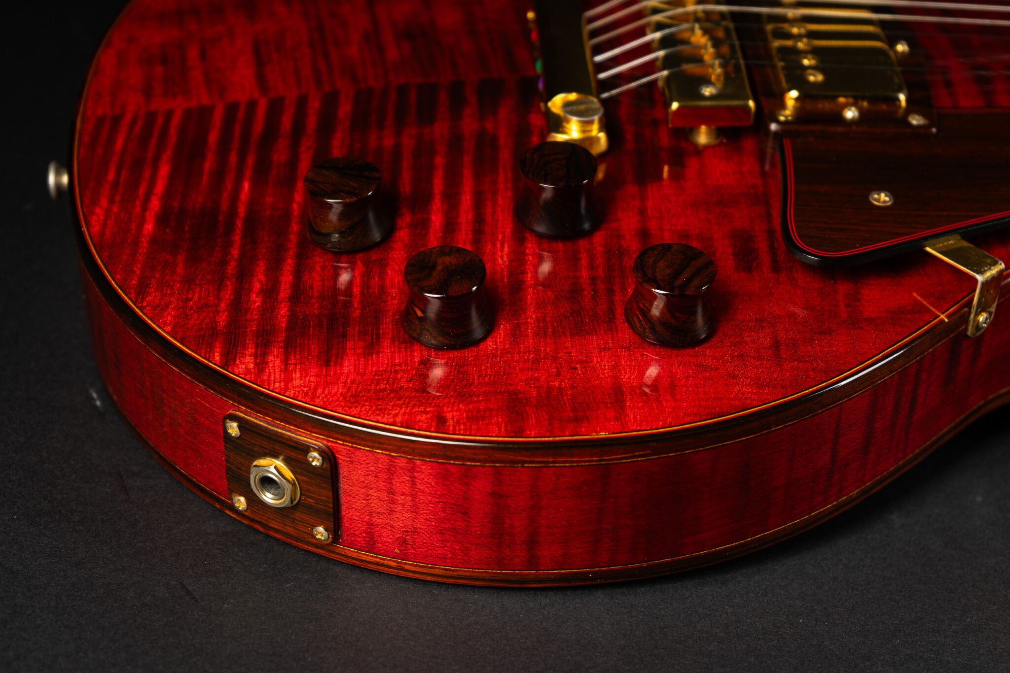 Introduced at the 1975 Namm Show as the ultimate Les Paul… produced from 1976 – 1979 “The Les Paul” is a unique piece of art and the top-of-the-line model of all 1970s Les Pauls! Made of specially sourced Austrian maple top, back and sides with a mahogany core, multiply wooden binding and hand made wooden parts the construction of this guitar is very complicated and the guitar was very expensive even back then ($3199 – which would be $17.200 today!) The fretboard is made of ebony and rosewood, the pickups are “Super Humbuckers”…only 77 have been poduced and only 18 are Wine Red – just like this wonderful example with Reg. No. 34. Since its an earlier/mid production model, serialized in August 1977, it still has all the wooden parts – since Gibson ran out of high quality material for this very special run, later models had plastic knobs or brass nuts. A highly collectible Les Paul, THE Les Paul – and the first Wine Red colored we’ve had. Comes with original case and warranty card.
