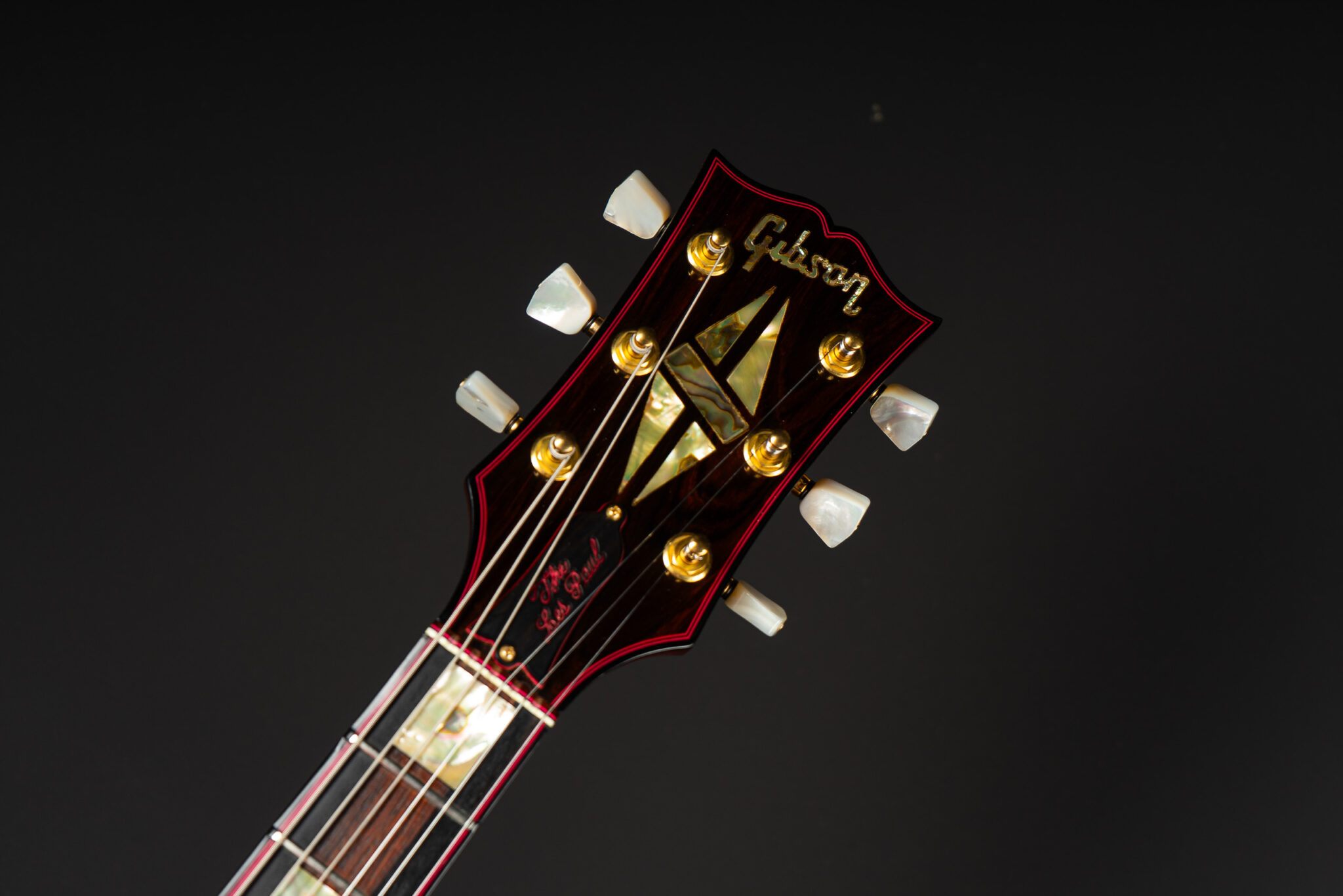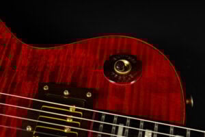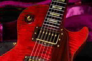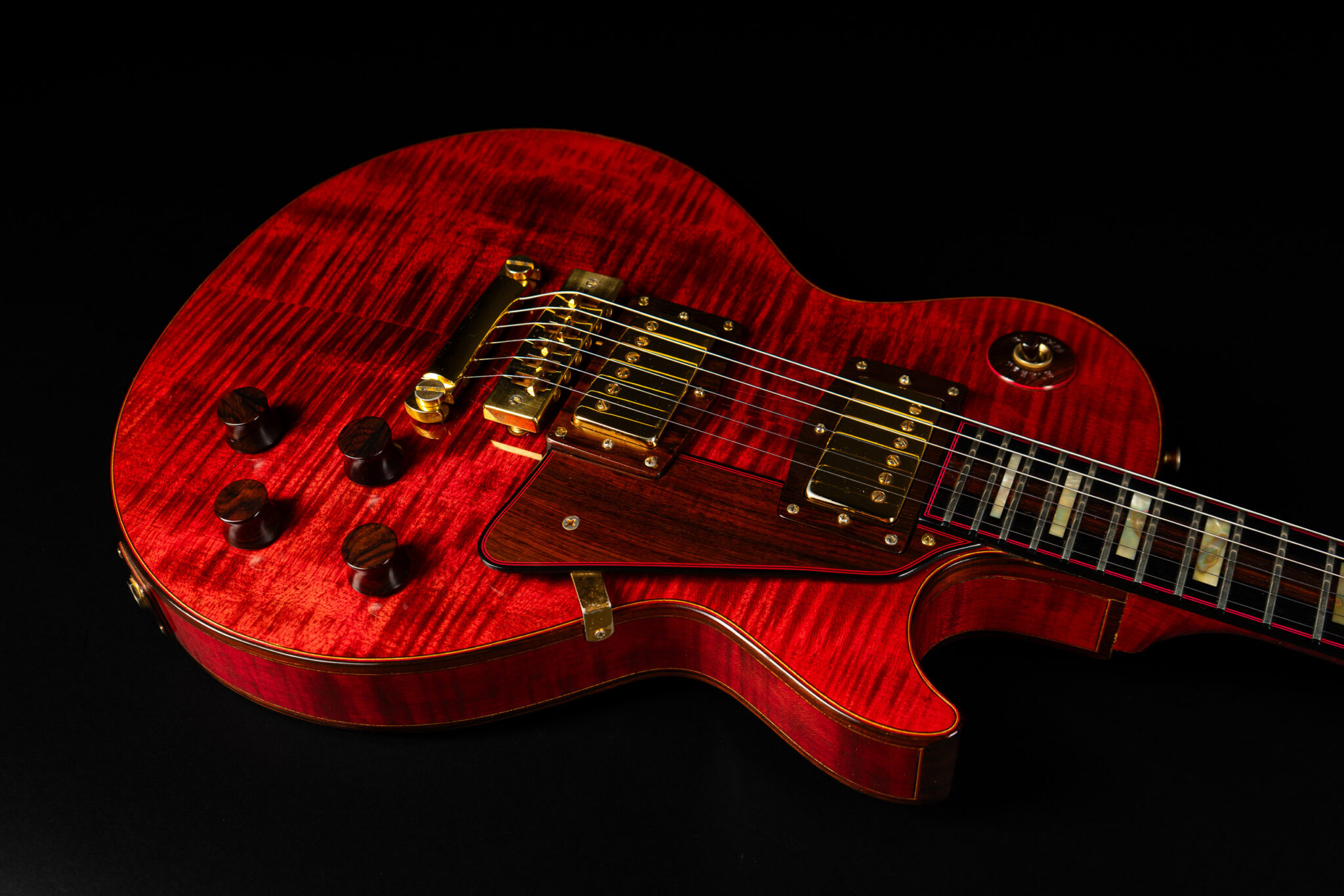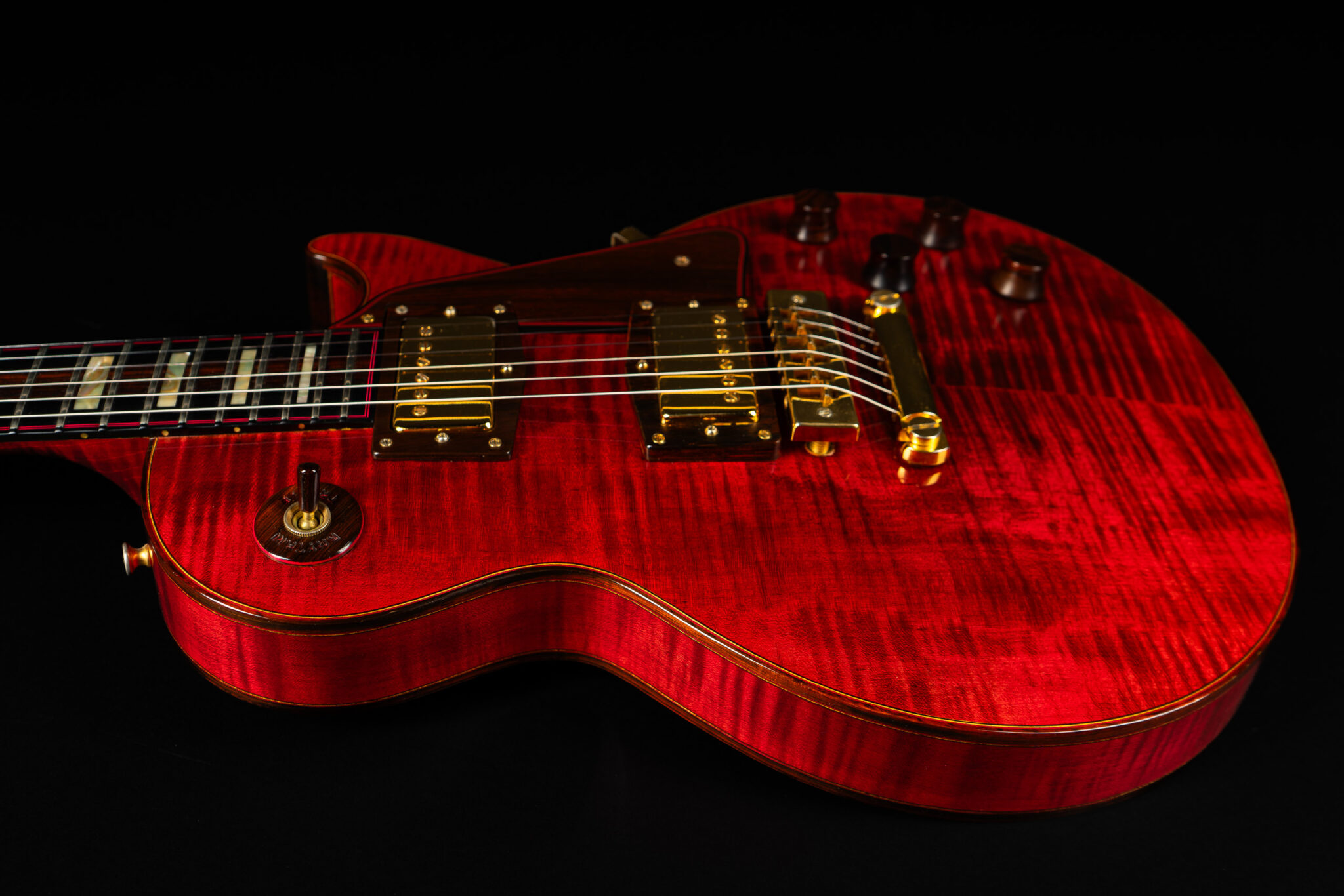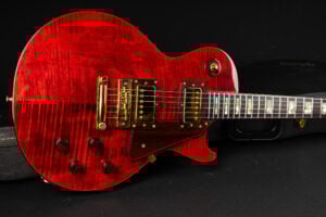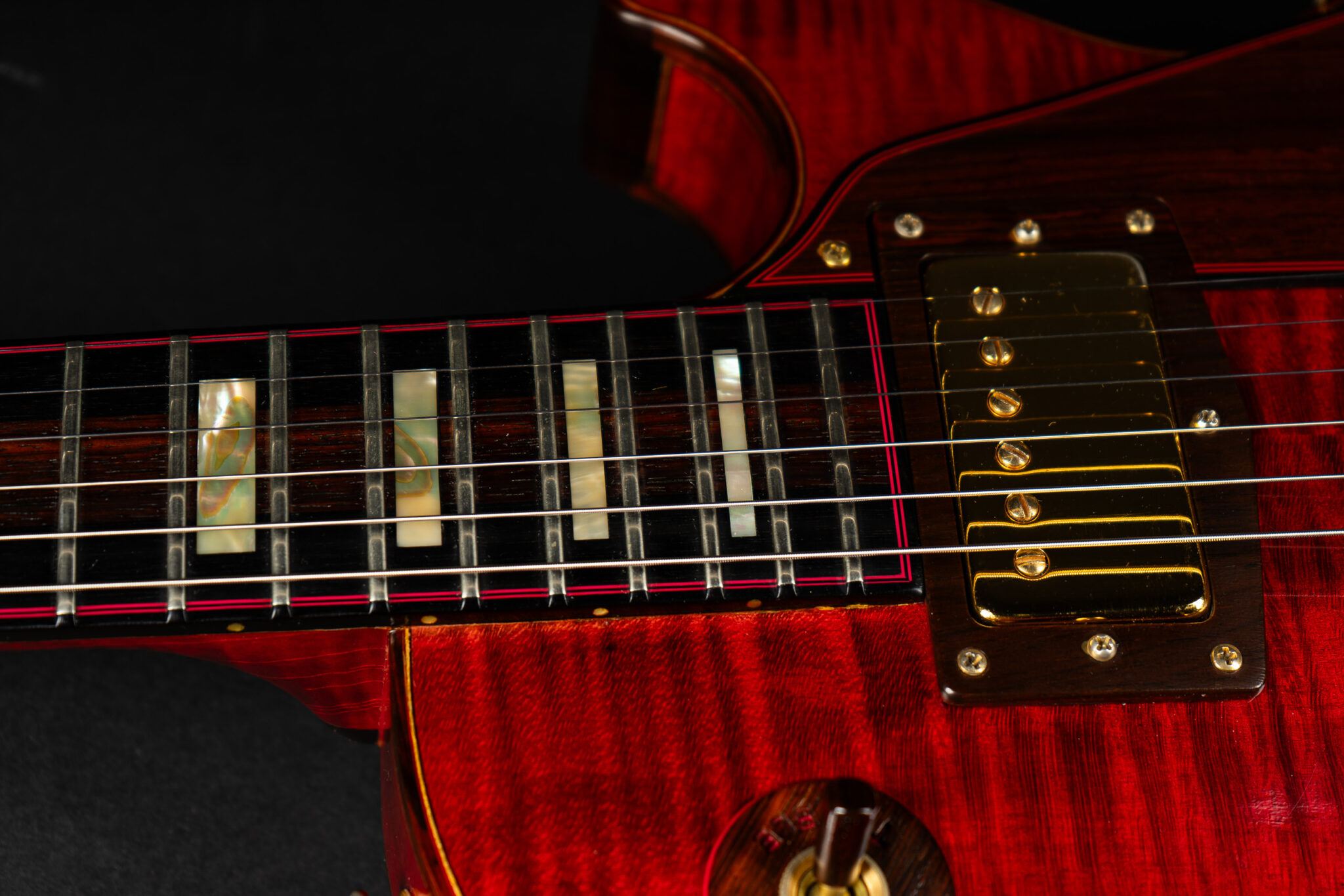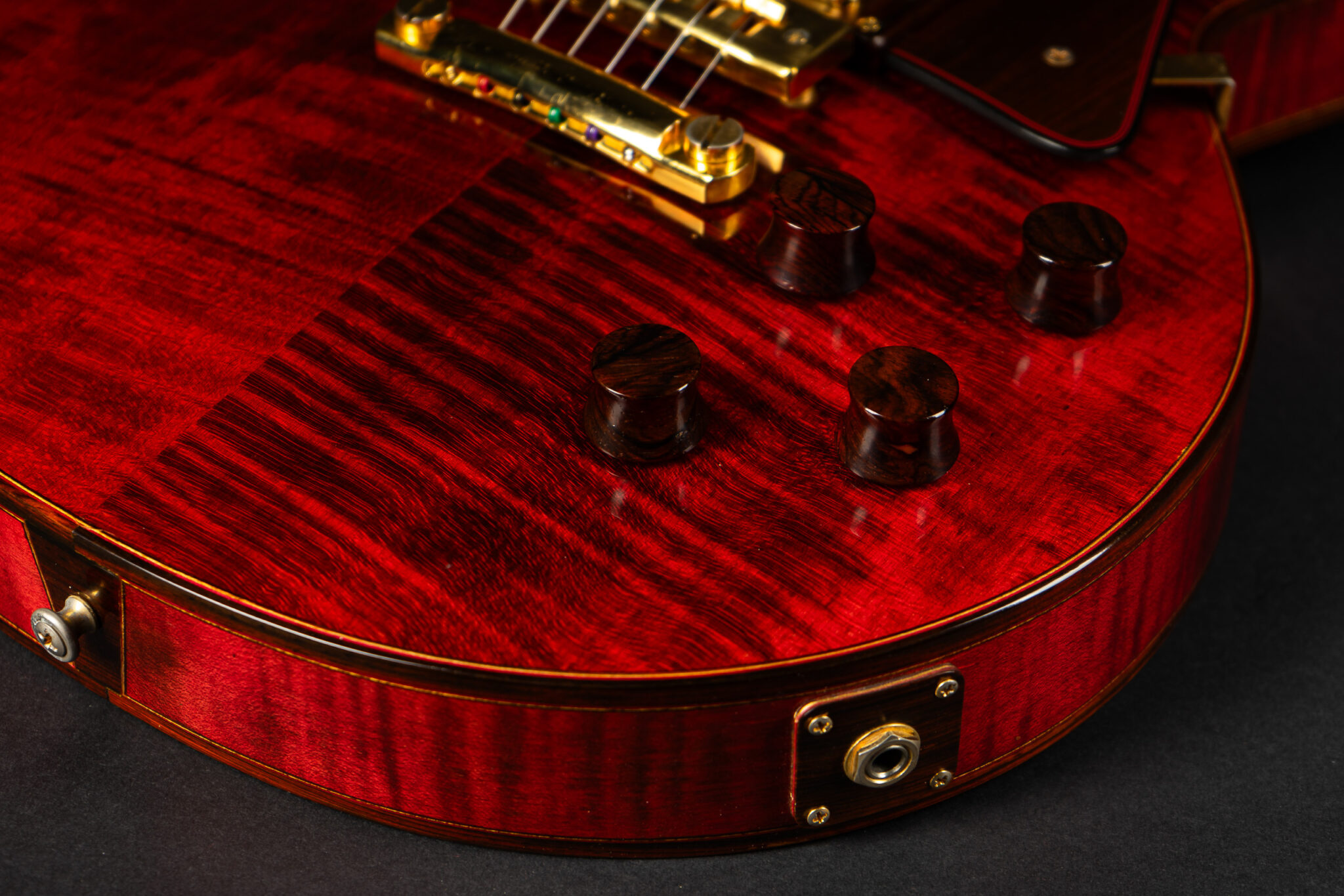 Introduced at the 1975 Namm Show as the ultimate Les Paul… produced from 1976 – 1979 “The Les Paul” is a unique piece of art and the top-of-the-line model of all 1970s Les Pauls! Made of specially sourced Austrian maple top, back and sides with a mahogany core, multiply wooden binding and hand made wooden parts the construction of this guitar is very complicated and the guitar was very expensive even back then ($3199 – which would be $17.200 today!) The fretboard is made of ebony and rosewood, the pickups are “Super Humbuckers”…only 77 have been poduced and only 18 are Wine Red – just like this wonderful example with Reg. No. 34. Since its an earlier/mid production model, serialized in August 1977, it still has all the wooden parts – since Gibson ran out of high quality material for this very special run, later models had plastic knobs or brass nuts. A highly collectible Les Paul, THE Les Paul – and the first Wine Red colored we’ve had. Comes with original case and warranty card.
