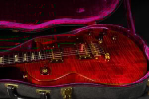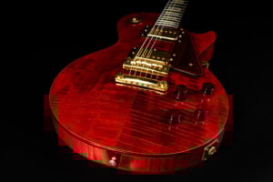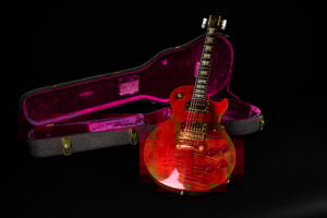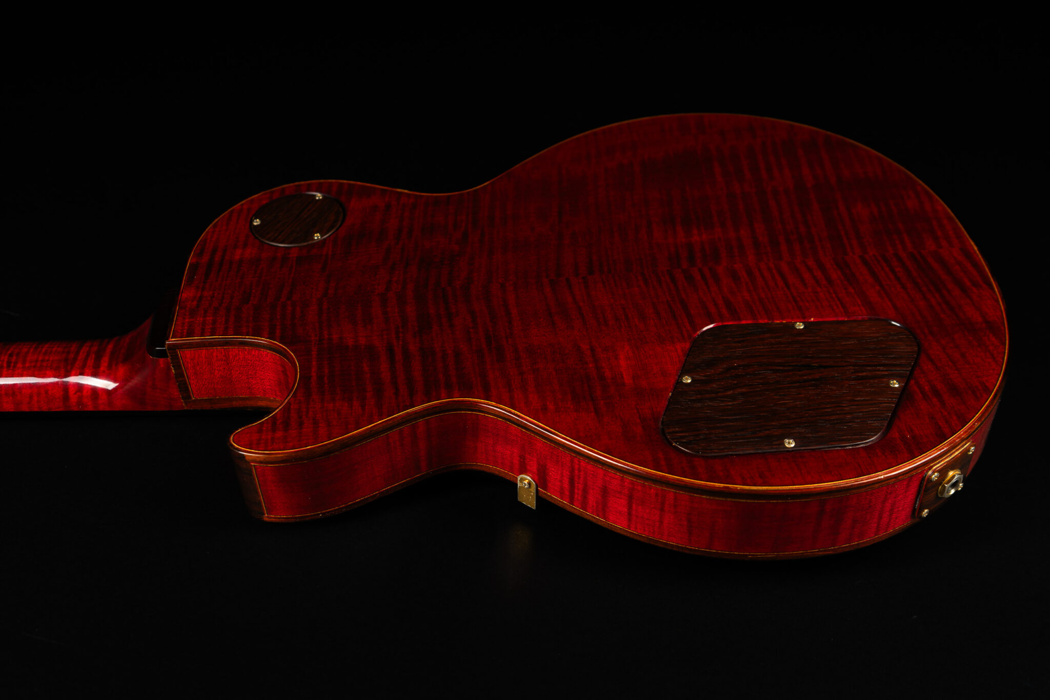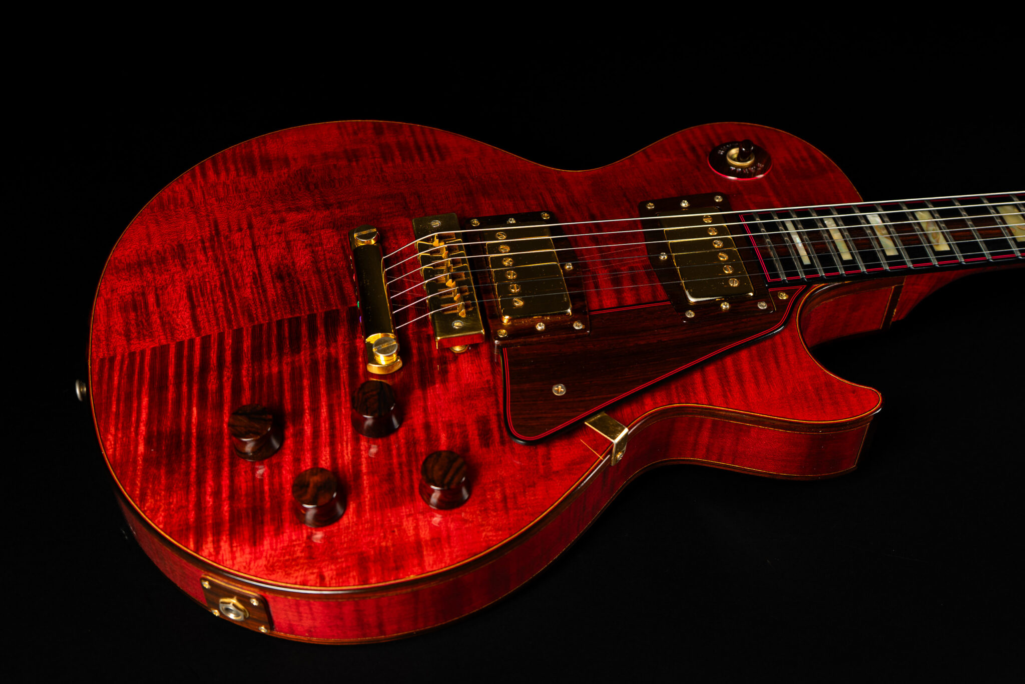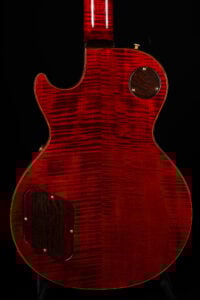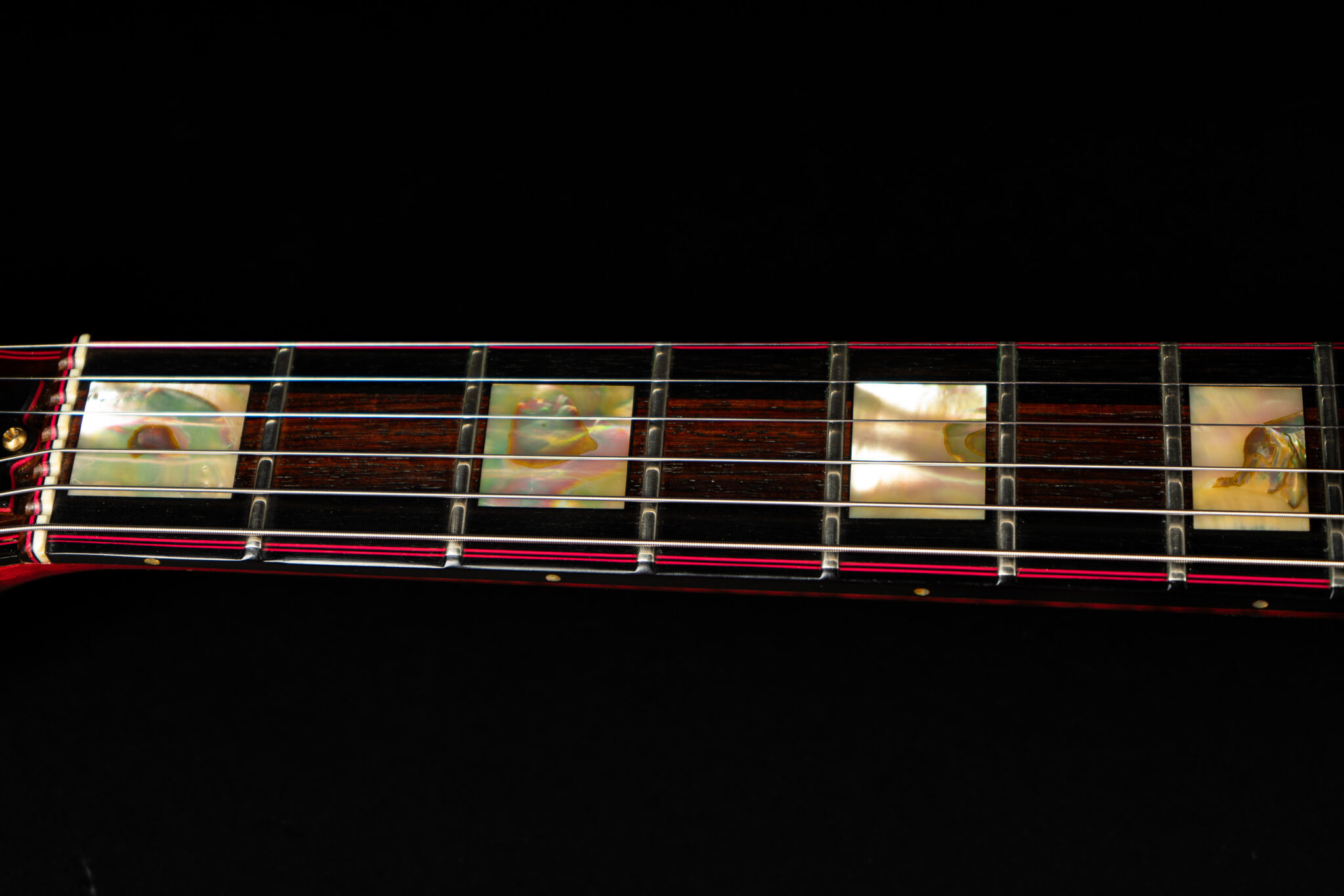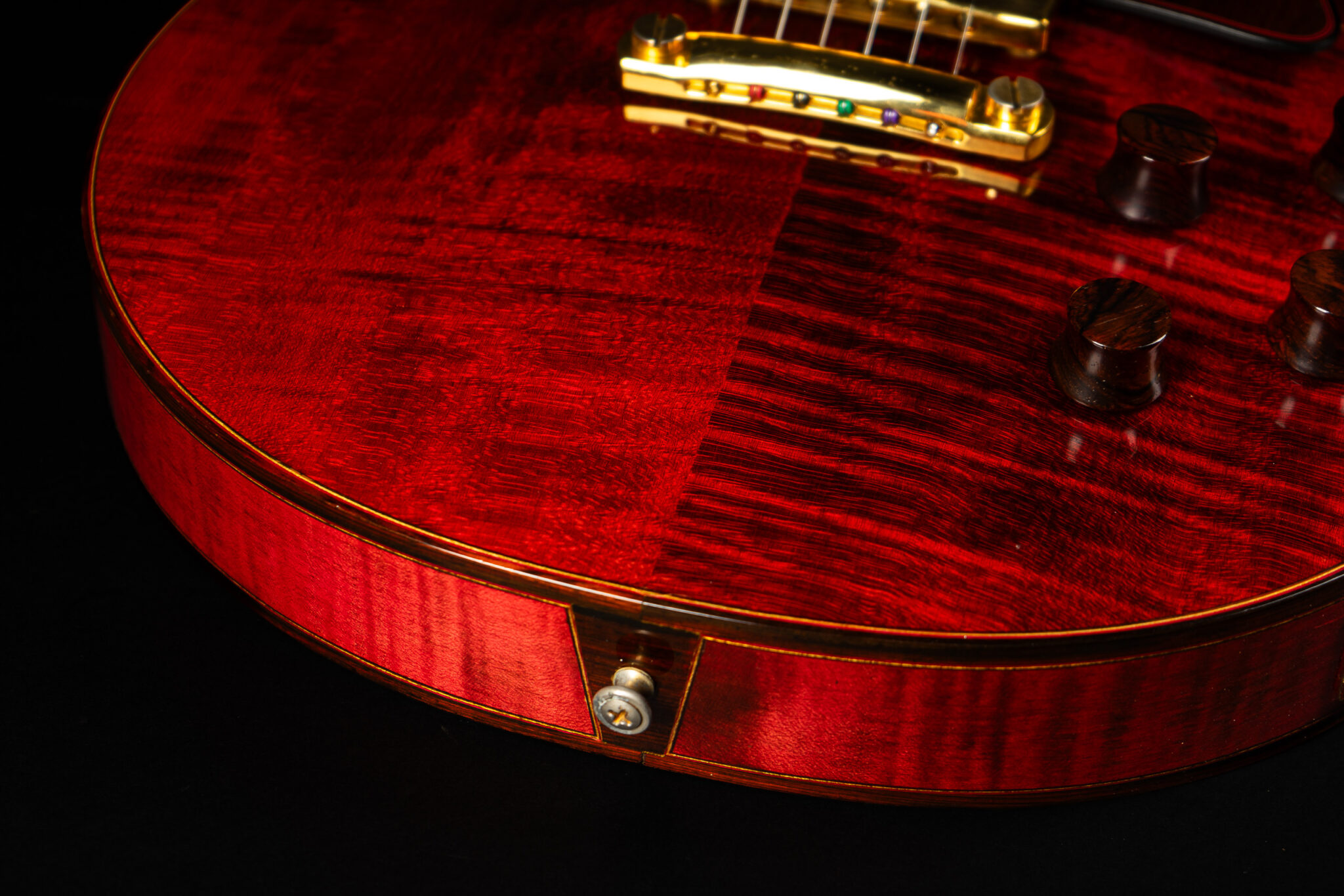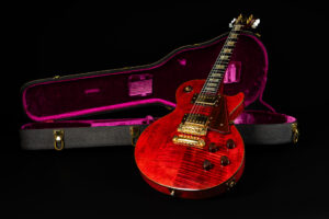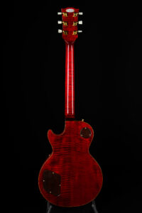 Introduced at the 1975 Namm Show as the ultimate Les Paul… produced from 1976 – 1979 “The Les Paul” is a unique piece of art and the top-of-the-line model of all 1970s Les Pauls! Made of specially sourced Austrian maple top, back and sides with a mahogany core, multiply wooden binding and hand made wooden parts the construction of this guitar is very complicated and the guitar was very expensive even back then ($3199 – which would be $17.200 today!) The fretboard is made of ebony and rosewood, the pickups are “Super Humbuckers”…only 77 have been poduced and only 18 are Wine Red – just like this wonderful example with Reg. No. 34. Since its an earlier/mid production model, serialized in August 1977, it still has all the wooden parts – since Gibson ran out of high quality material for this very special run, later models had plastic knobs or brass nuts. A highly collectible Les Paul, THE Les Paul – and the first Wine Red colored we’ve had. Comes with original case and warranty card.