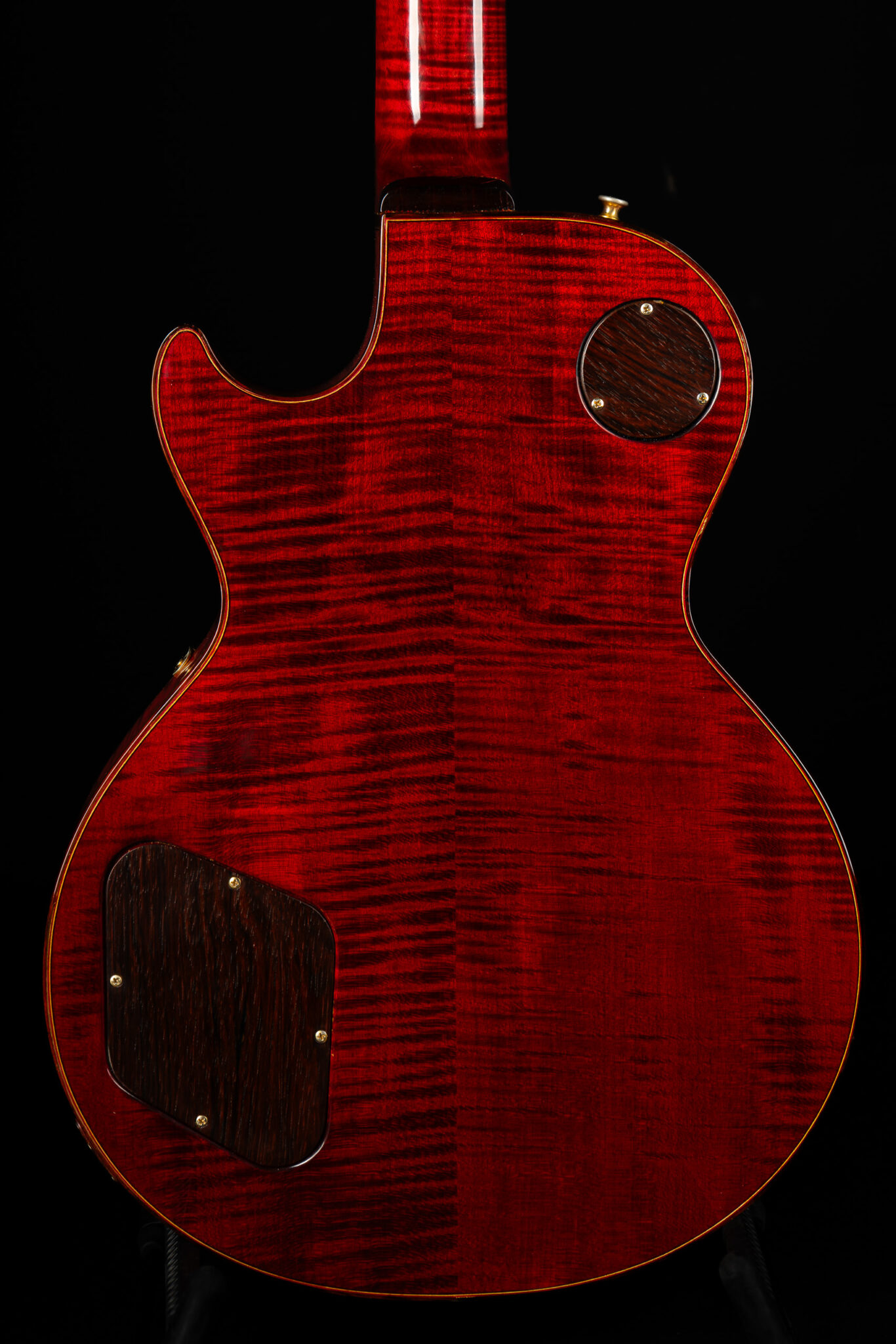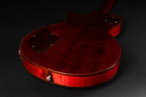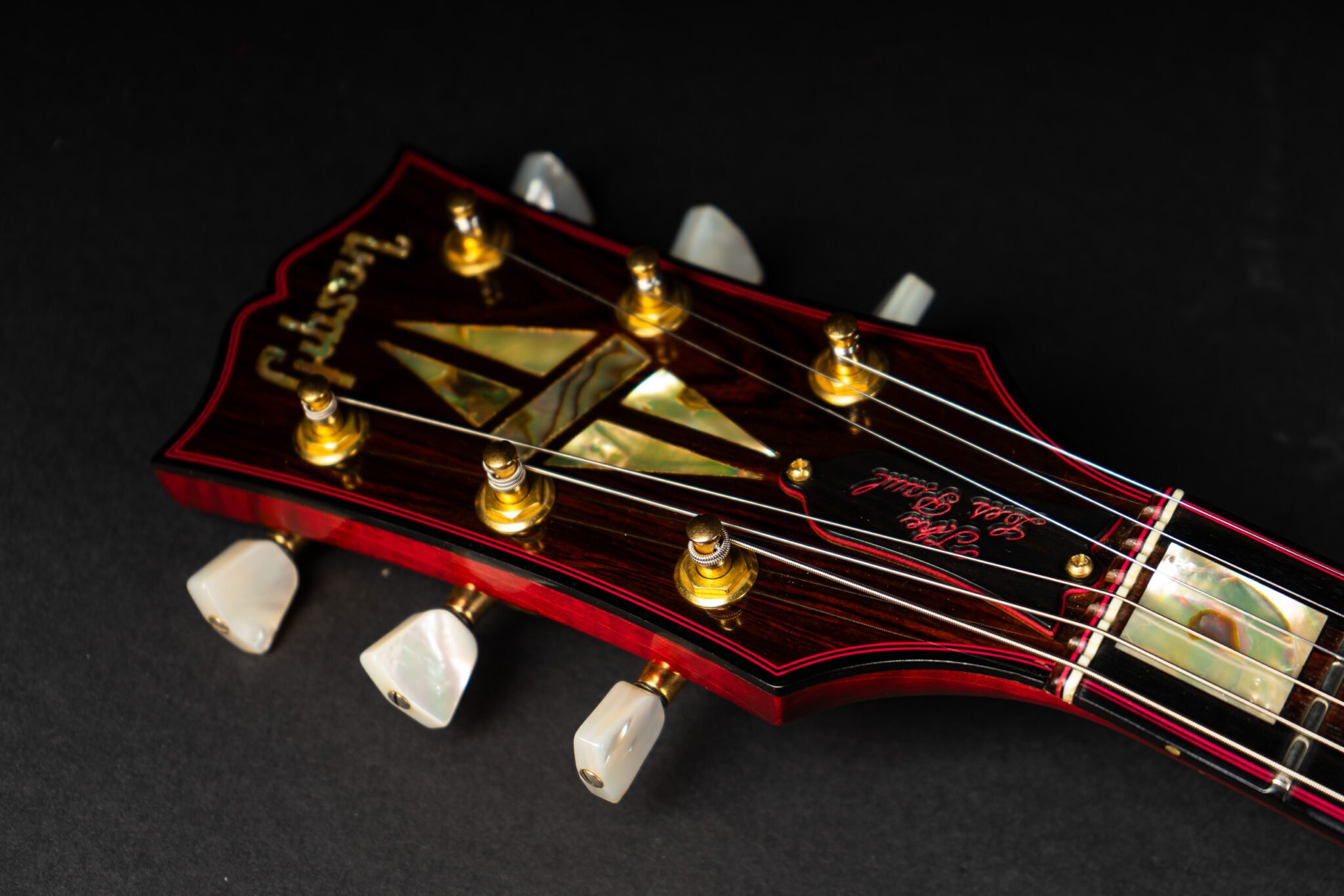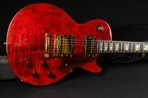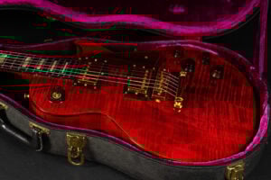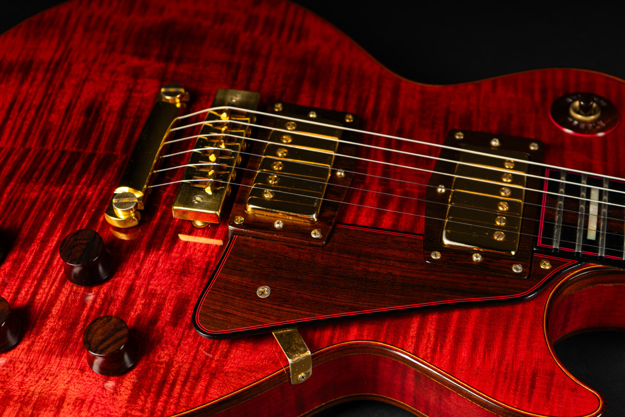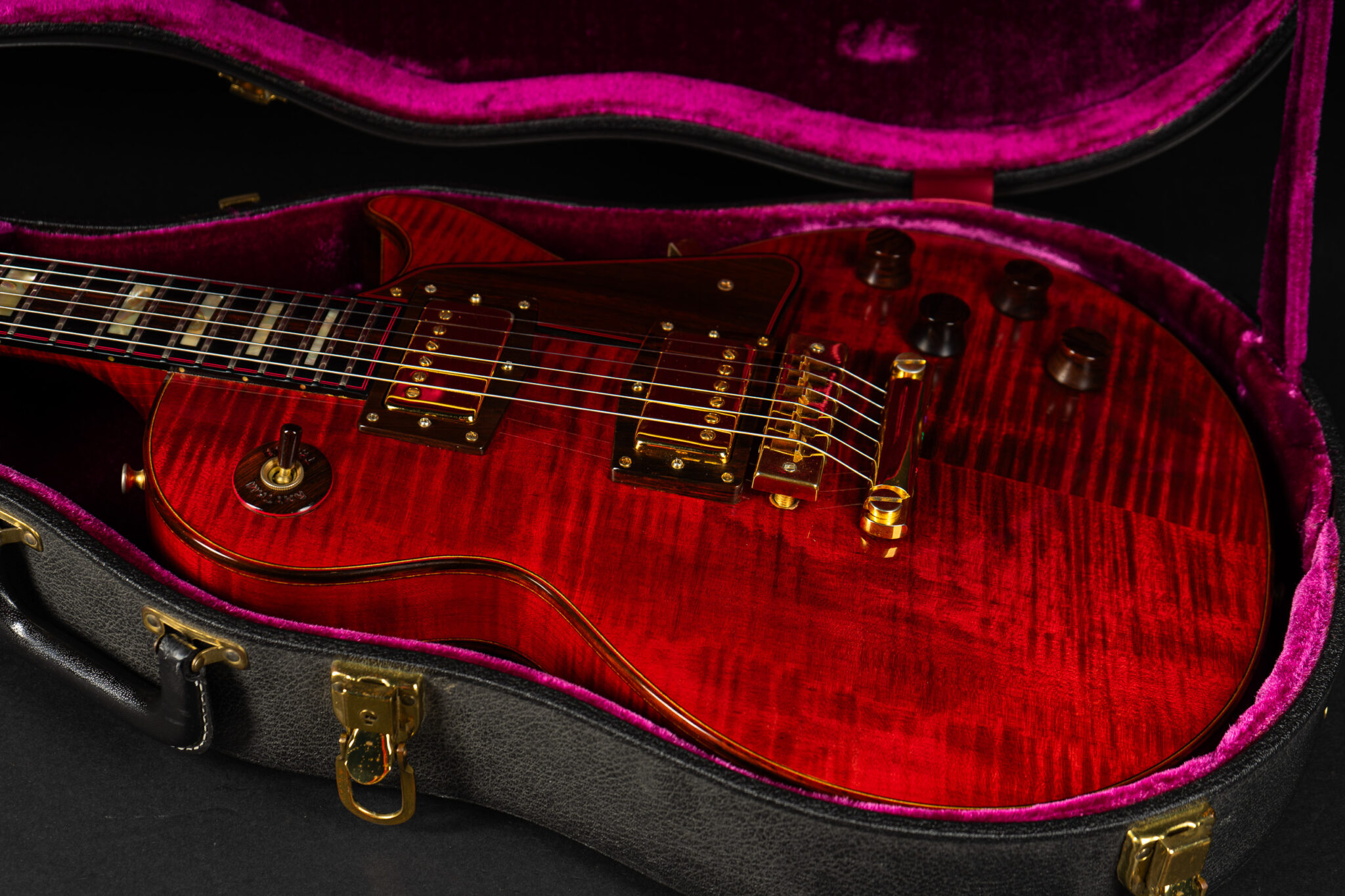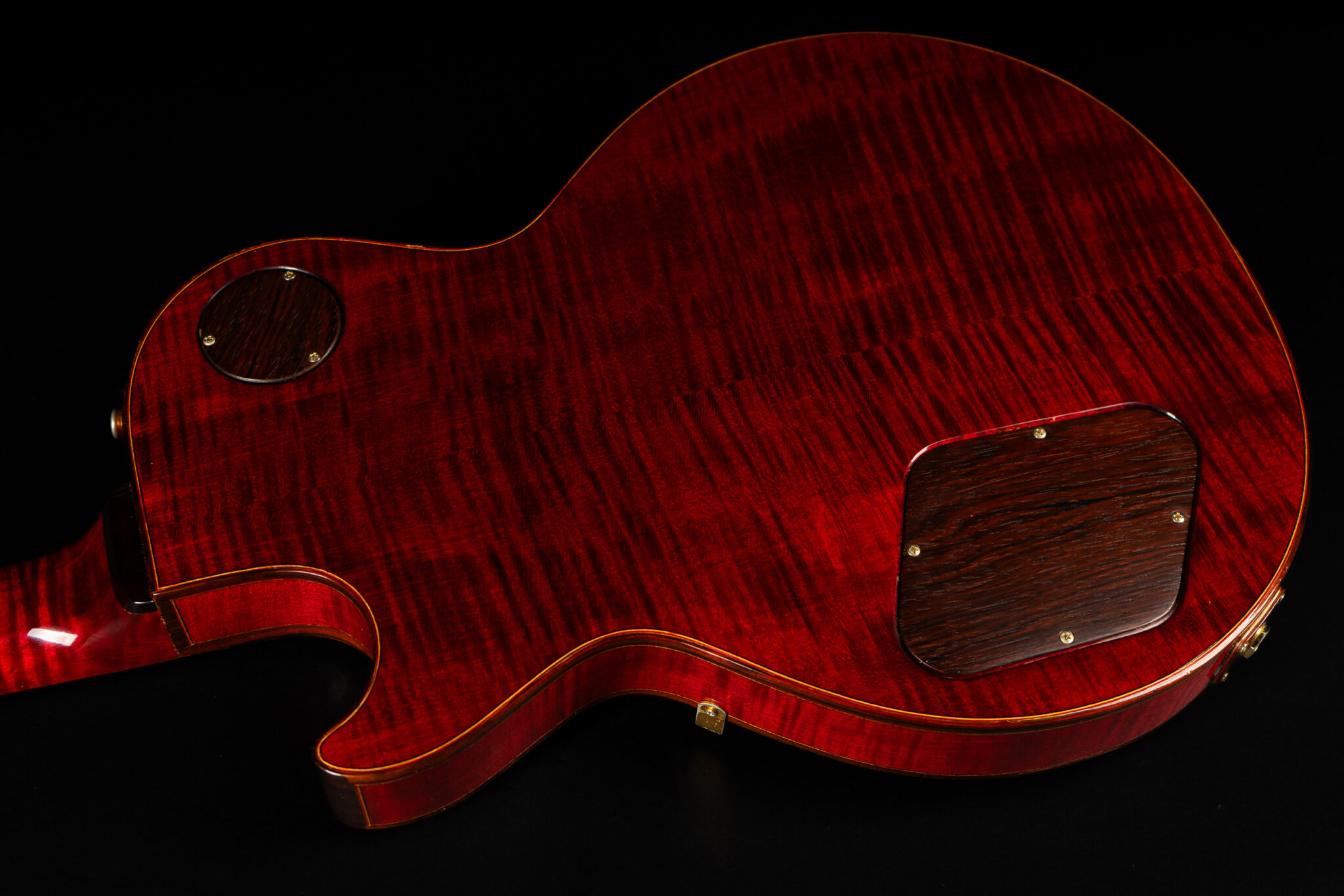 Introduced at the 1975 Namm Show as the ultimate Les Paul… produced from 1976 – 1979 “The Les Paul” is a unique piece of art and the top-of-the-line model of all 1970s Les Pauls! Made of specially sourced Austrian maple top, back and sides with a mahogany core, multiply wooden binding and hand made wooden parts the construction of this guitar is very complicated and the guitar was very expensive even back then ($3199 – which would be $17.200 today!) The fretboard is made of ebony and rosewood, the pickups are “Super Humbuckers”…only 77 have been poduced and only 18 are Wine Red – just like this wonderful example with Reg. No. 34. Since its an earlier/mid production model, serialized in August 1977, it still has all the wooden parts – since Gibson ran out of high quality material for this very special run, later models had plastic knobs or brass nuts. A highly collectible Les Paul, THE Les Paul – and the first Wine Red colored we’ve had. Comes with original case and warranty card.