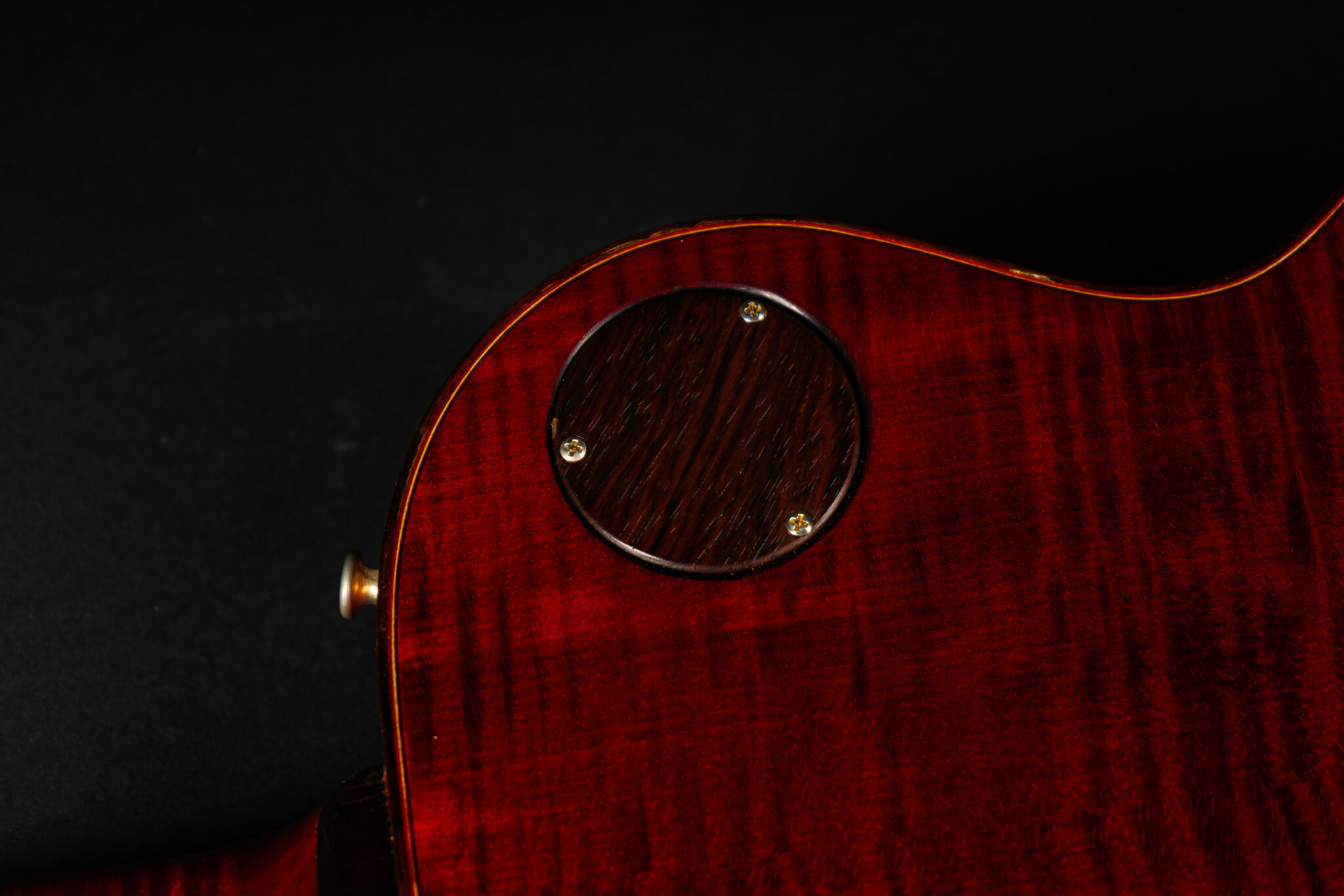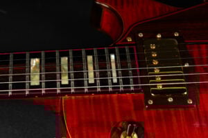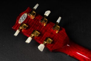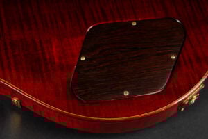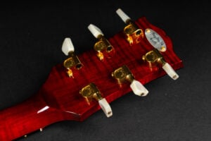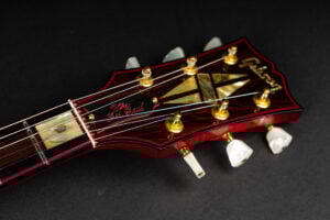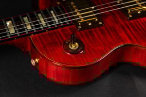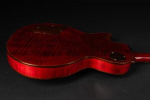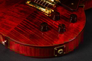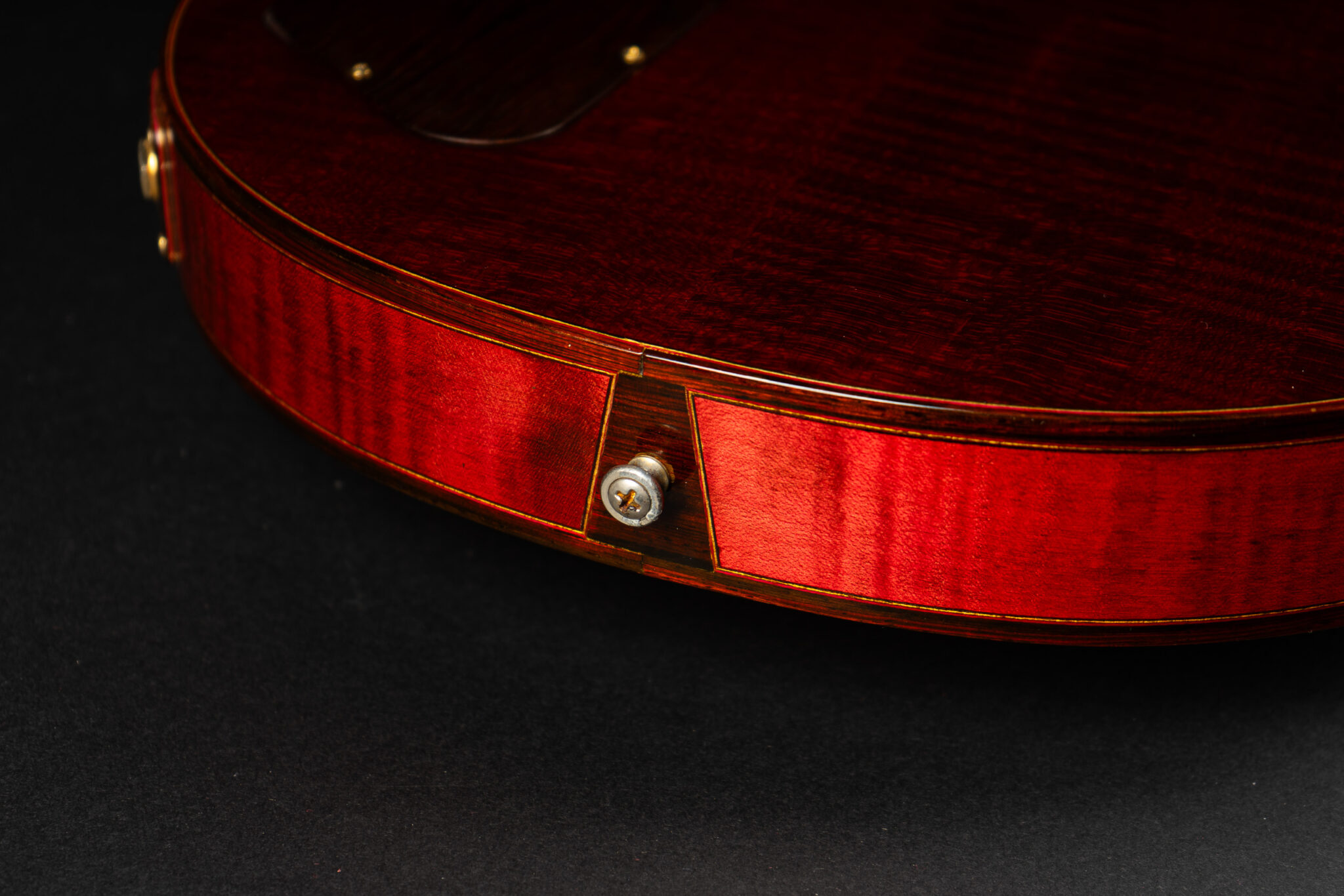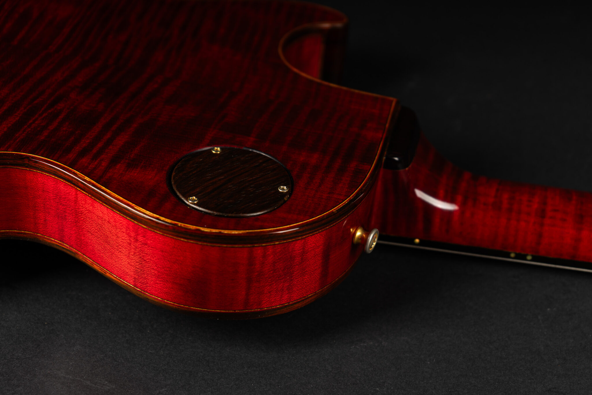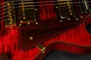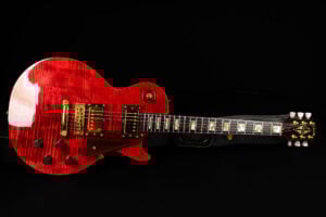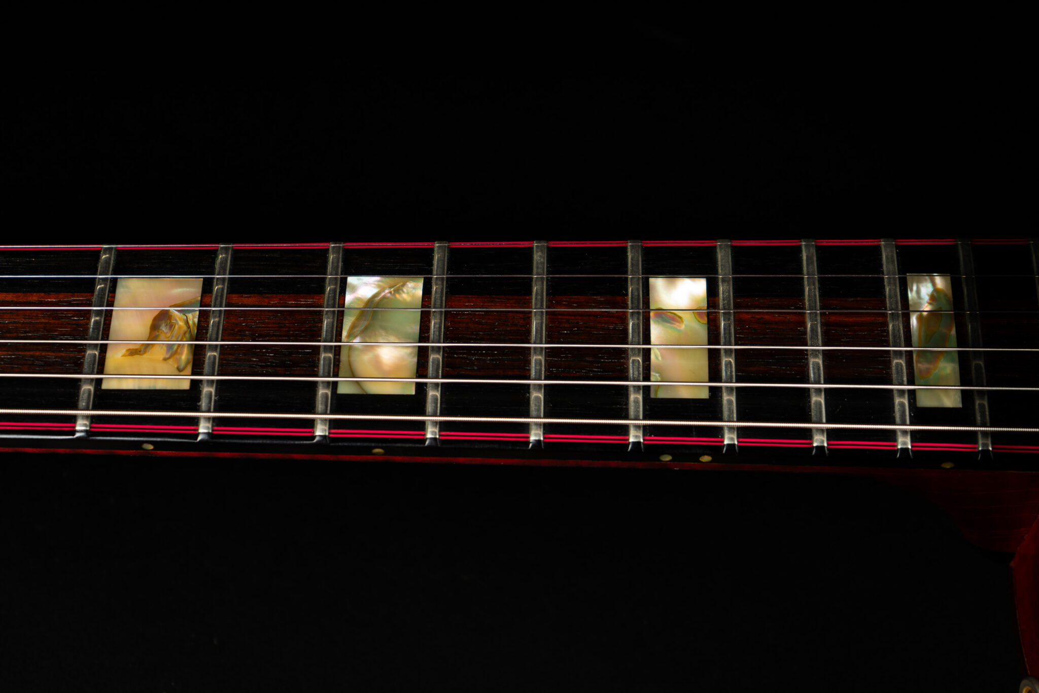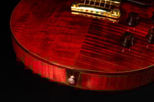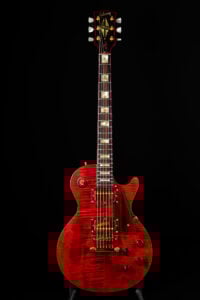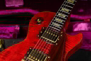 Introduced at the 1975 Namm Show as the ultimate Les Paul… produced from 1976 – 1979 “The Les Paul” is a unique piece of art and the top-of-the-line model of all 1970s Les Pauls! Made of specially sourced Austrian maple top, back and sides with a mahogany core, multiply wooden binding and hand made wooden parts the construction of this guitar is very complicated and the guitar was very expensive even back then ($3199 – which would be $17.200 today!) The fretboard is made of ebony and rosewood, the pickups are “Super Humbuckers”…only 77 have been poduced and only 18 are Wine Red – just like this wonderful example with Reg. No. 34. Since its an earlier/mid production model, serialized in August 1977, it still has all the wooden parts – since Gibson ran out of high quality material for this very special run, later models had plastic knobs or brass nuts. A highly collectible Les Paul, THE Les Paul – and the first Wine Red colored we’ve had. Comes with original case and warranty card.