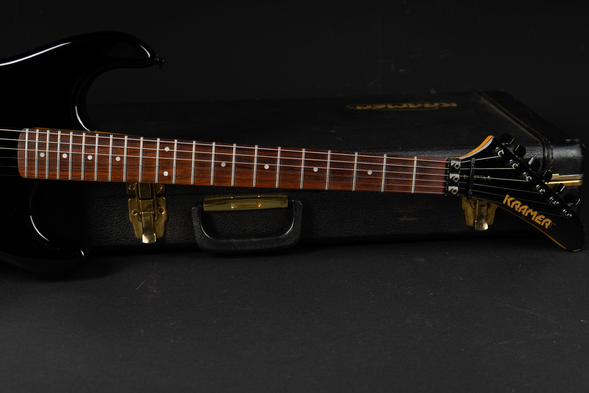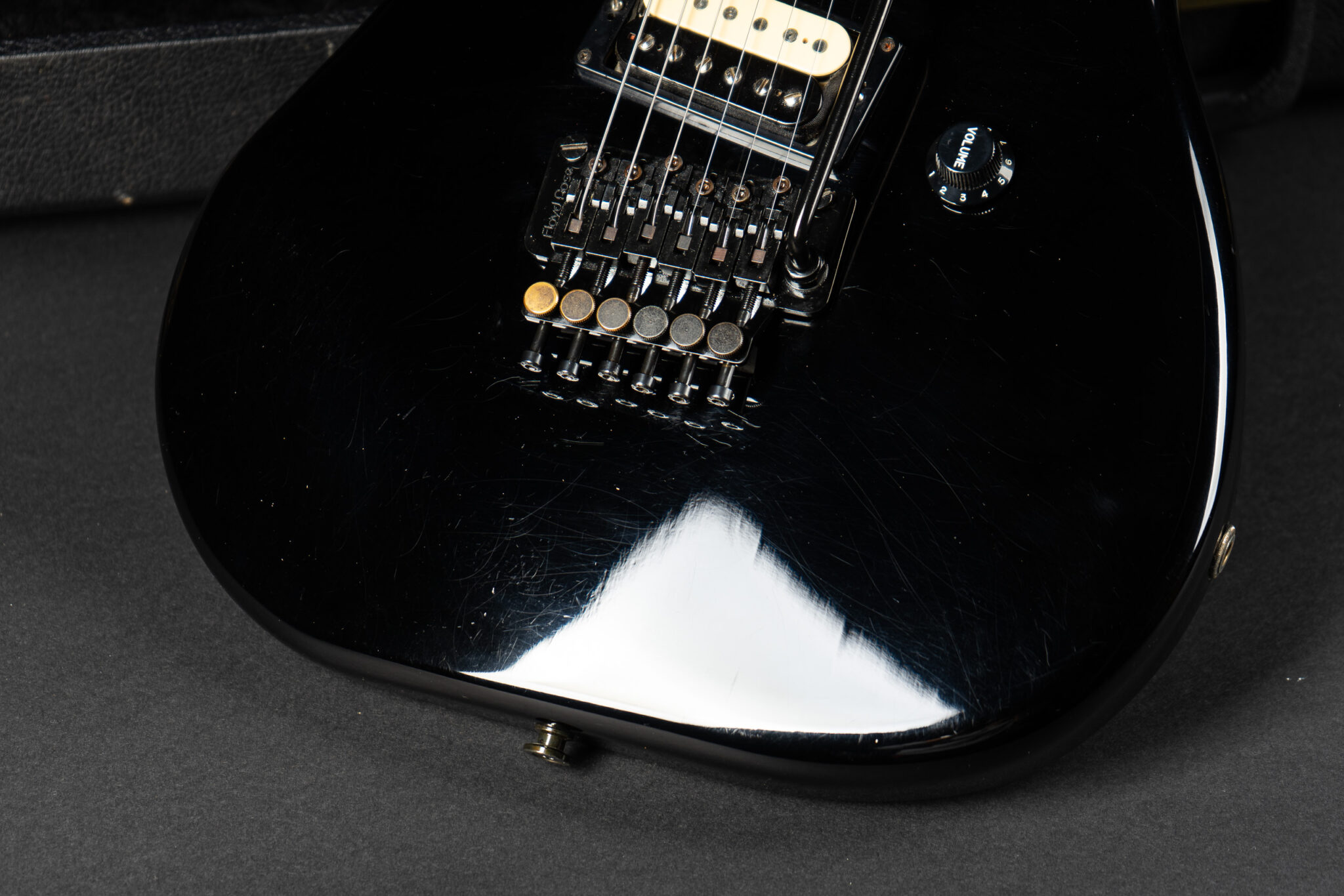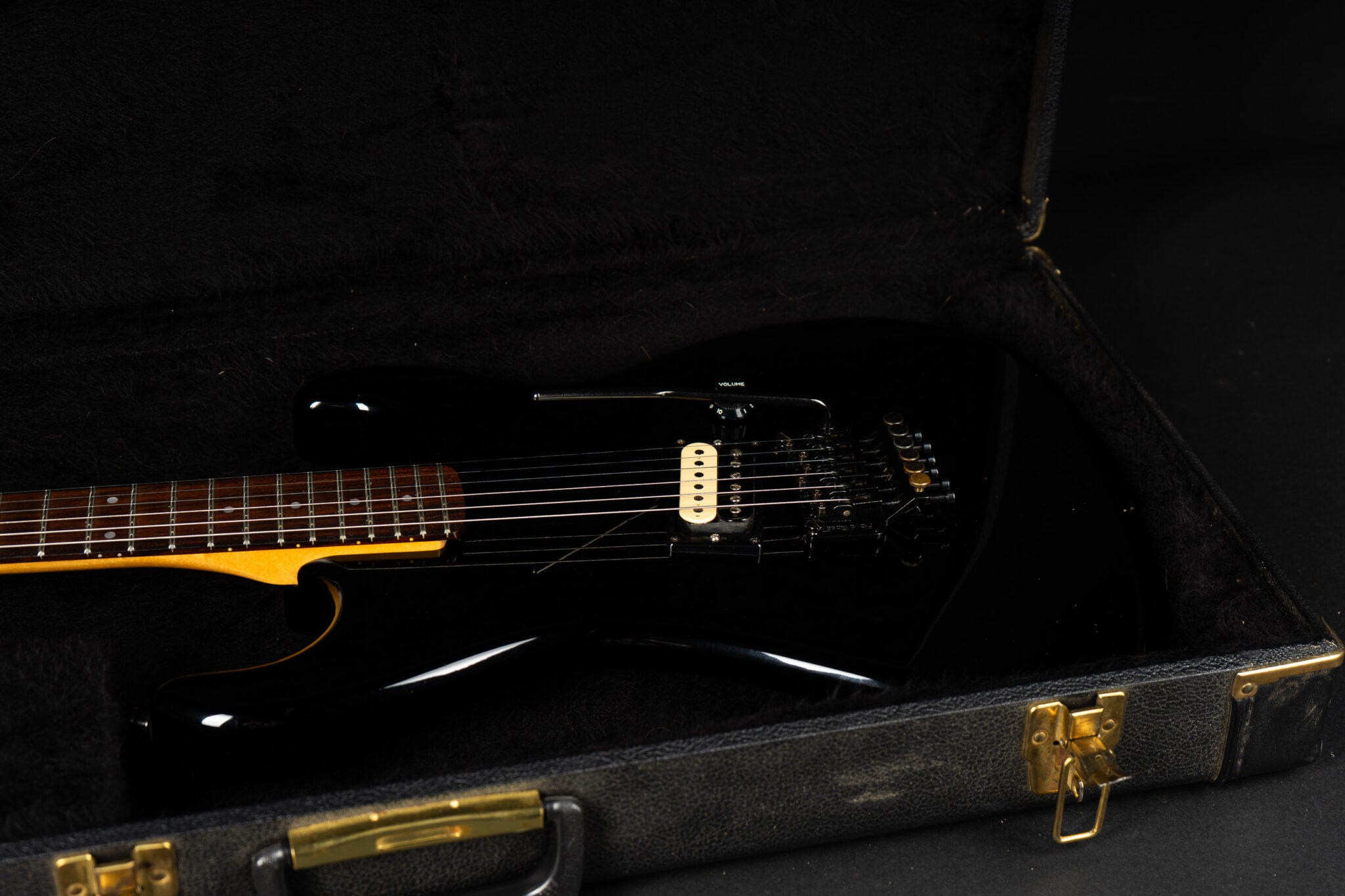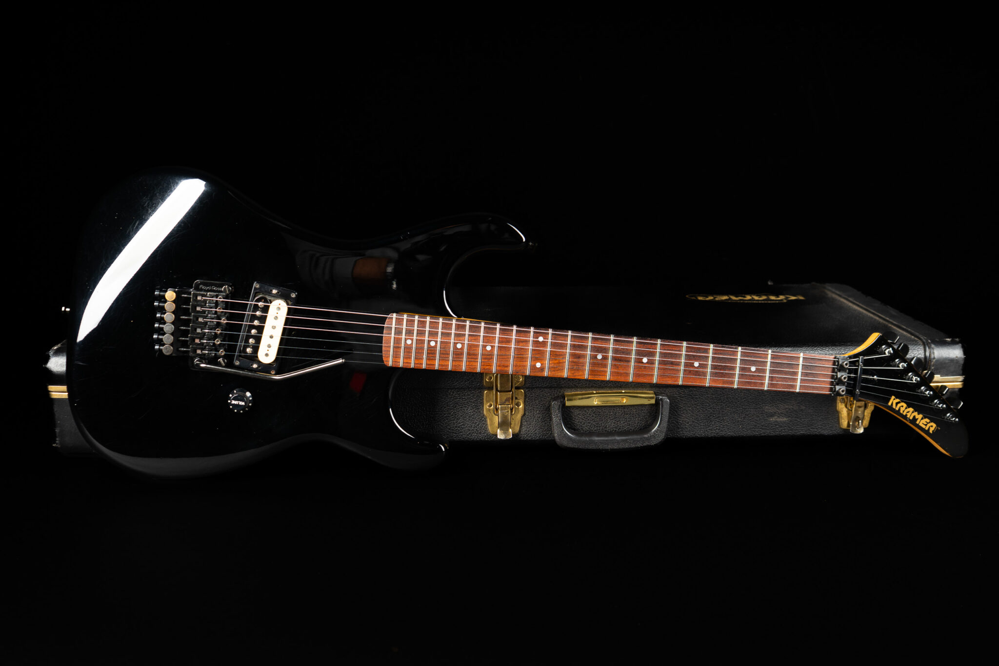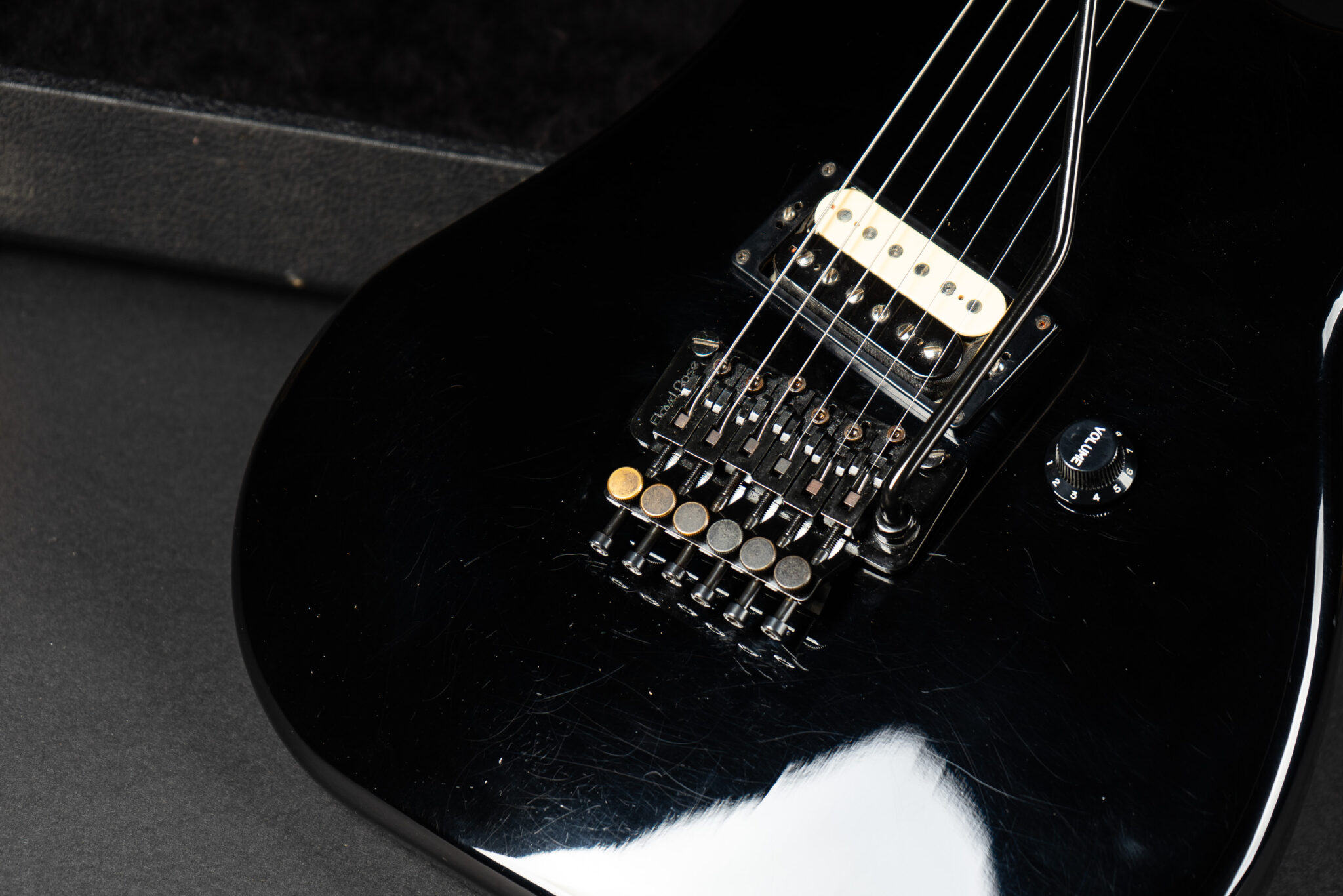 All original 1985 Kramer Baretta in Black finish. The neck is dated September 1985. Still the earlier pre “Neptune” stamped neck plate! 1985 dated pot, Seymour Duncan JB humbucker and USA Floyd Rose. No asian parts, body made in Connecticut by Sports and neck likely made in Canada. Super nice guitar, comes with original case.