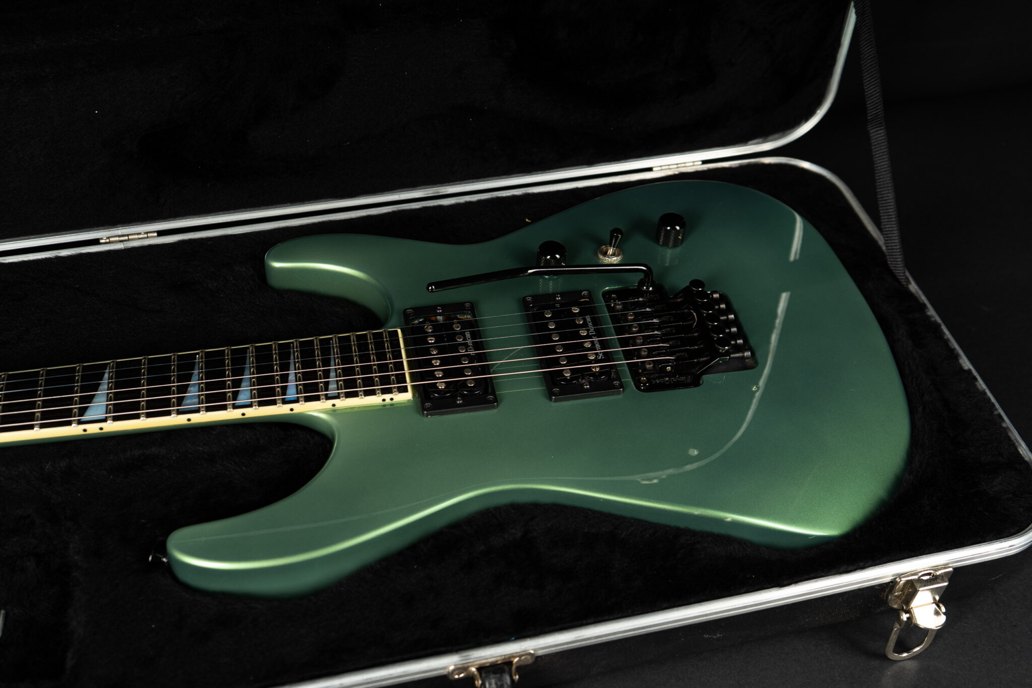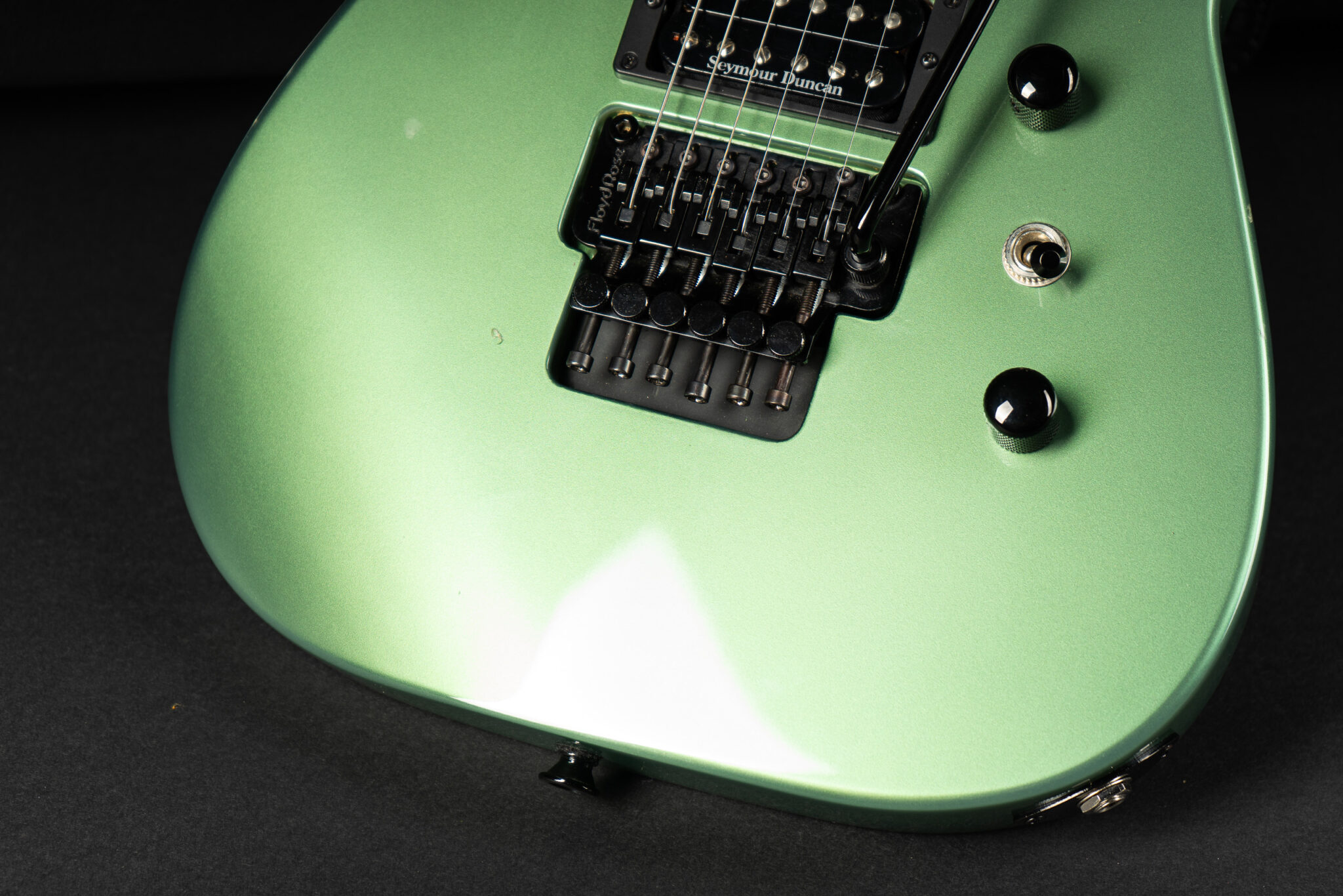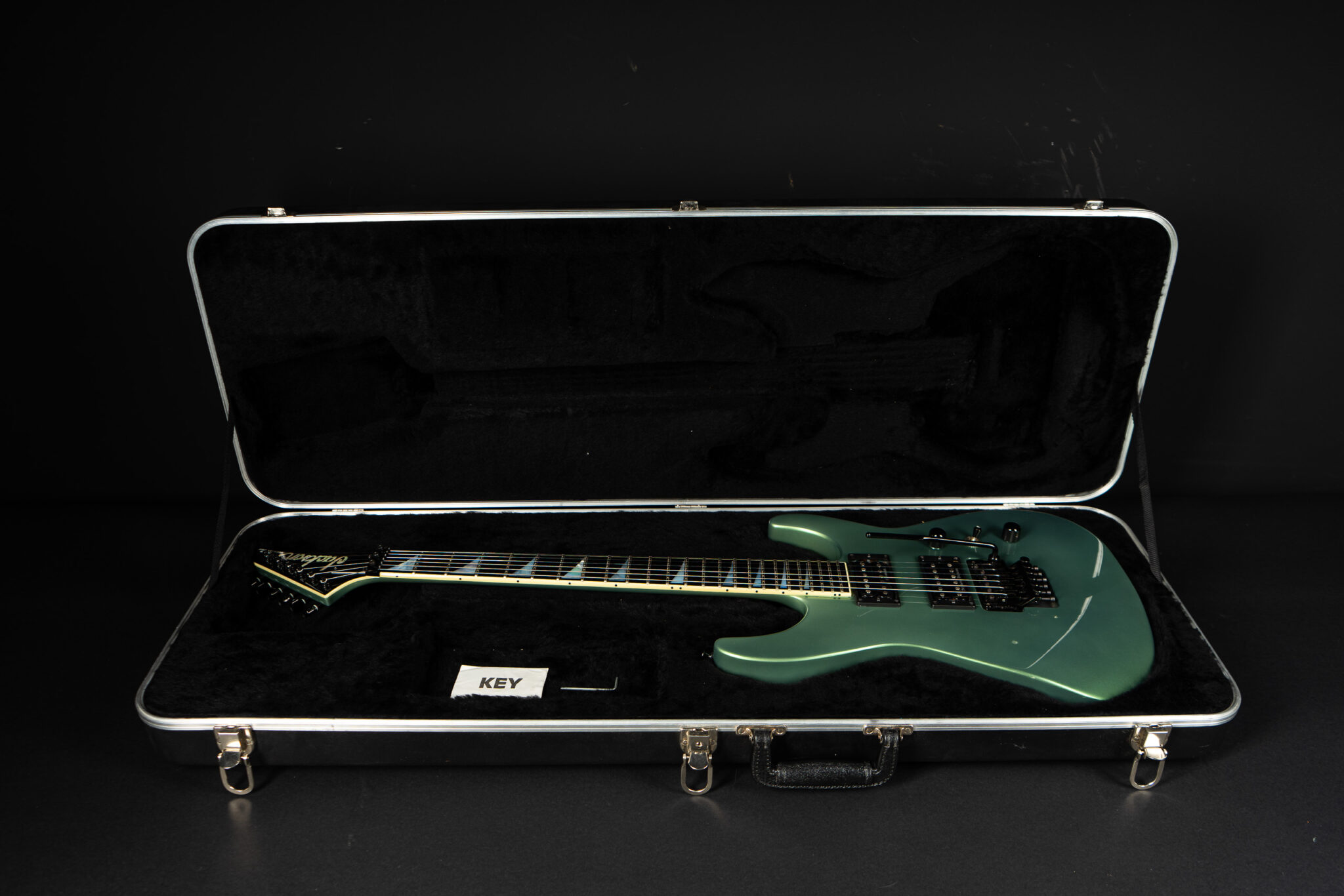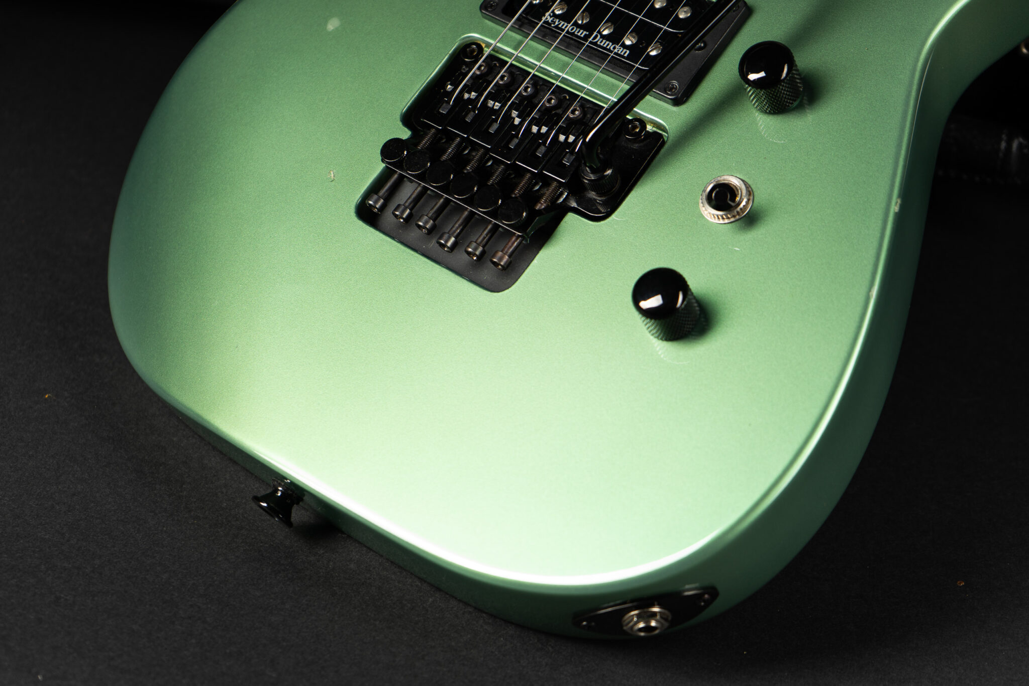Super cool Ontario made Jackson USA Custom Shop Soloist in Chlorine Metallic finish. Some dings and dongs but overall clean. Seymour Duncan TB-4 and SH2N pickups, USA Floyd. Classic Soloist neck-through construction. Comes incl. original case.