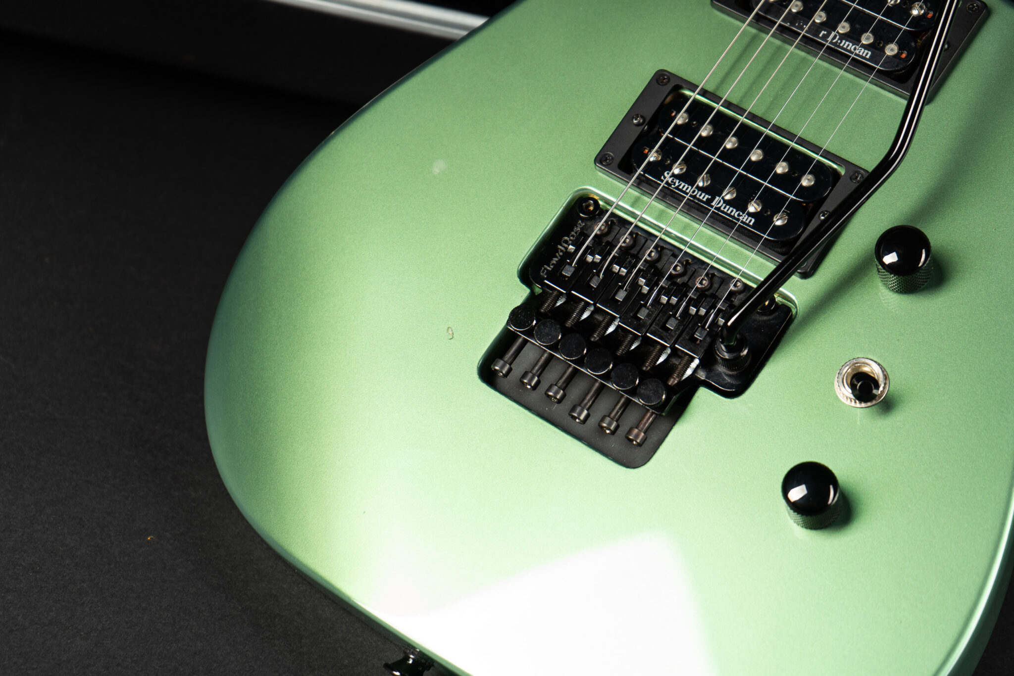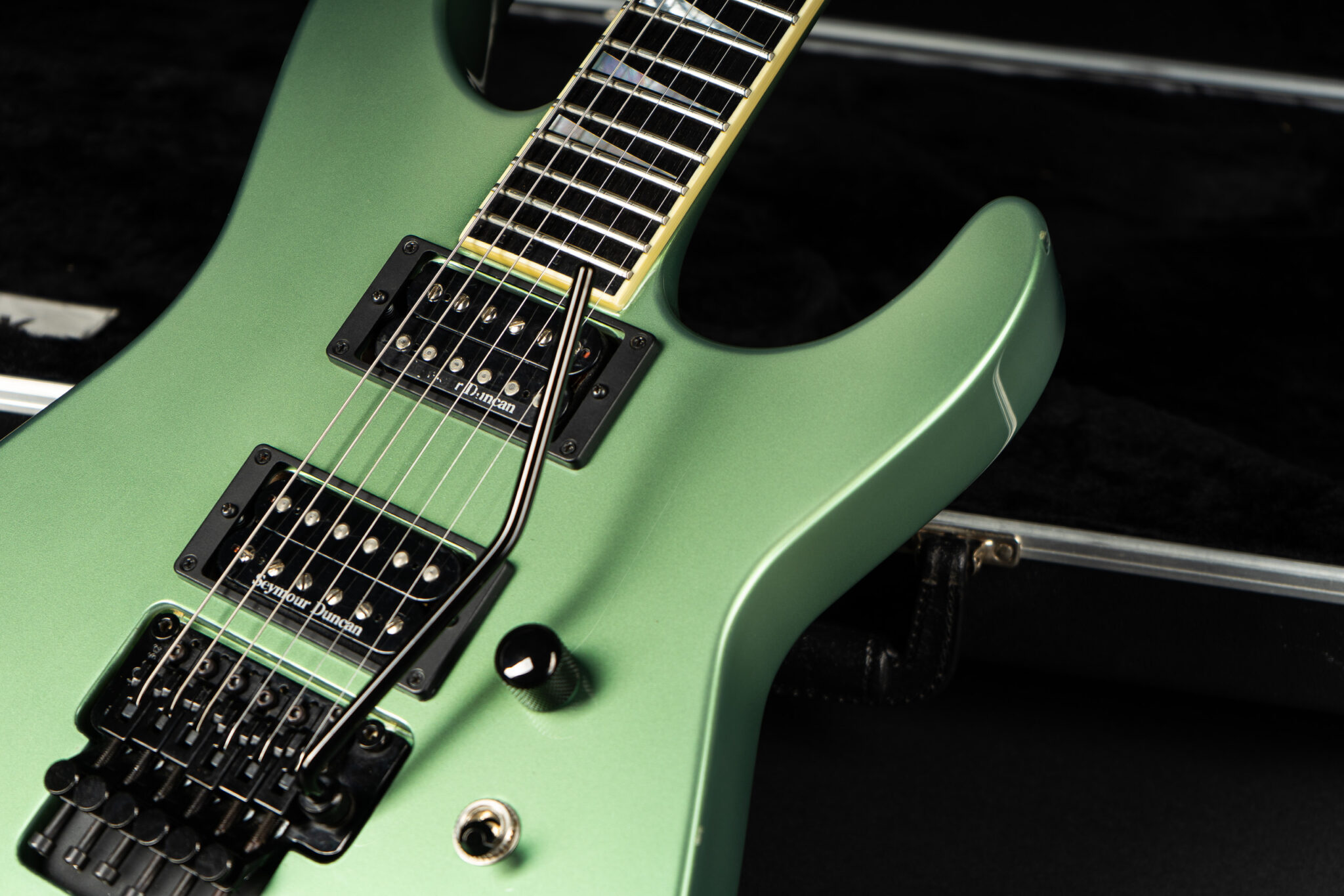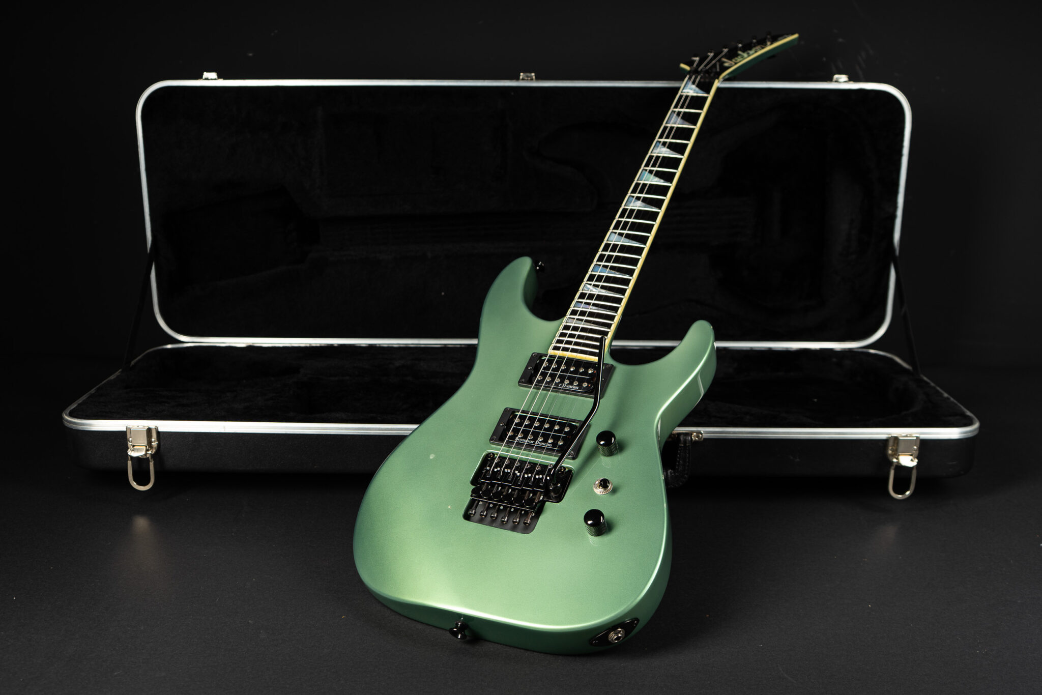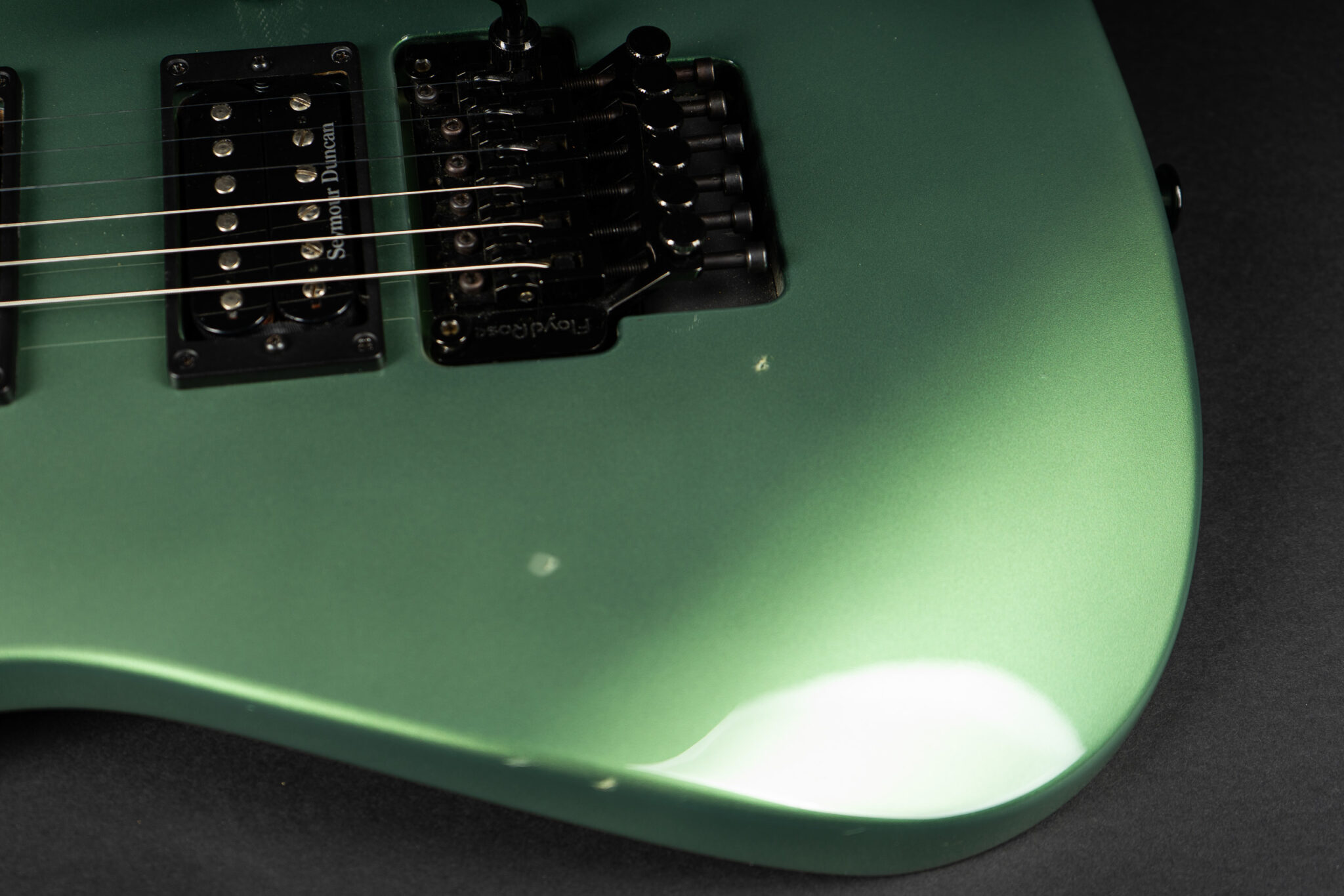 Super cool Ontario made Jackson USA Custom Shop Soloist in Chlorine Metallic finish. Some dings and dongs but overall clean. Seymour Duncan TB-4 and SH2N pickups, USA Floyd. Classic Soloist neck-through construction. Comes incl. original case.