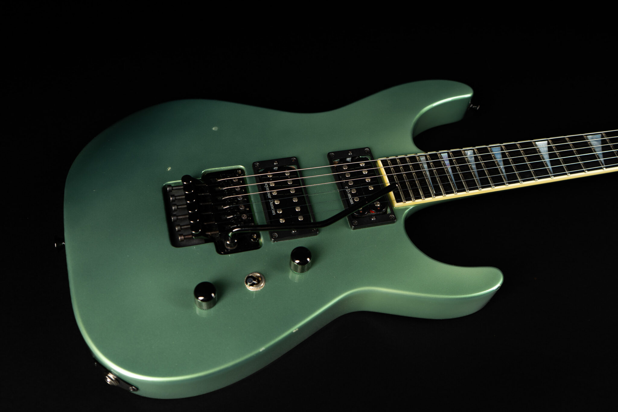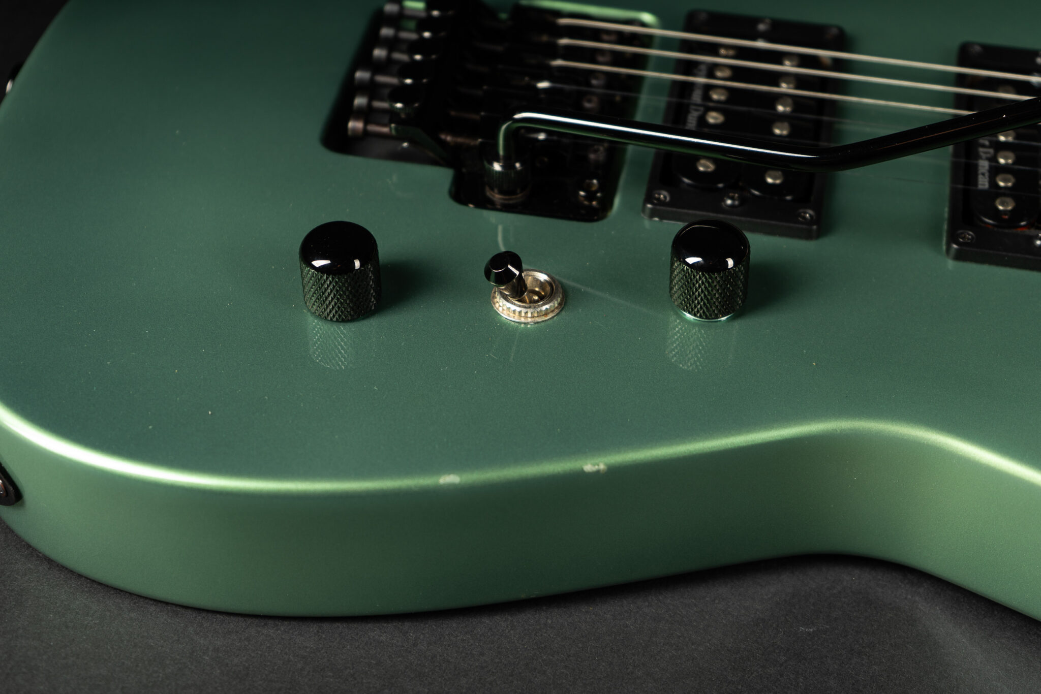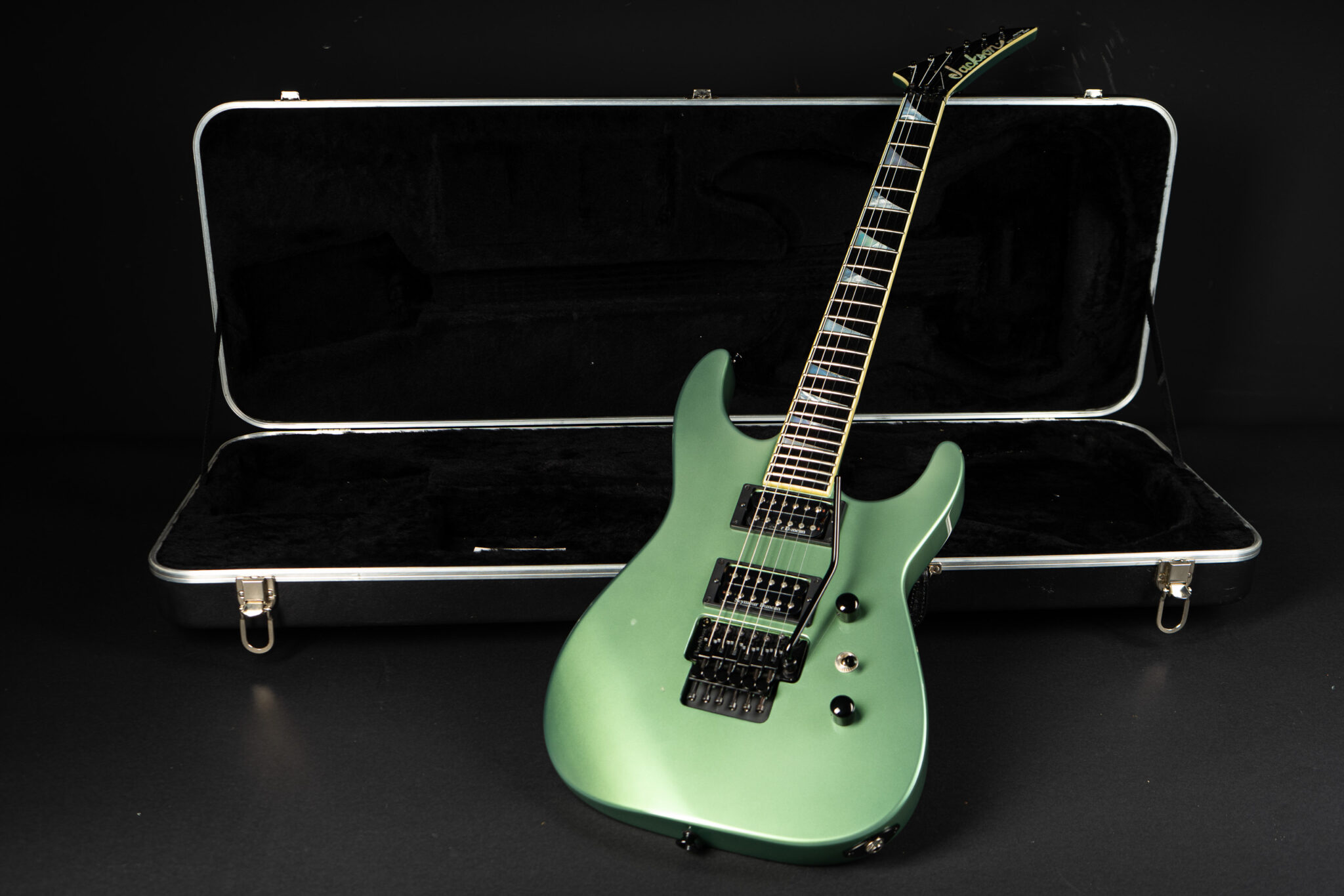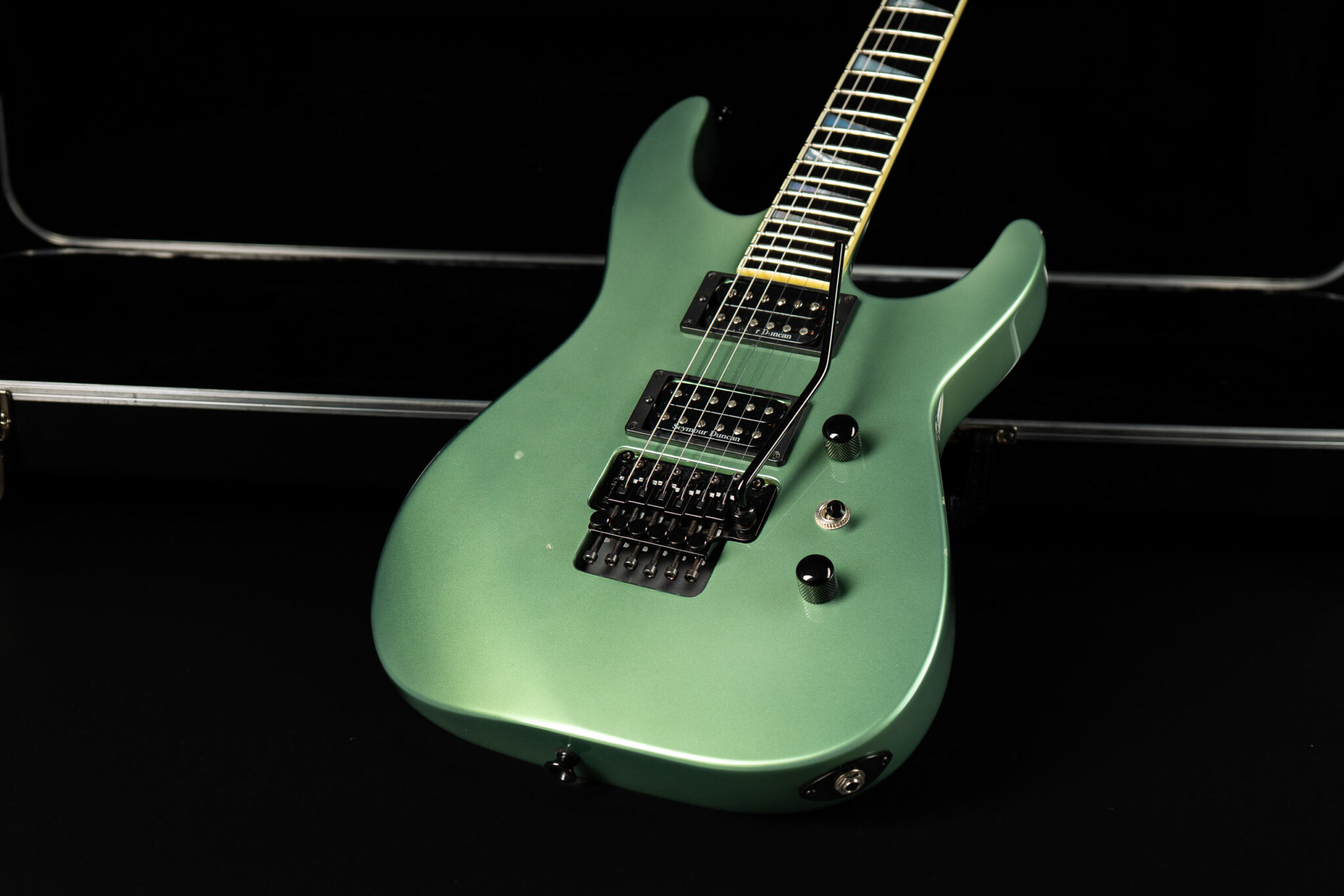 Super cool Ontario made Jackson USA Custom Shop Soloist in Chlorine Metallic finish. Some dings and dongs but overall clean. Seymour Duncan TB-4 and SH2N pickups, USA Floyd. Classic Soloist neck-through construction. Comes incl. original case.