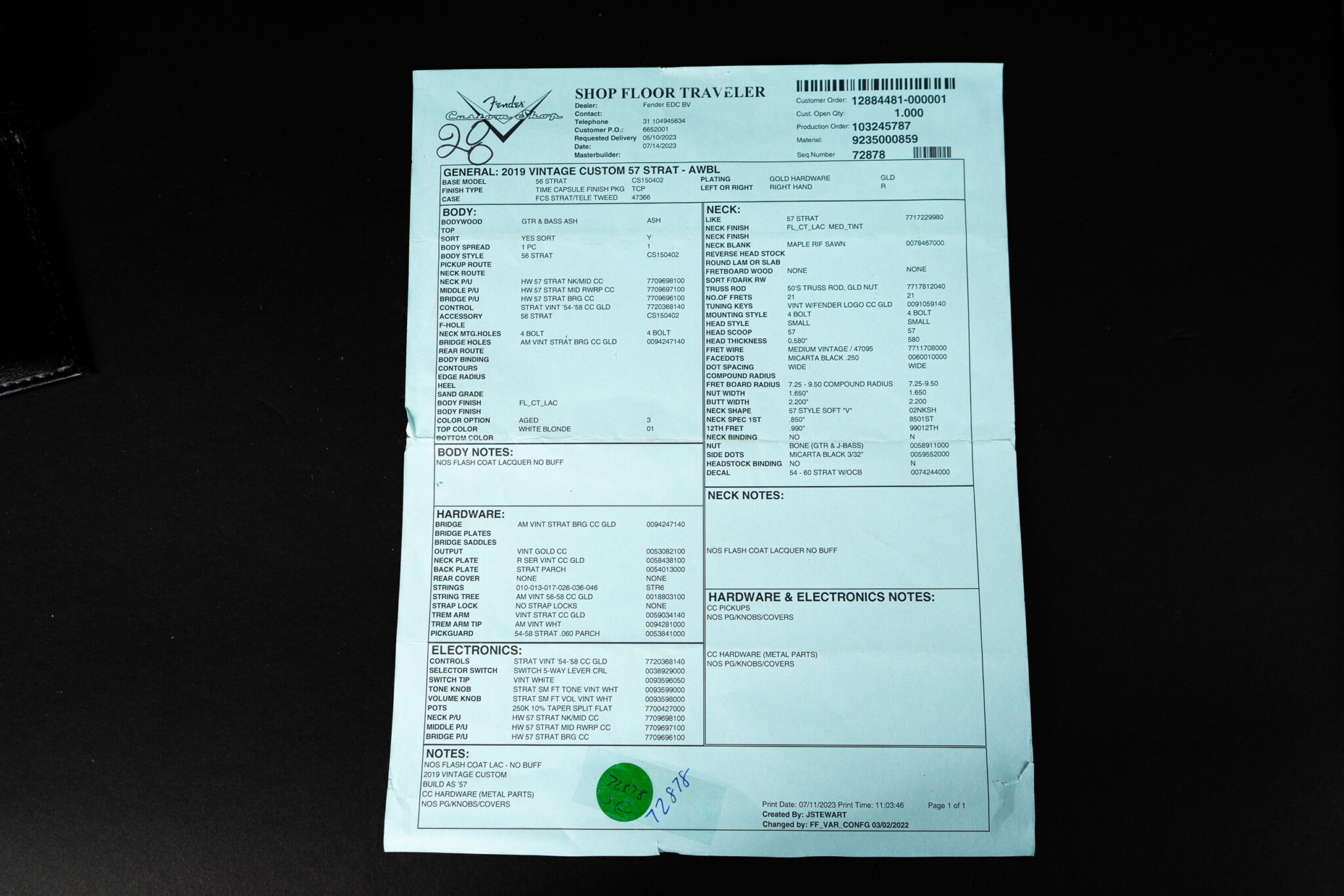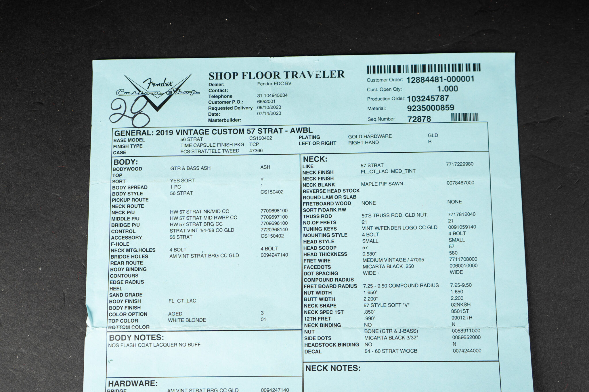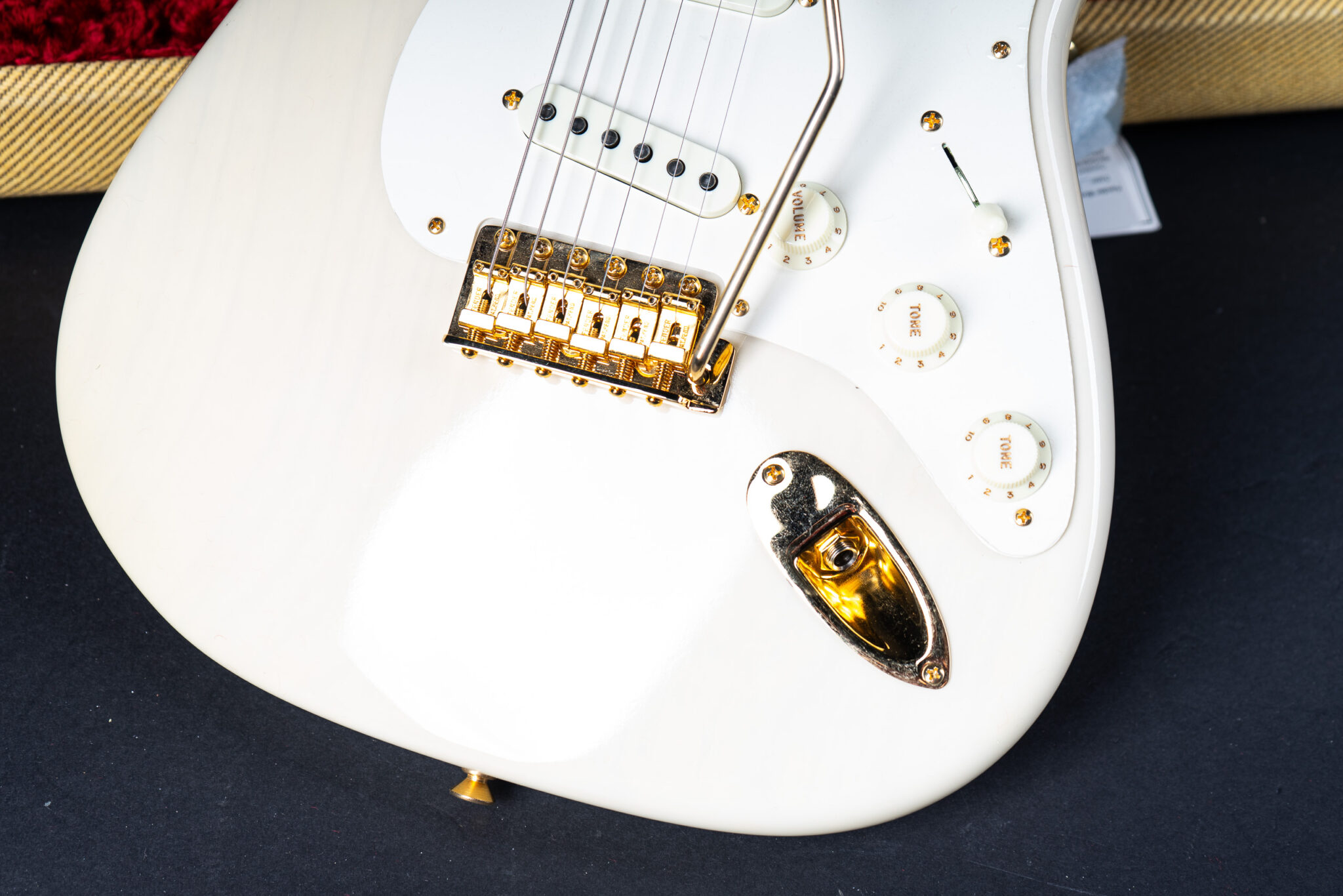 Brand new B-stock model – but made back in 2019. Vintage Custom series “Mary Kaye” 1957 Stratocaster. This means Blond, ash body, Gold hardware. A true classic based on the super high priced vintage original. Handwound 1957 pickups, 7.25″-9.5″ radius fretboard, vintage frets, a dream of a neck, a 57 soft V. What makes it a B-stock guitar? There is some lacquer damage around the neck pocket – see pictures. Just cosmetics, nothing big.