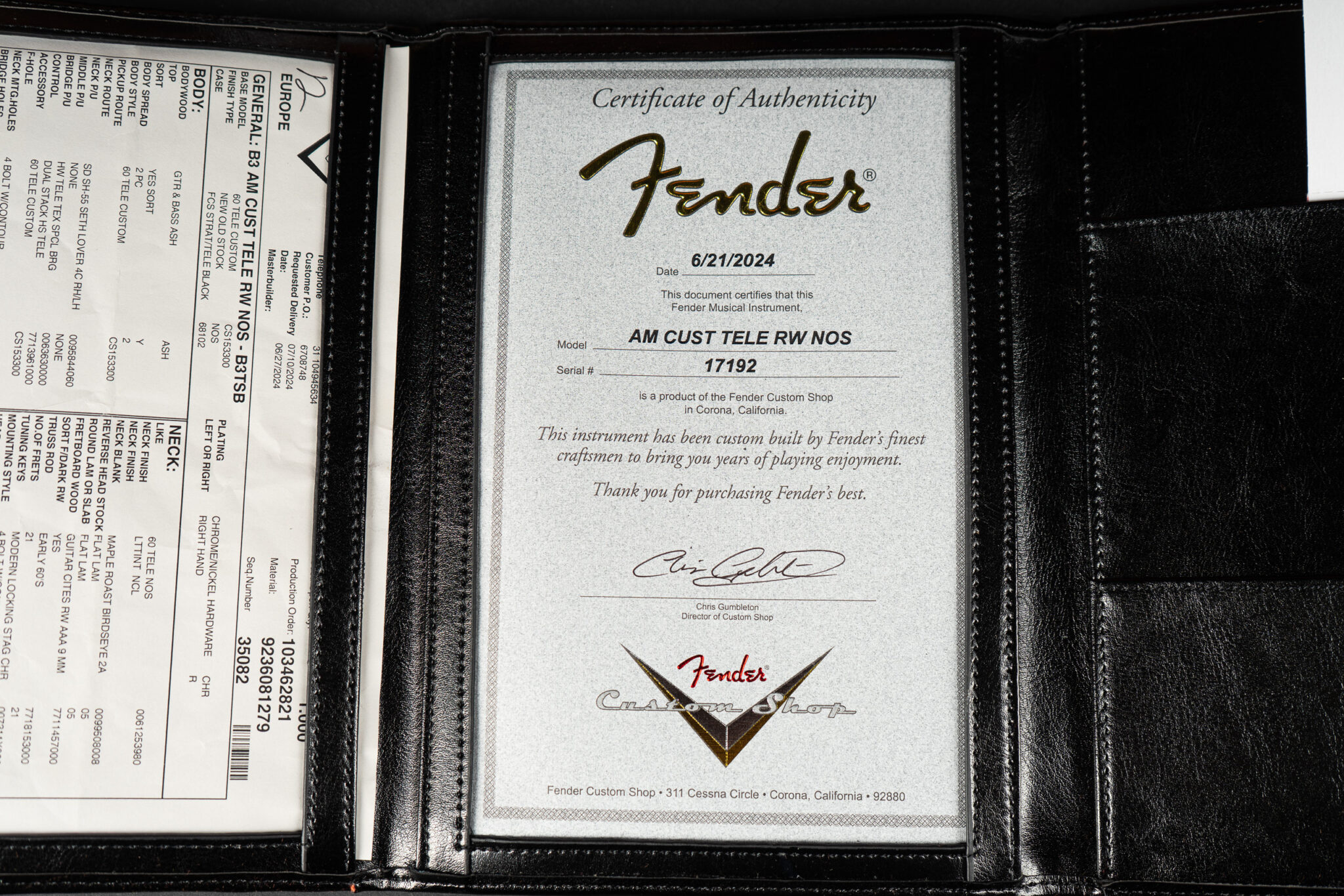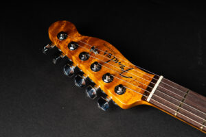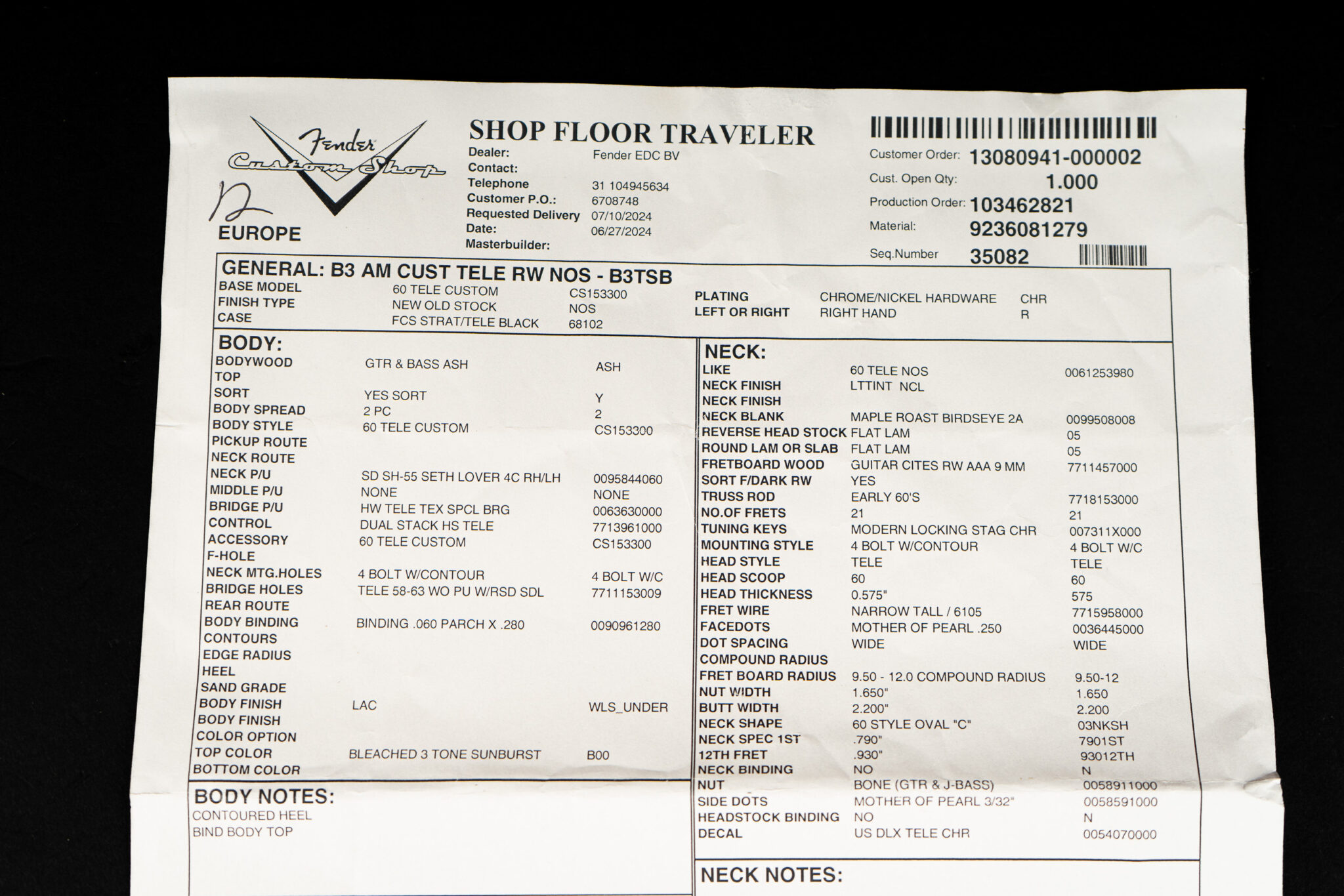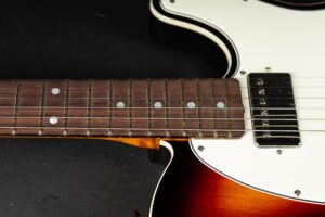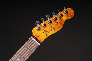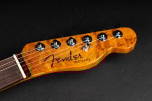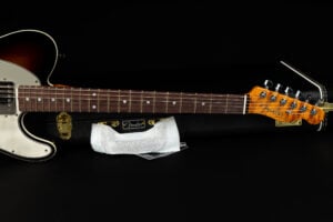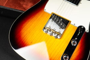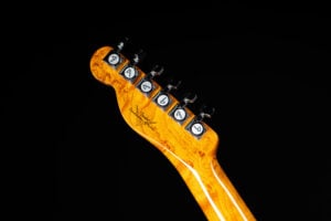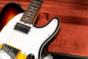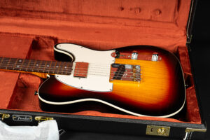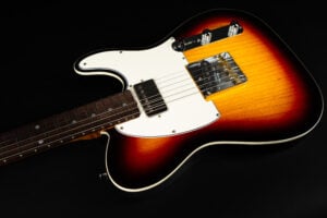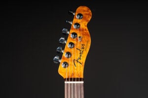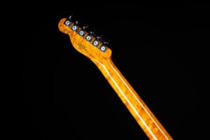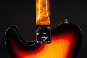 Vintage Modern – the American Custom Telecaster combines classic with modern features and is designed for the playing guitarist who wants both – a luxurious guitar but maximum functionality. Contoured neck heel for easier access to the higher frets, Hot hand wound Texas Special in the bridge and a Seymour Duncan SH-55 Seth Lover PAF in the neck position. 9.5″ – 12″ compound fretboard radius for modern playability. That neck… roasted AA birdseye maple! Locking tuners of course. What makes it a B-stock guitar? The guitar lay on something that reaction with the finish ion the back. There is a light imprint you only see in certain light – no big deal.