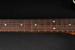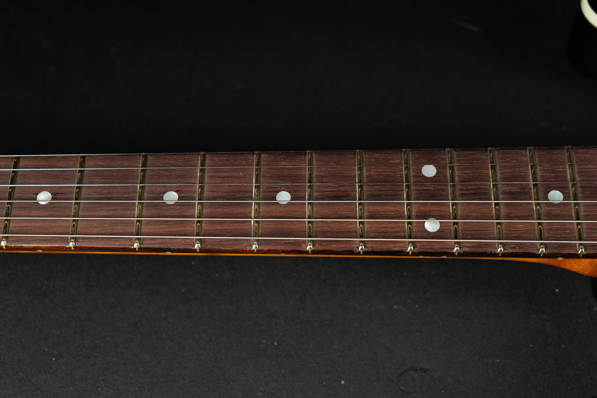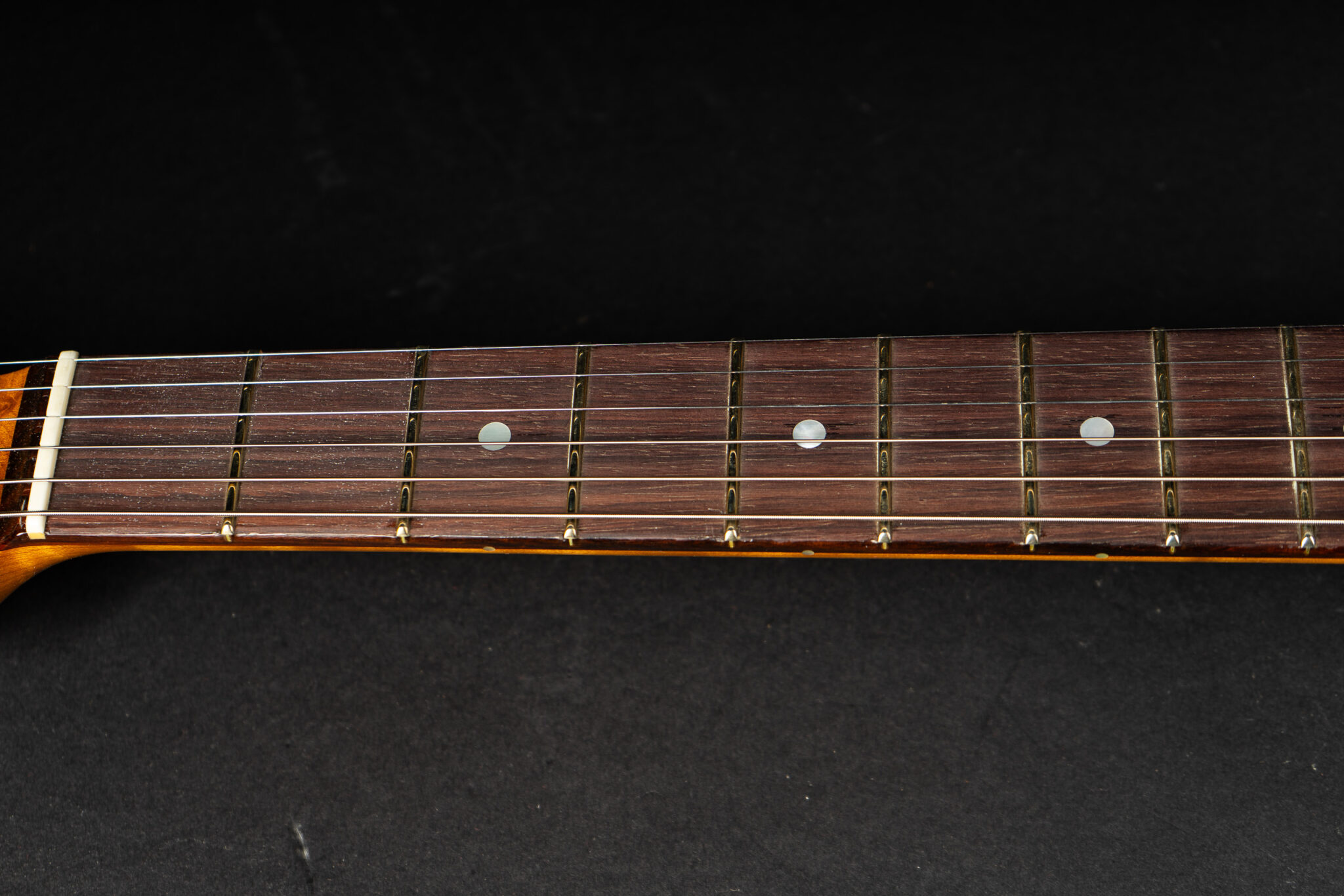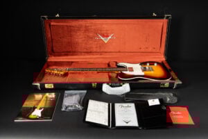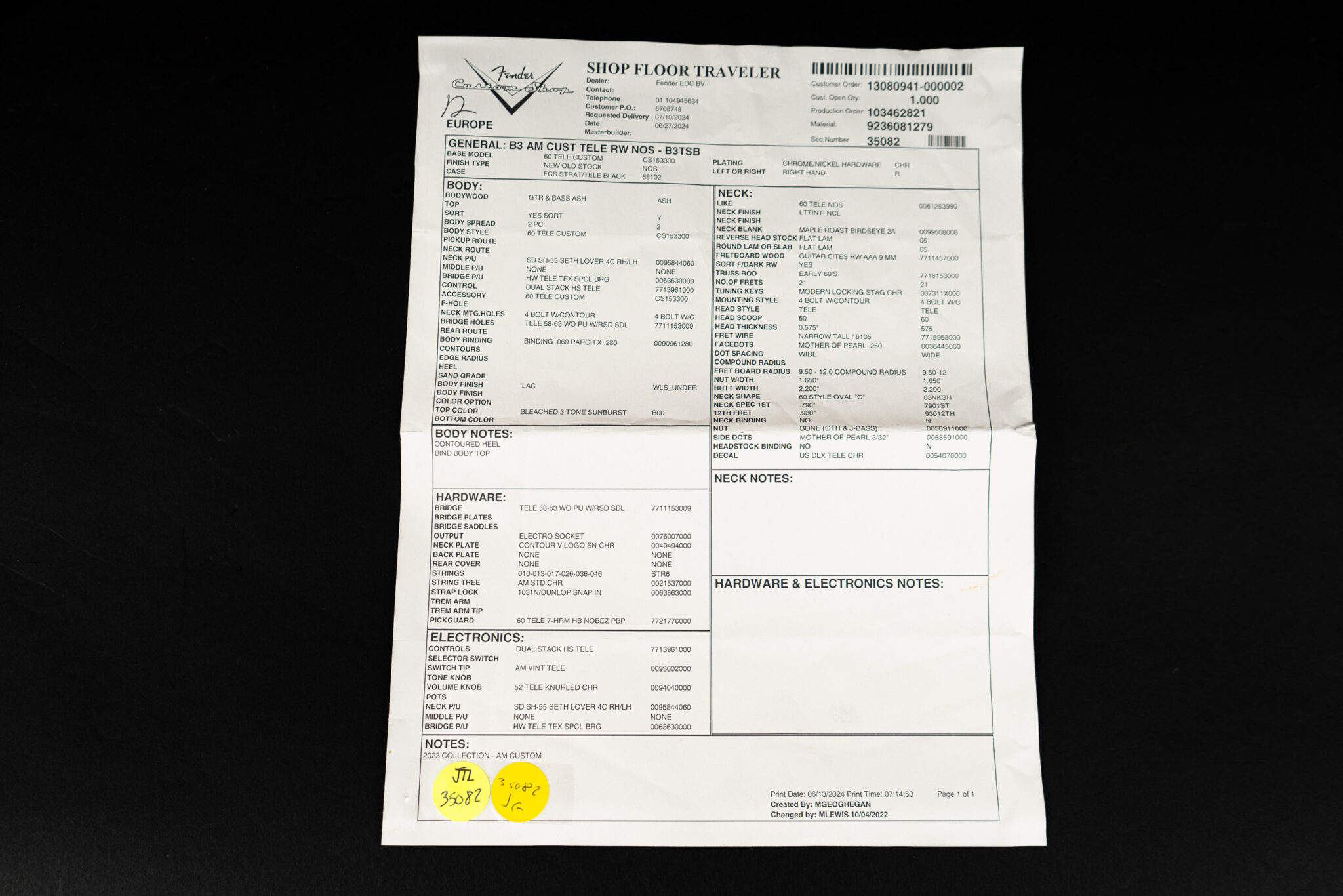 Vintage Modern – the American Custom Telecaster combines classic with modern features and is designed for the playing guitarist who wants both – a luxurious guitar but maximum functionality. Contoured neck heel for easier access to the higher frets, Hot hand wound Texas Special in the bridge and a Seymour Duncan SH-55 Seth Lover PAF in the neck position. 9.5″ – 12″ compound fretboard radius for modern playability. That neck… roasted AA birdseye maple! Locking tuners of course. What makes it a B-stock guitar? The guitar lay on something that reaction with the finish ion the back. There is a light imprint you only see in certain light – no big deal.