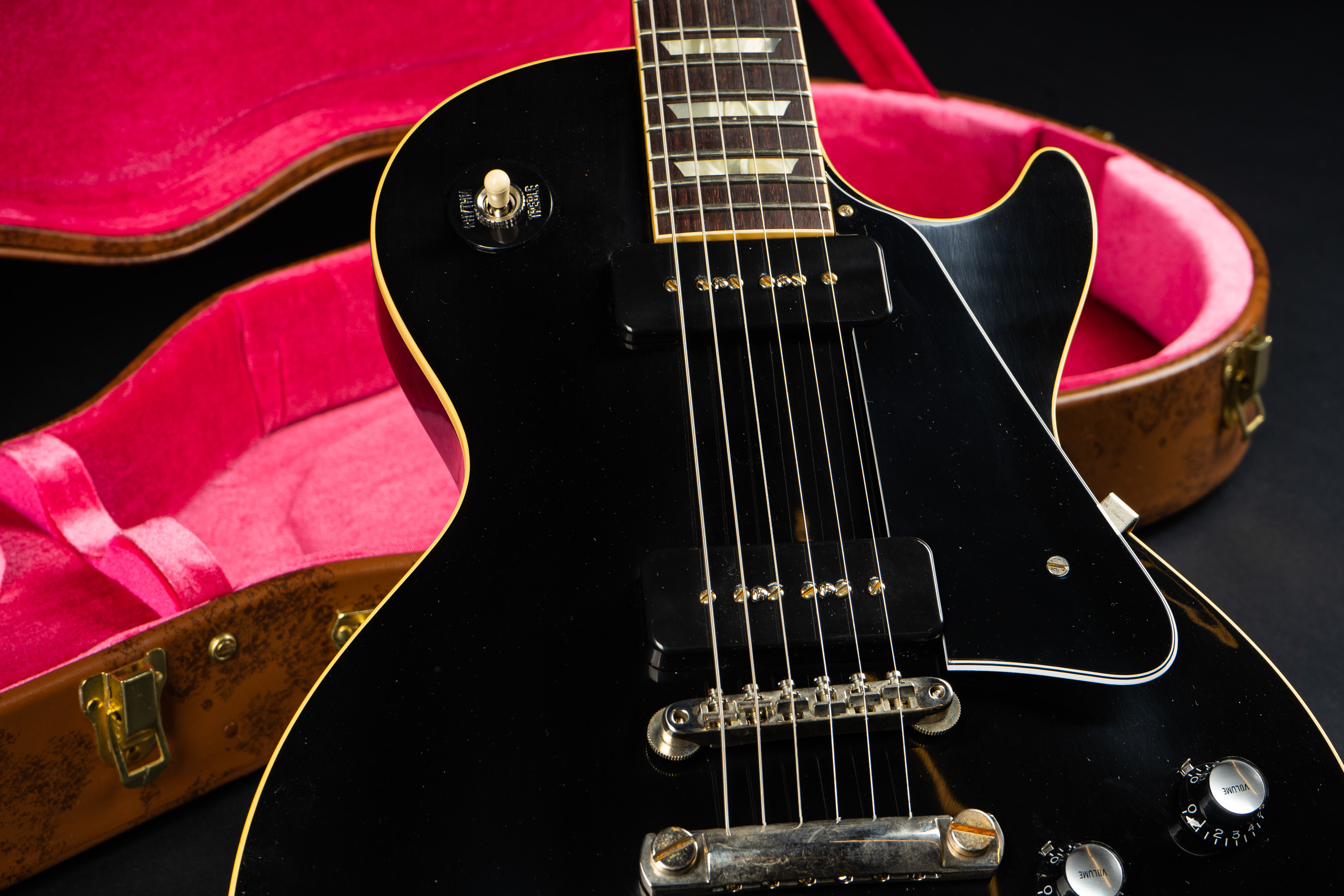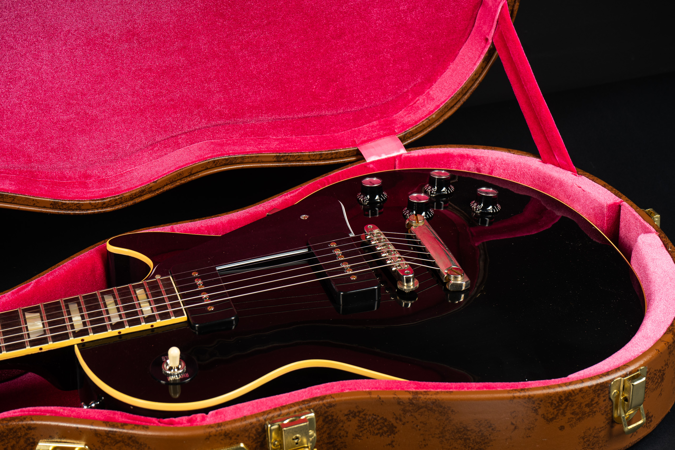 Special order to GuitarPoint specs! A full “Blackout” R6 that looks uber-cool! It’s full black, back, sides, top and neck, black P90 covers, 57 Les Paul Custom multi-ply pickguard, black pokerchip, toggle tip and black knobs with silver inserts. Typical 1956 neck but thisone comes with the taller 59 fret wire! Comes incl. original COA, case and all the papers. On top of the cake we have a nice flamed maple top under the black that shines through on different angles – how cool ist that?