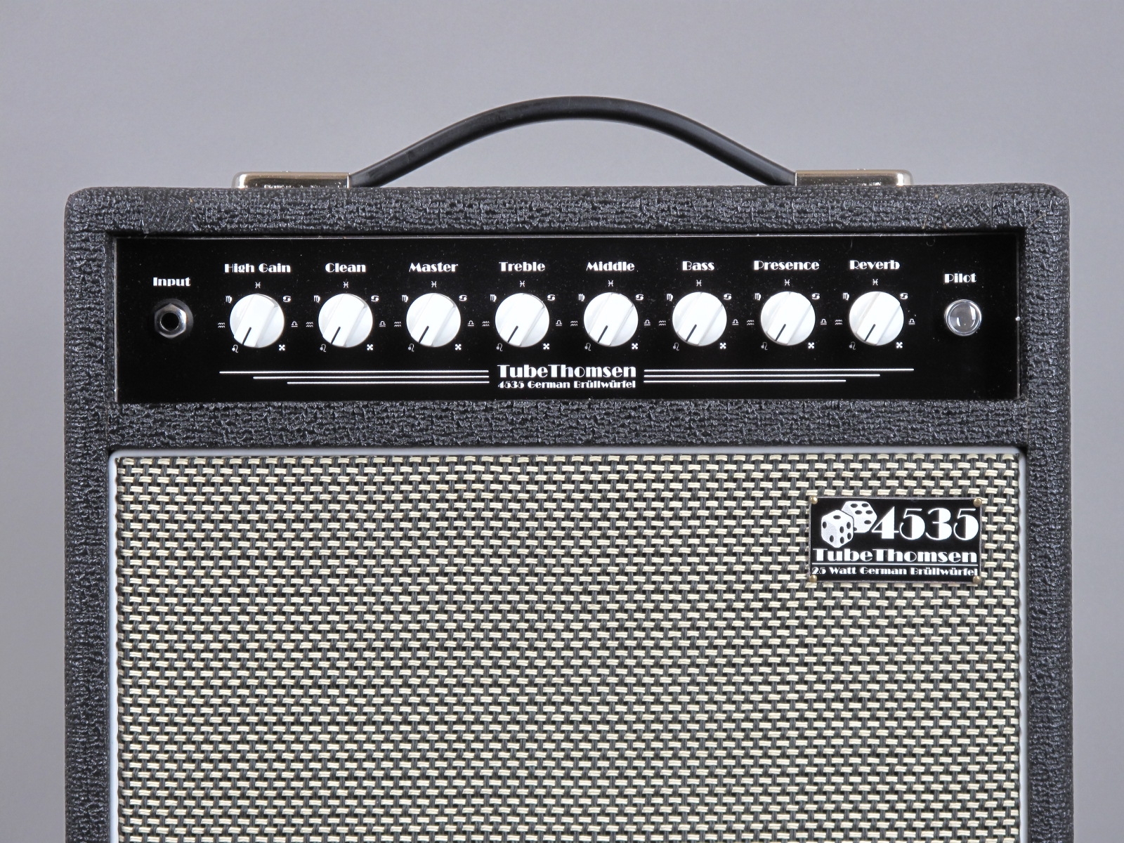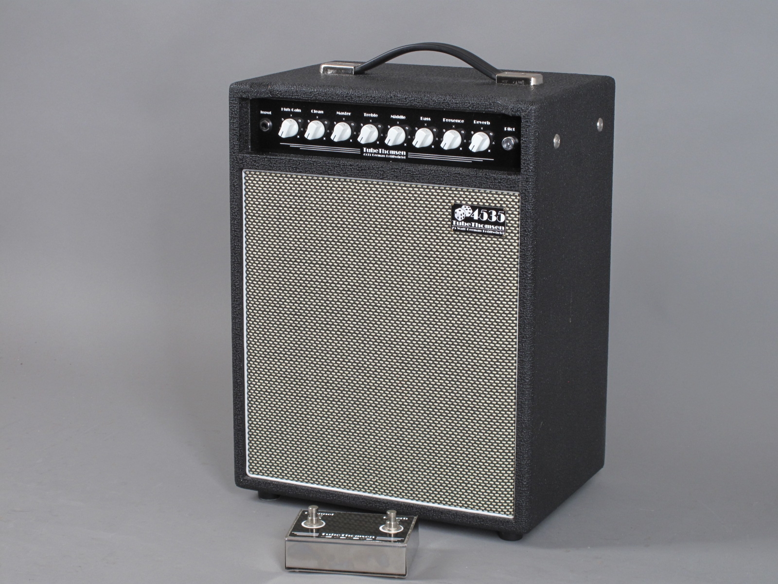 Rare Tube Thomsen 4535 German "Brüllwürfel" in excellent condition, only the footswitch shows little wear. Small and light weight all-tube guitar amplifier with two chanels. 25-Watt Class-A single-ended, great for small gigs or home-Recording, amazing sounds when hooked up to a 4×12" cab! All 4535 are handbuild and "Point to Point" handwired. Small dimensions (H: 45 x B: 35 x T: 25 cm) and lightweight (ca. 14Kg)